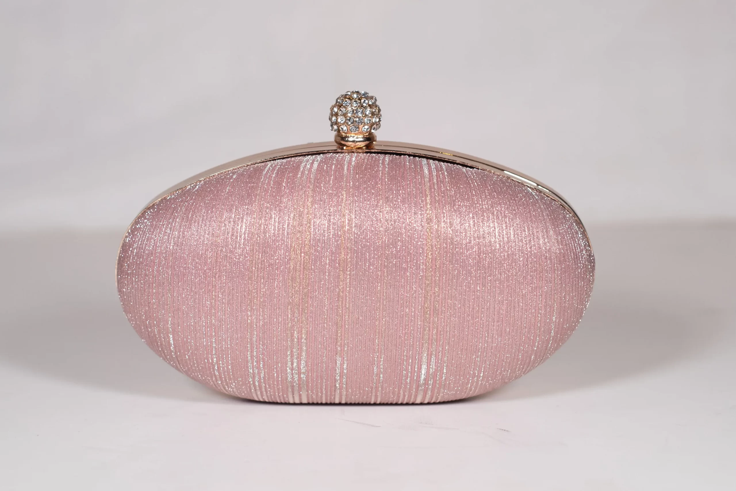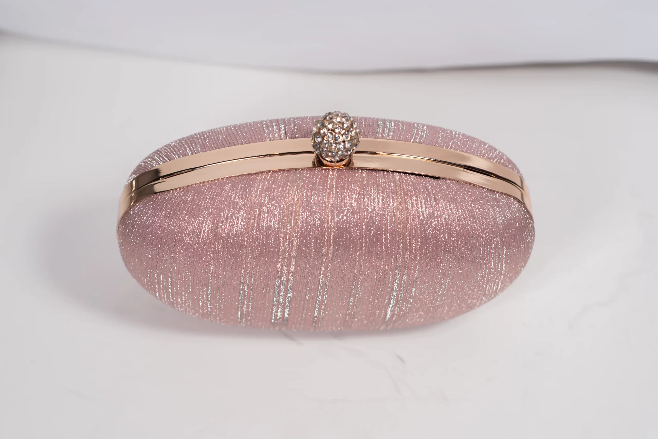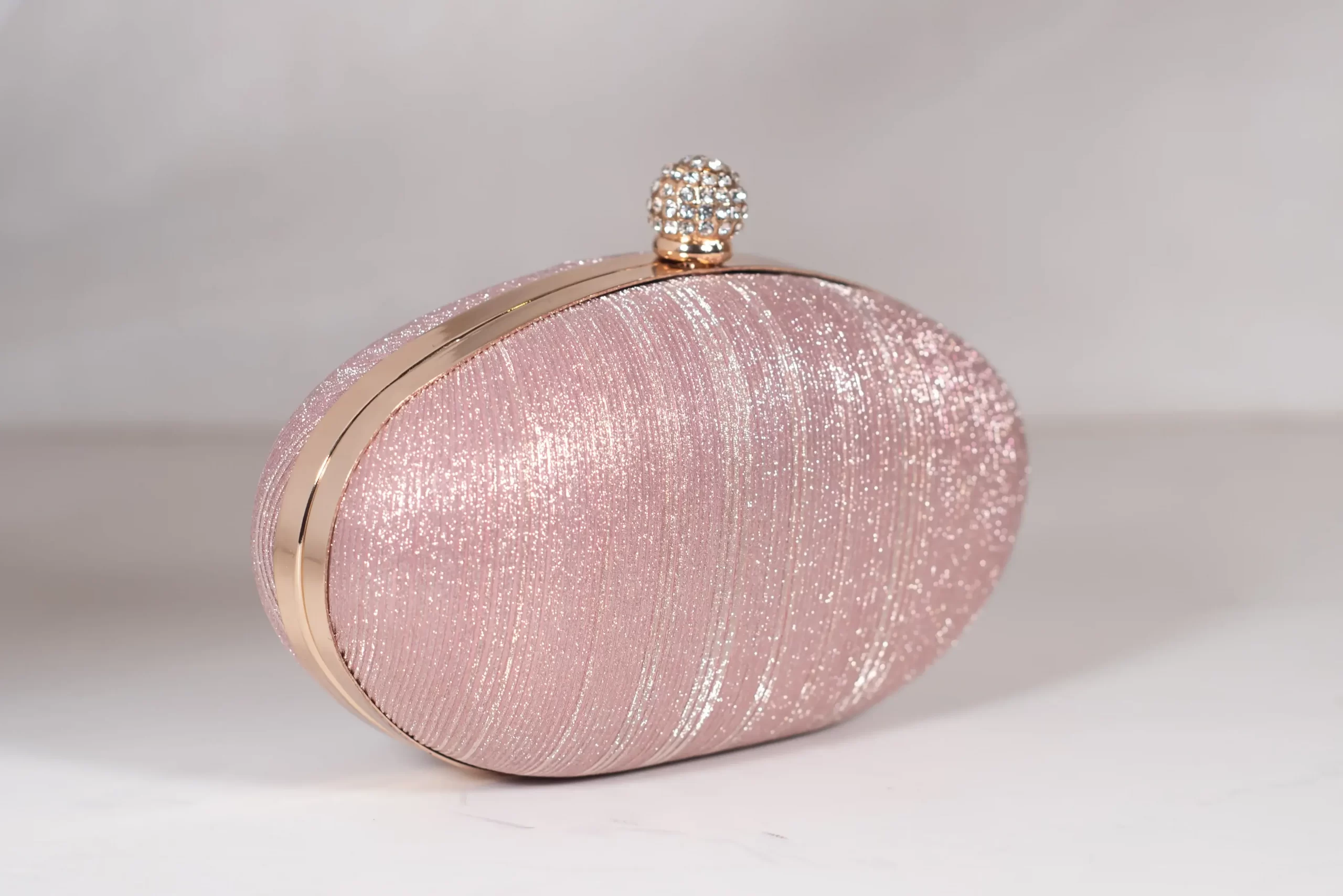 Alluring shimmery blushing bride pink embellished clutch with minor tints of gold and silver. Includes interlocking clasp, gold-based chain and satin interior along with an embellished decorated knob.