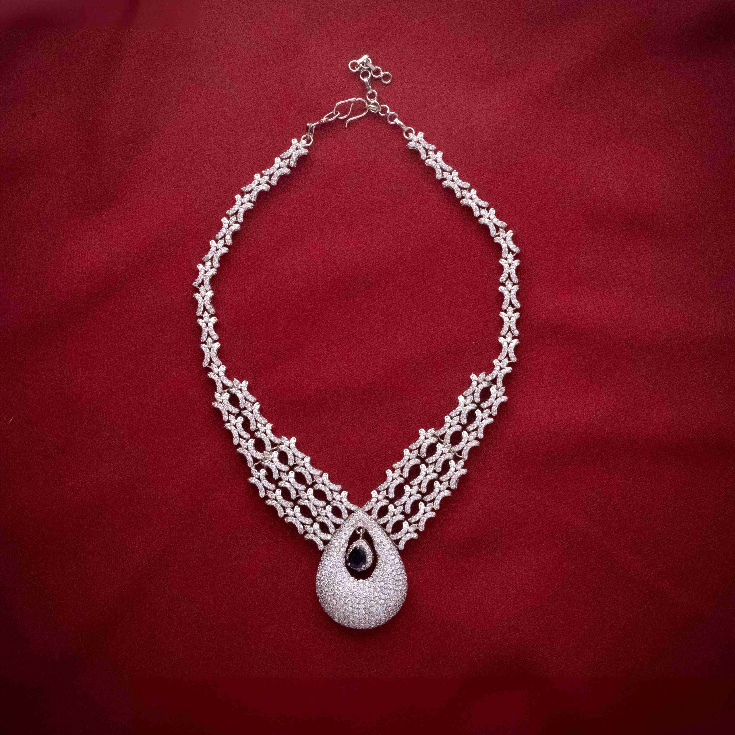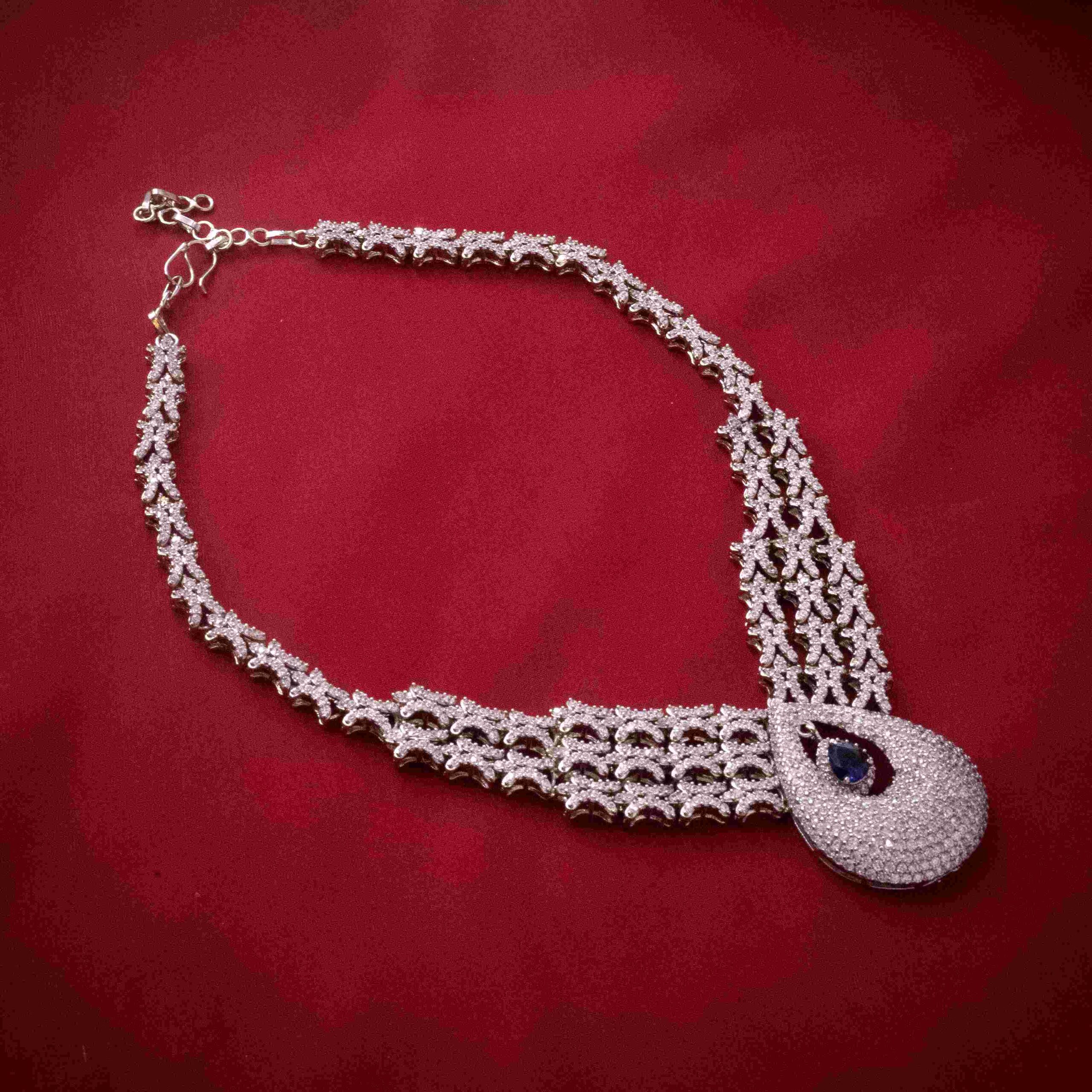 Silver-plated handworked necklace finely embellished with real american zircon stones with center sapphire stones.