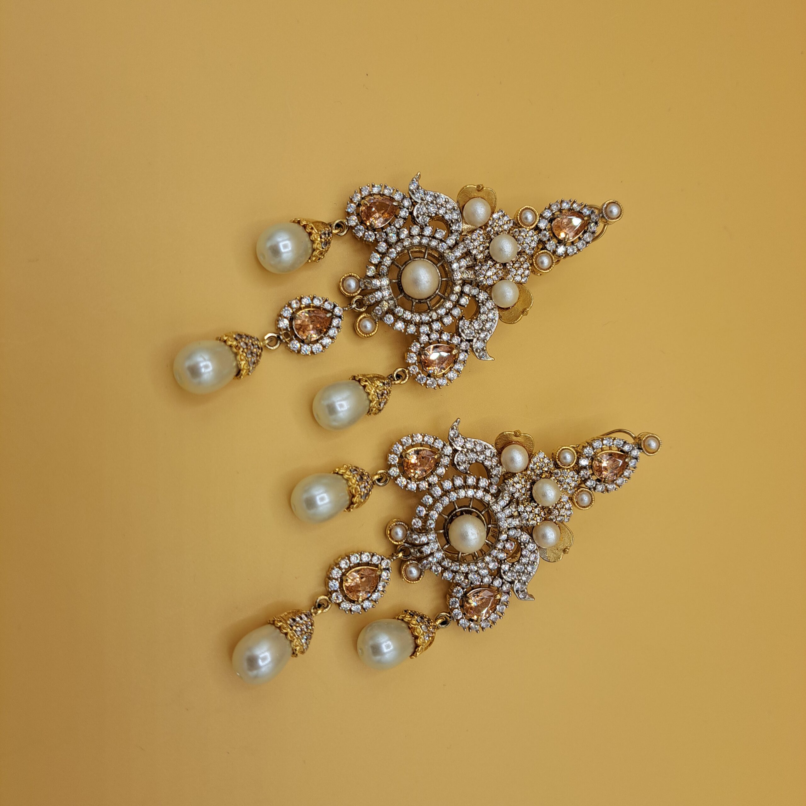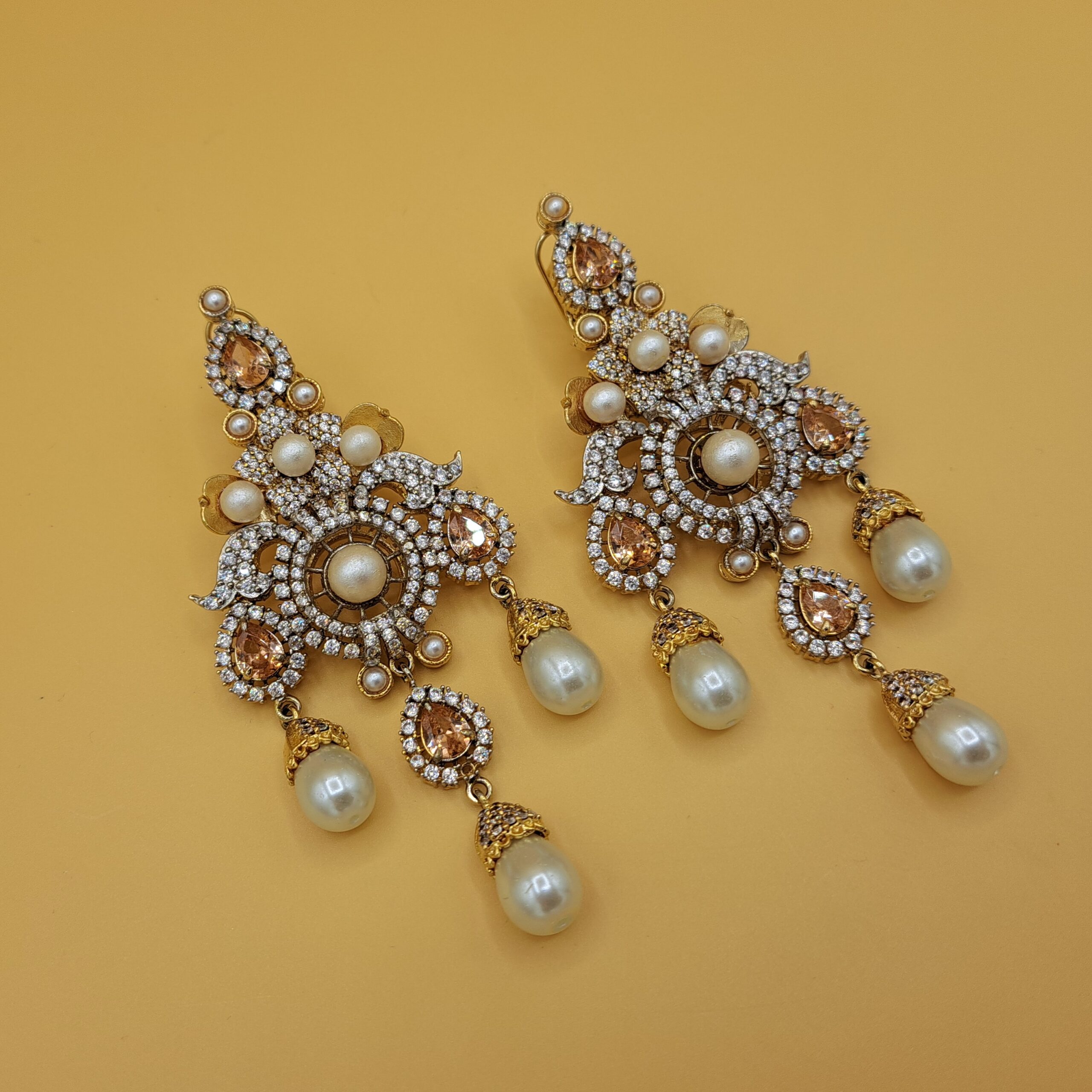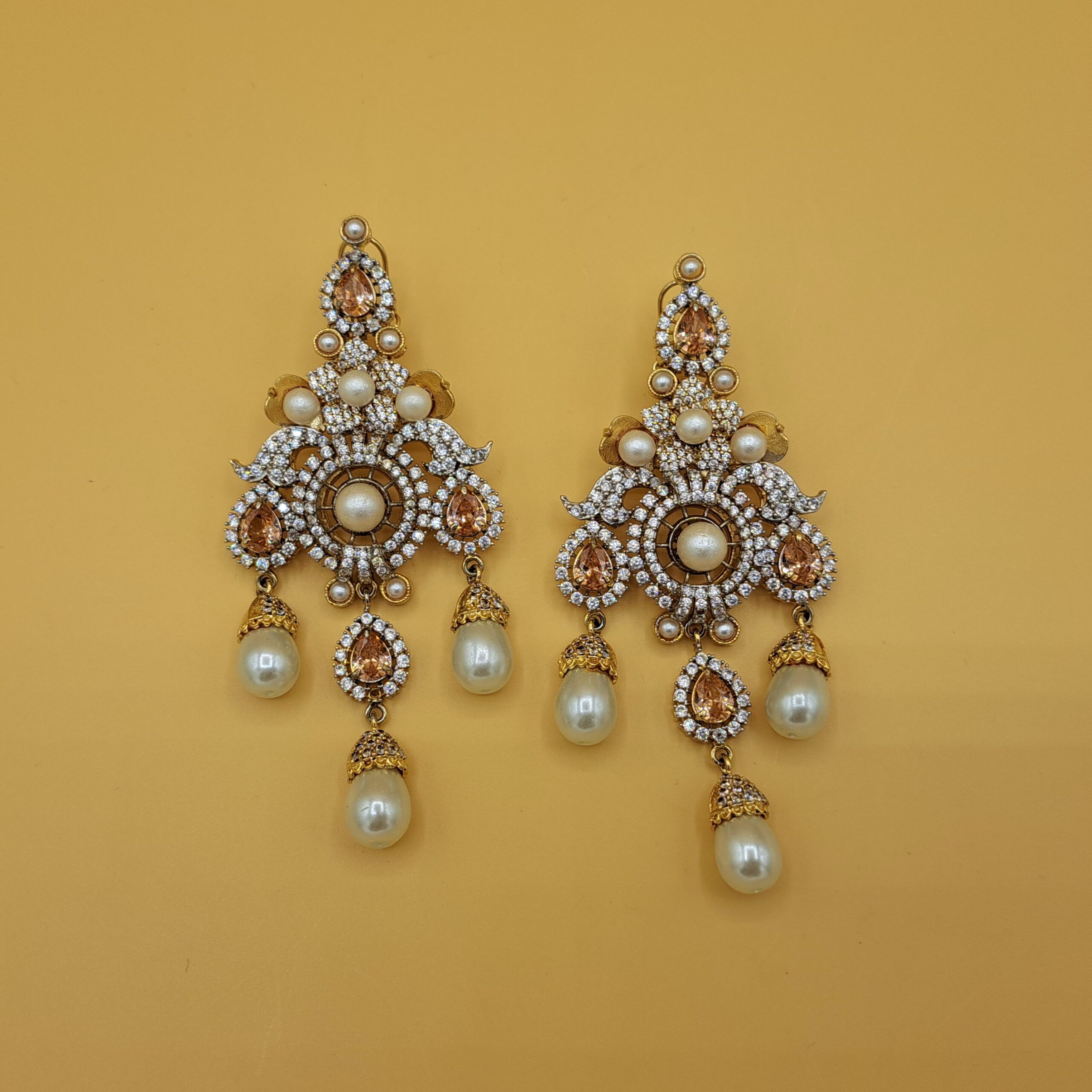 Silver-plated earrings embedded with real american zircon stones and champagne zircon stones along with pearl drop embellishments.
