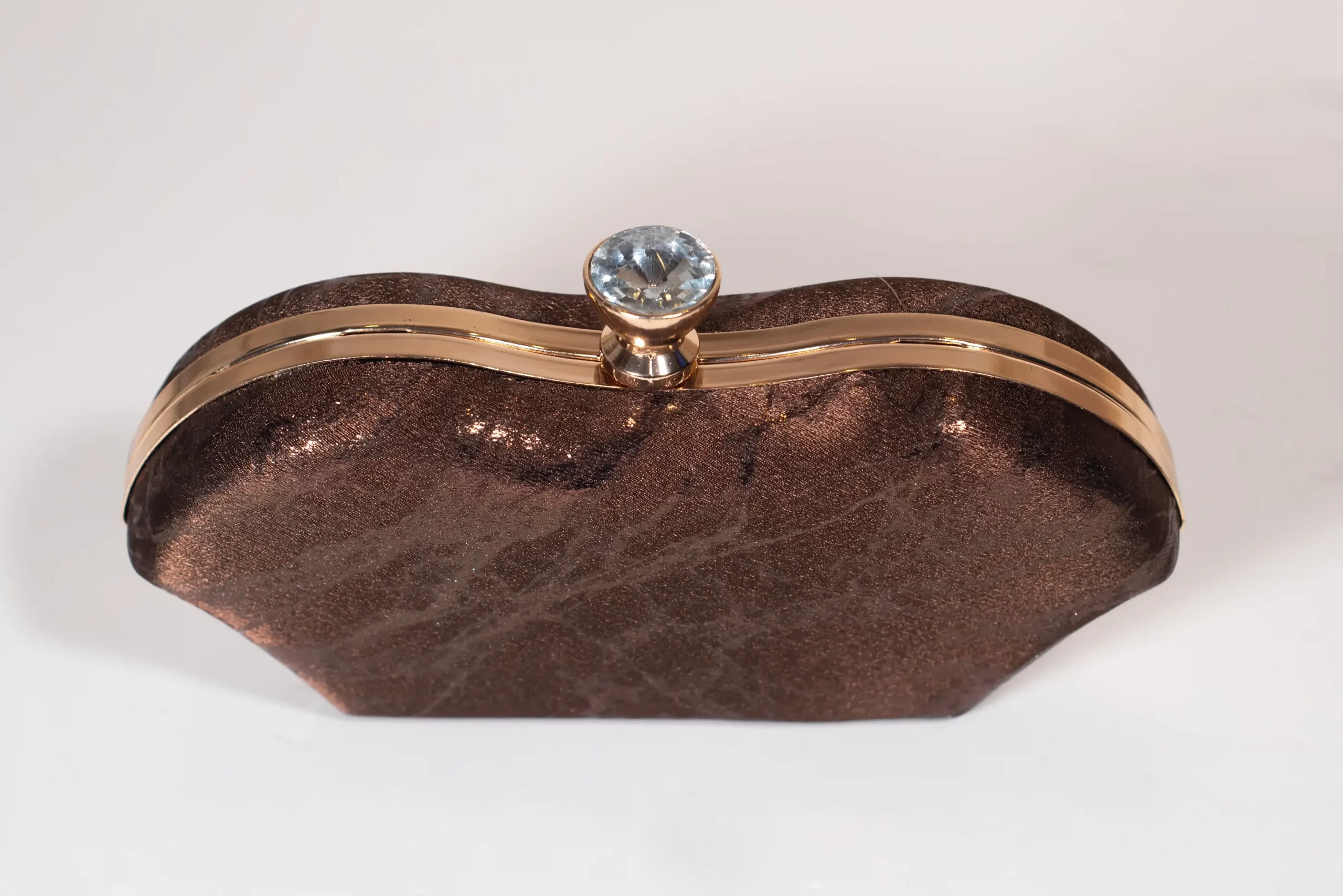 Alluring textured matte brown shaded embellished clutch with an interlocking clasp, gold-based chain and satin interior along with a decorated knob.