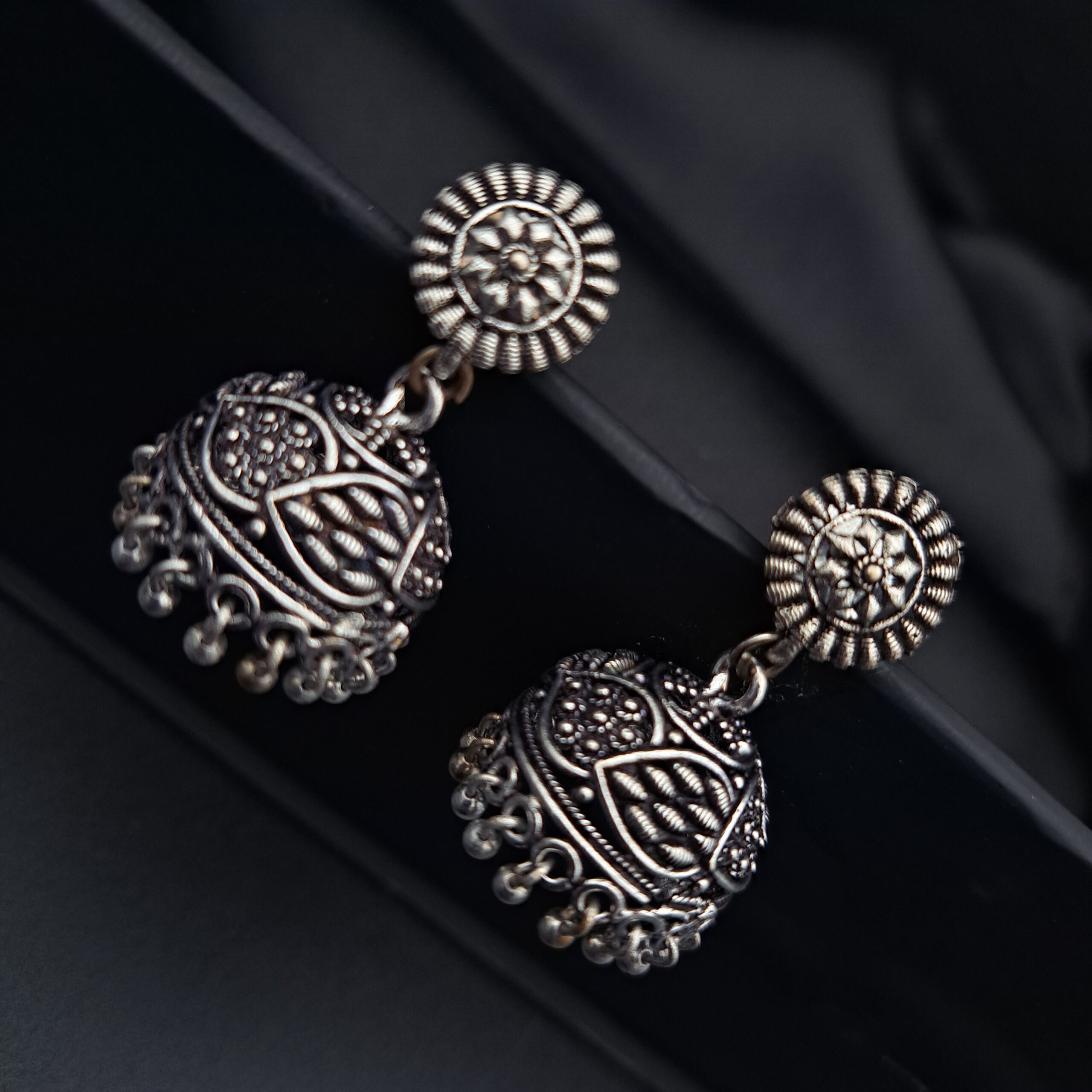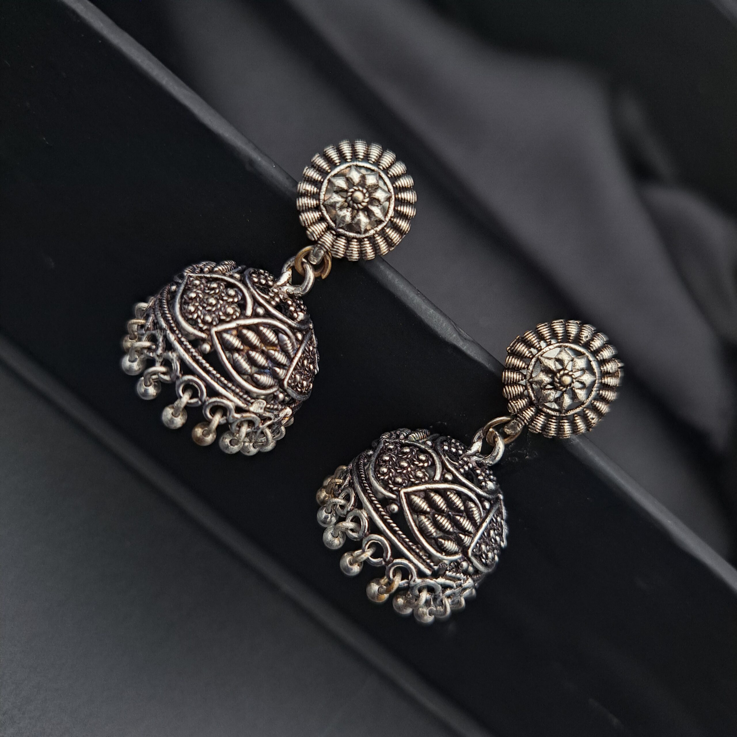 Elevate your everyday look with these detailed, silver-toned drops. The small, swinging bells are heavily textured with traditional motifs, complementing the ornate sunburst stud.
