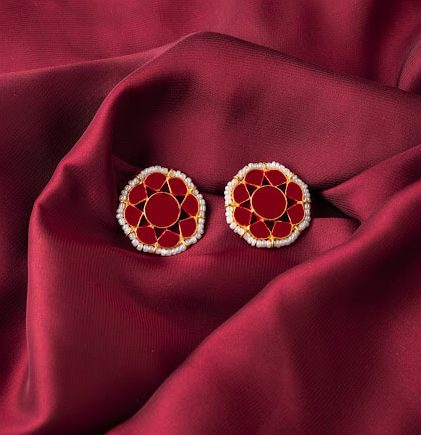 Gold-plated Sheesha Kundan studs embossed with meena embellished stones along with natural pearls finishing.