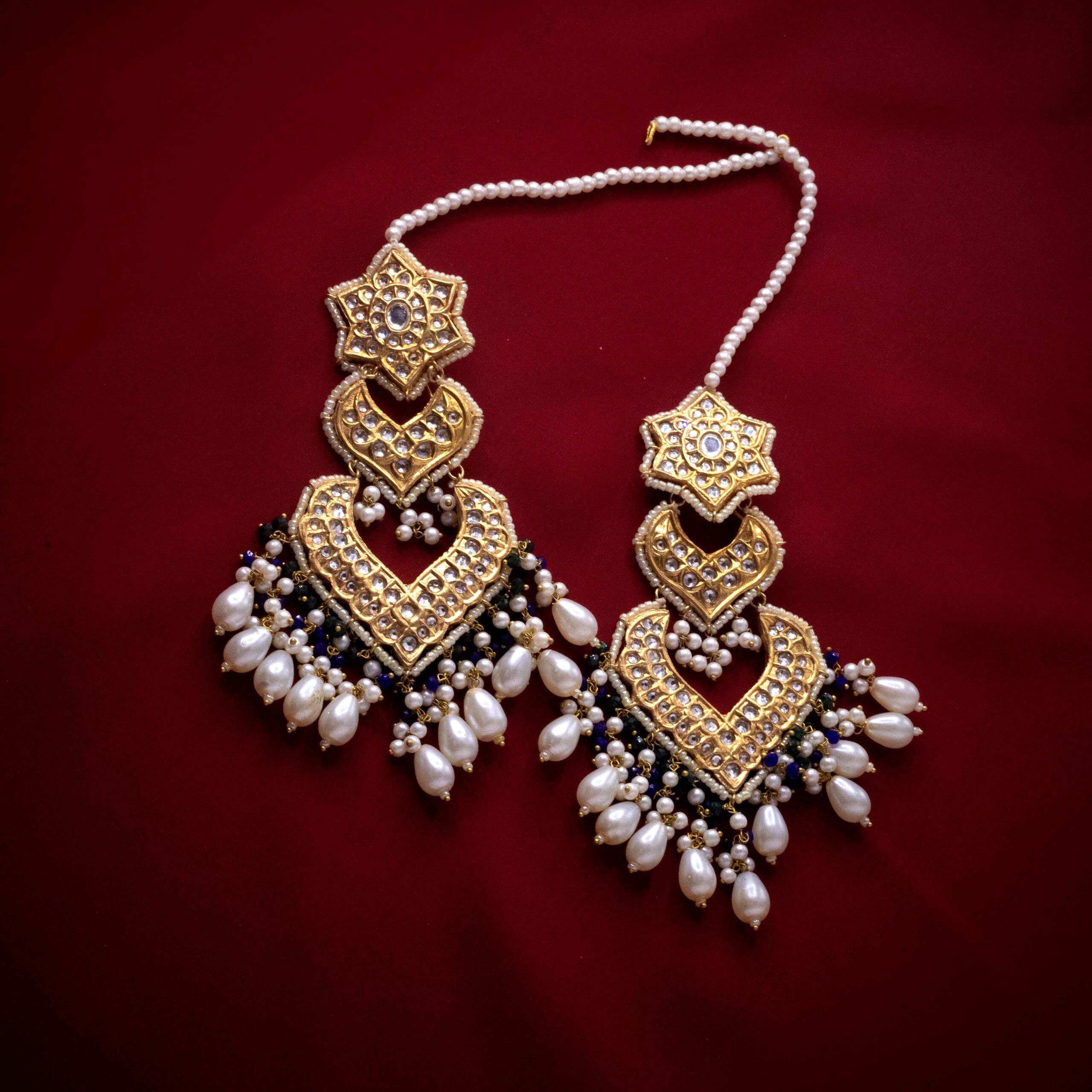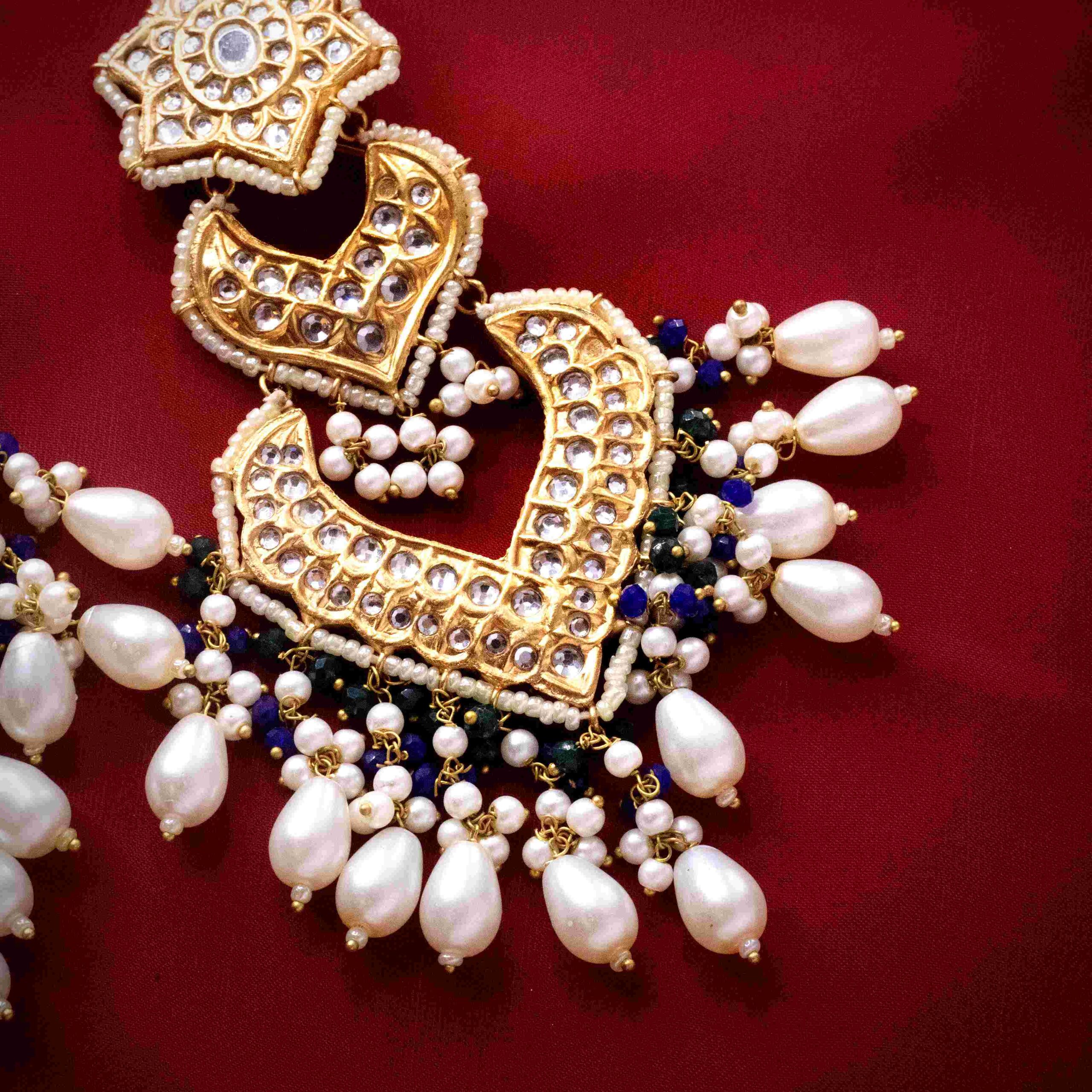 - Gold-plated thappa kundan earrings finely embedded with kundan stones and embellished with crystal emerald and blue pearls, along with natural pearls drops.