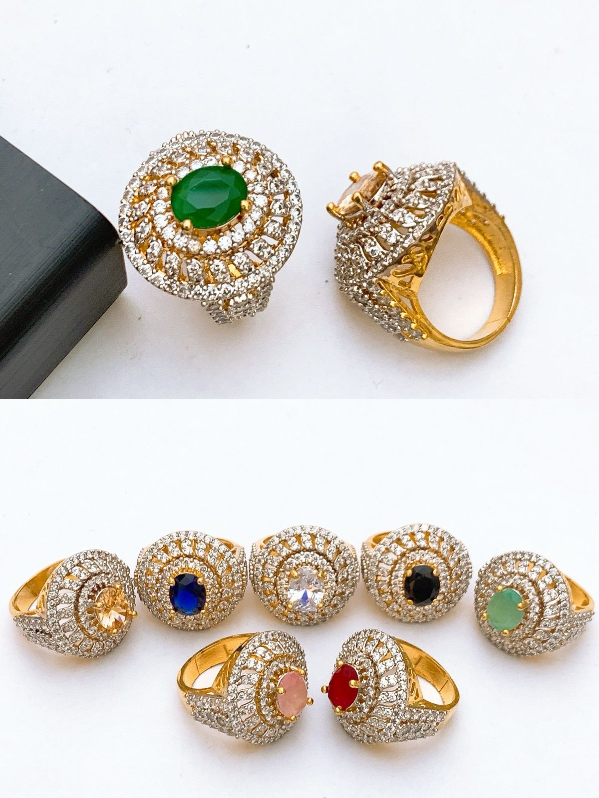 Alluring piece of gold-plated ring finely embellished with real zircon stones and customised semi-precious centre stones.