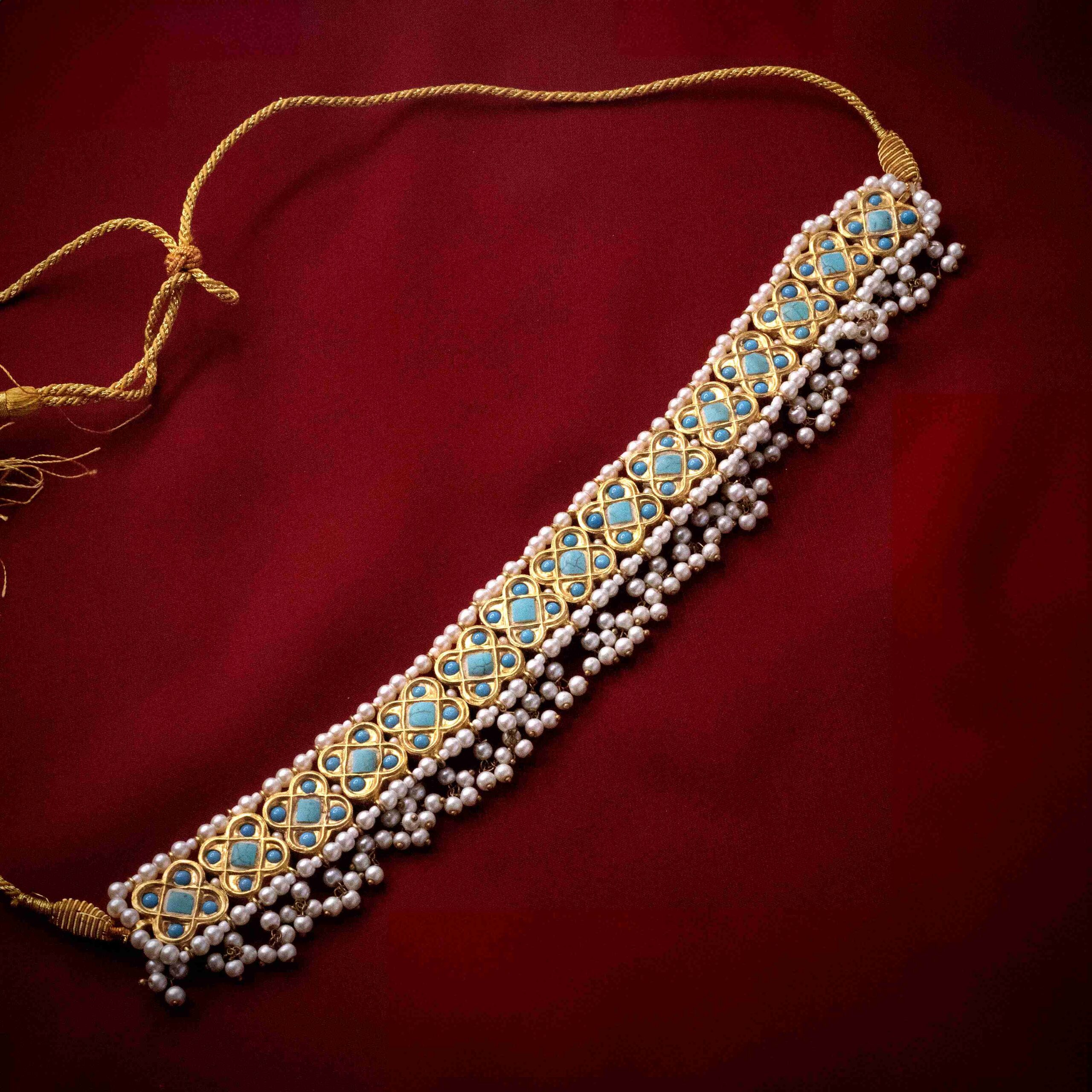 • Gold-plated handworked thappa kundan necklace finely embedded with ferozi stones and natural pearls.