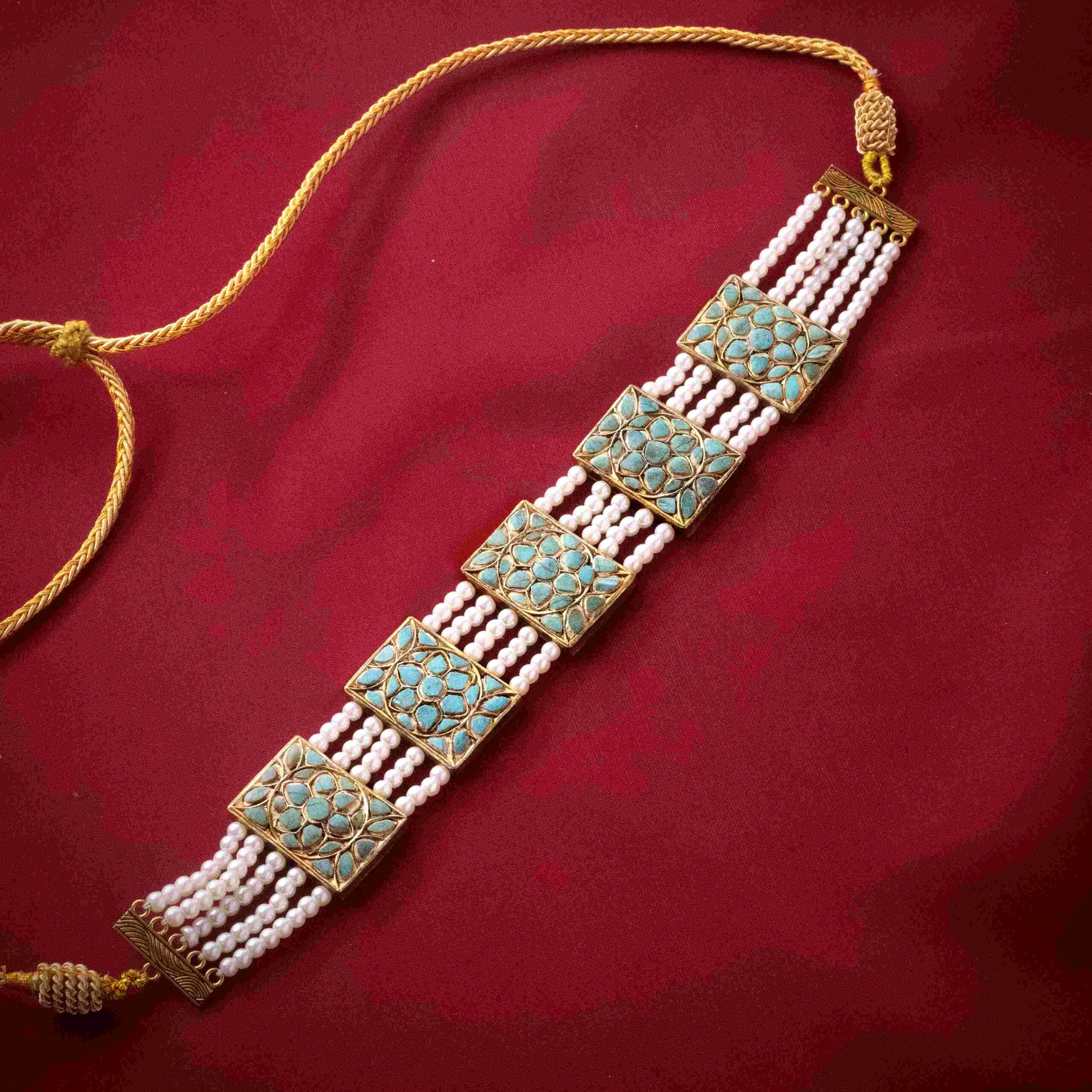 • Gold-plated handworked thappa kundan pearl necklace finely embedded with ferozi stones along with pearls embellishments.