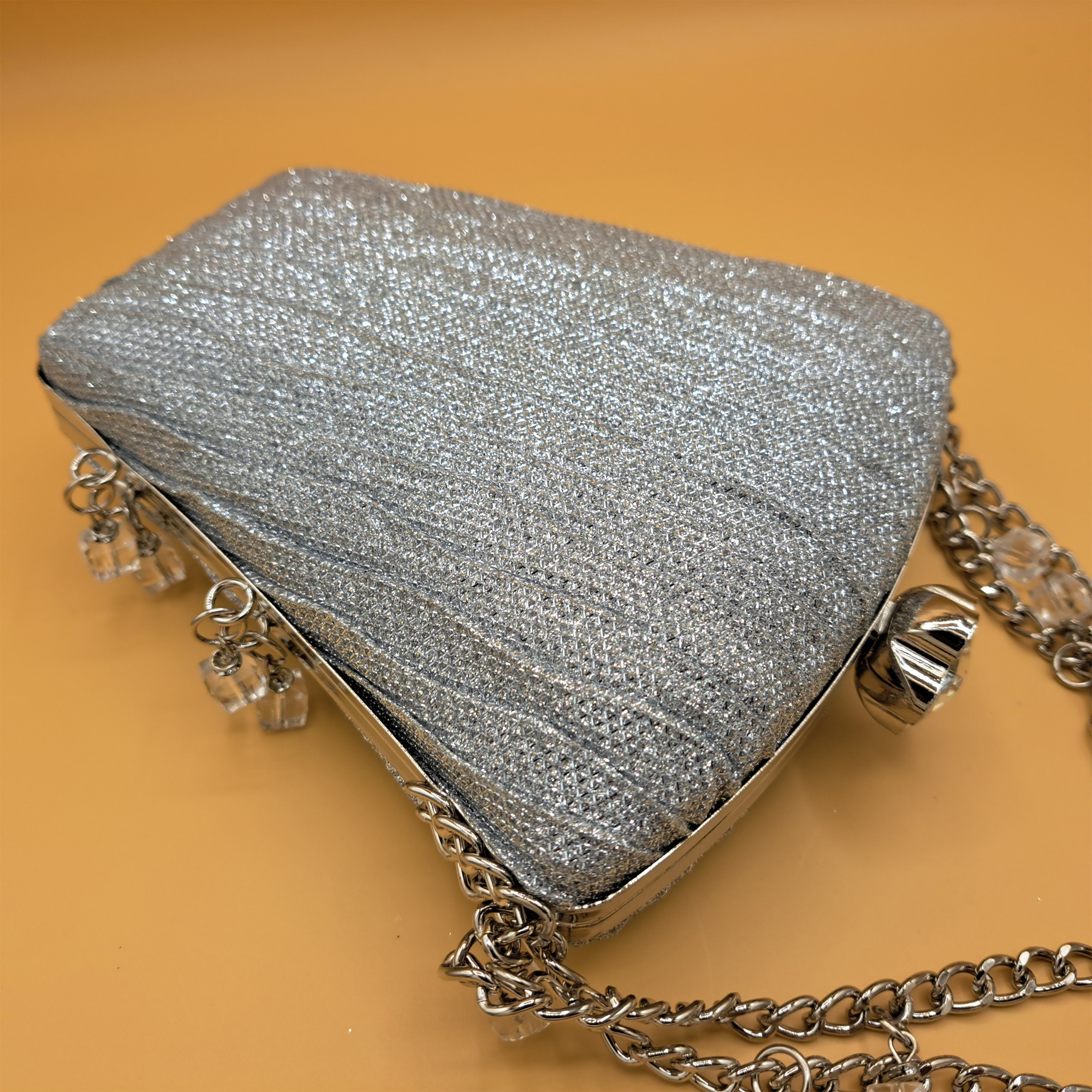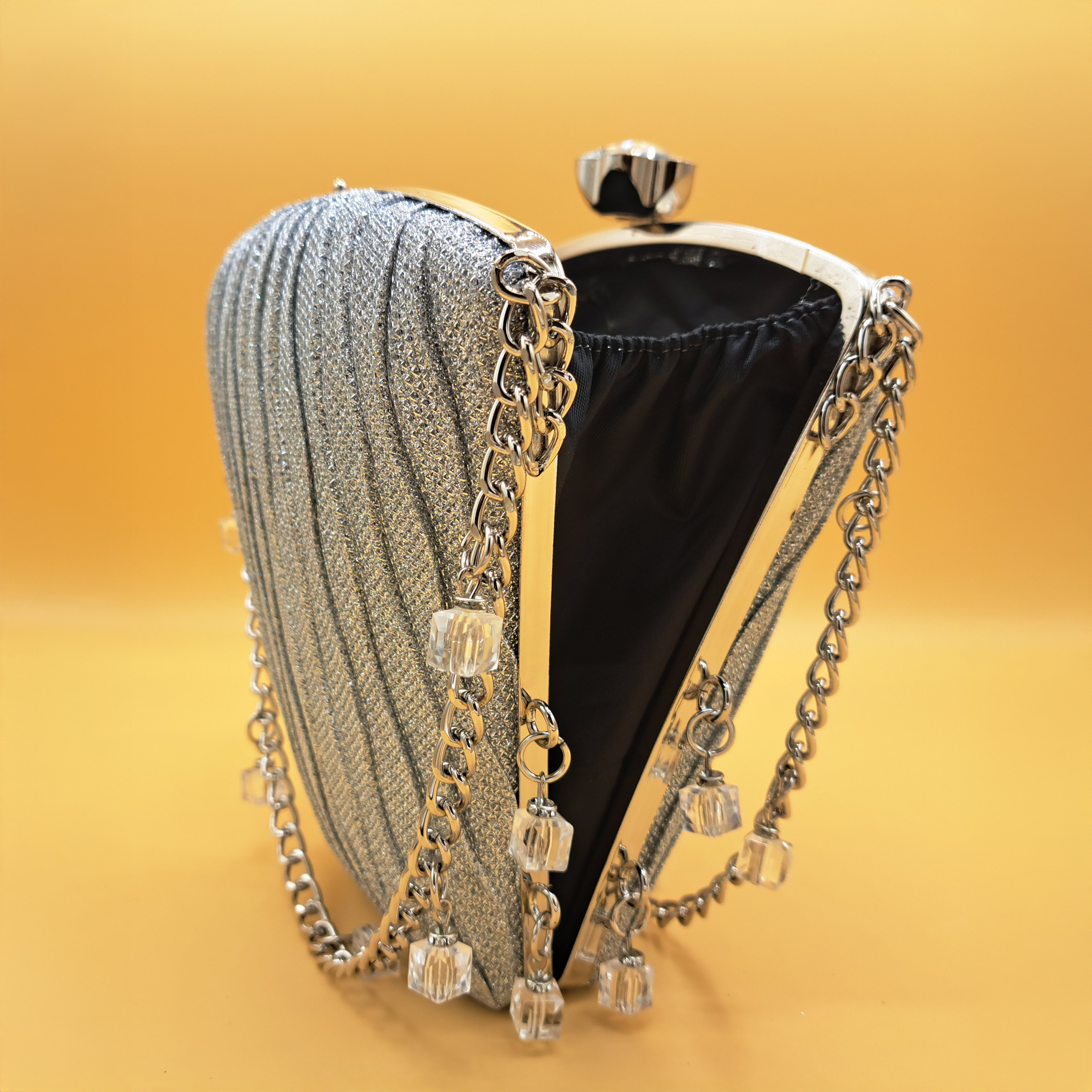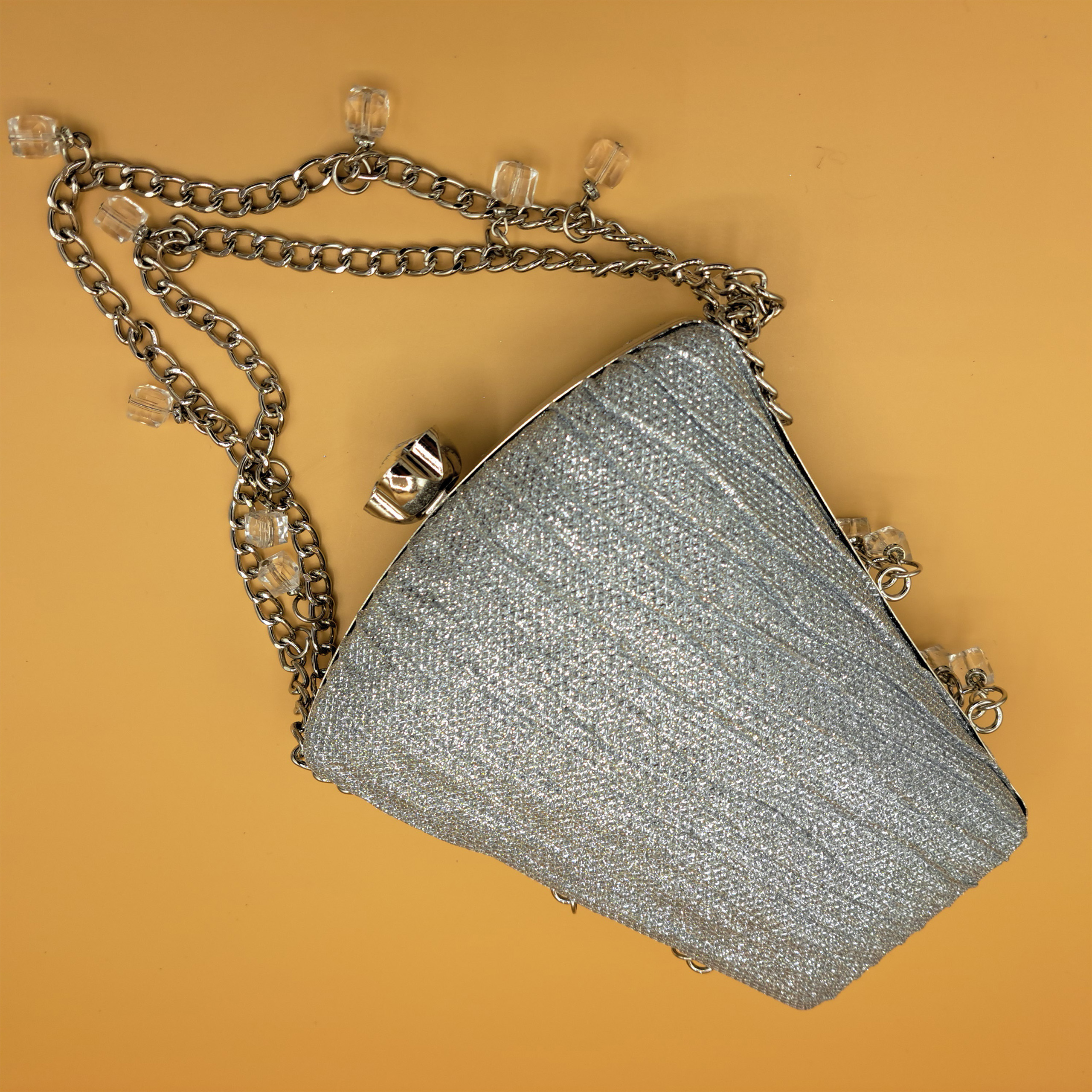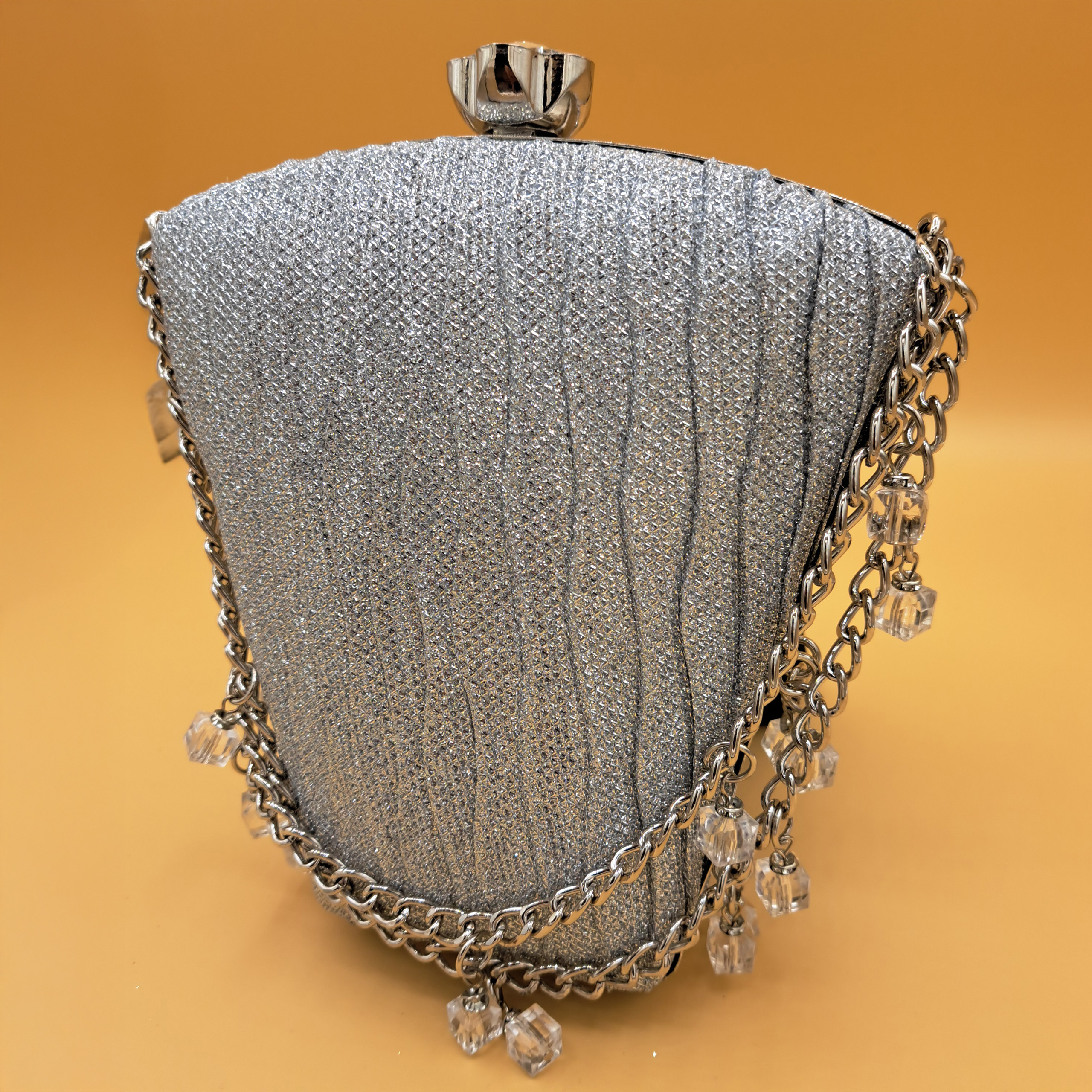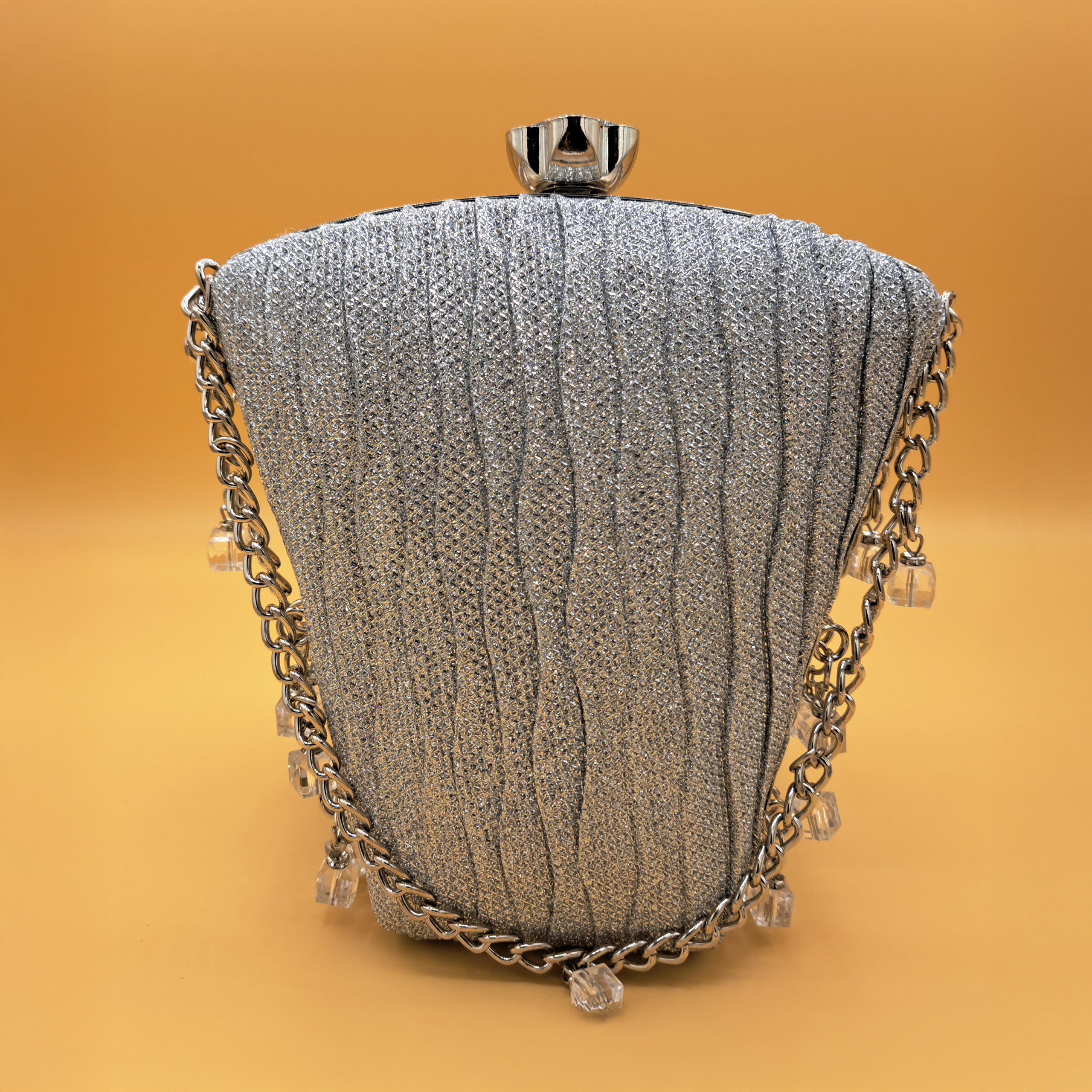 Materials: Glittered pleated fabric, silver-toned metal frame, chain strap, and crystal charms.