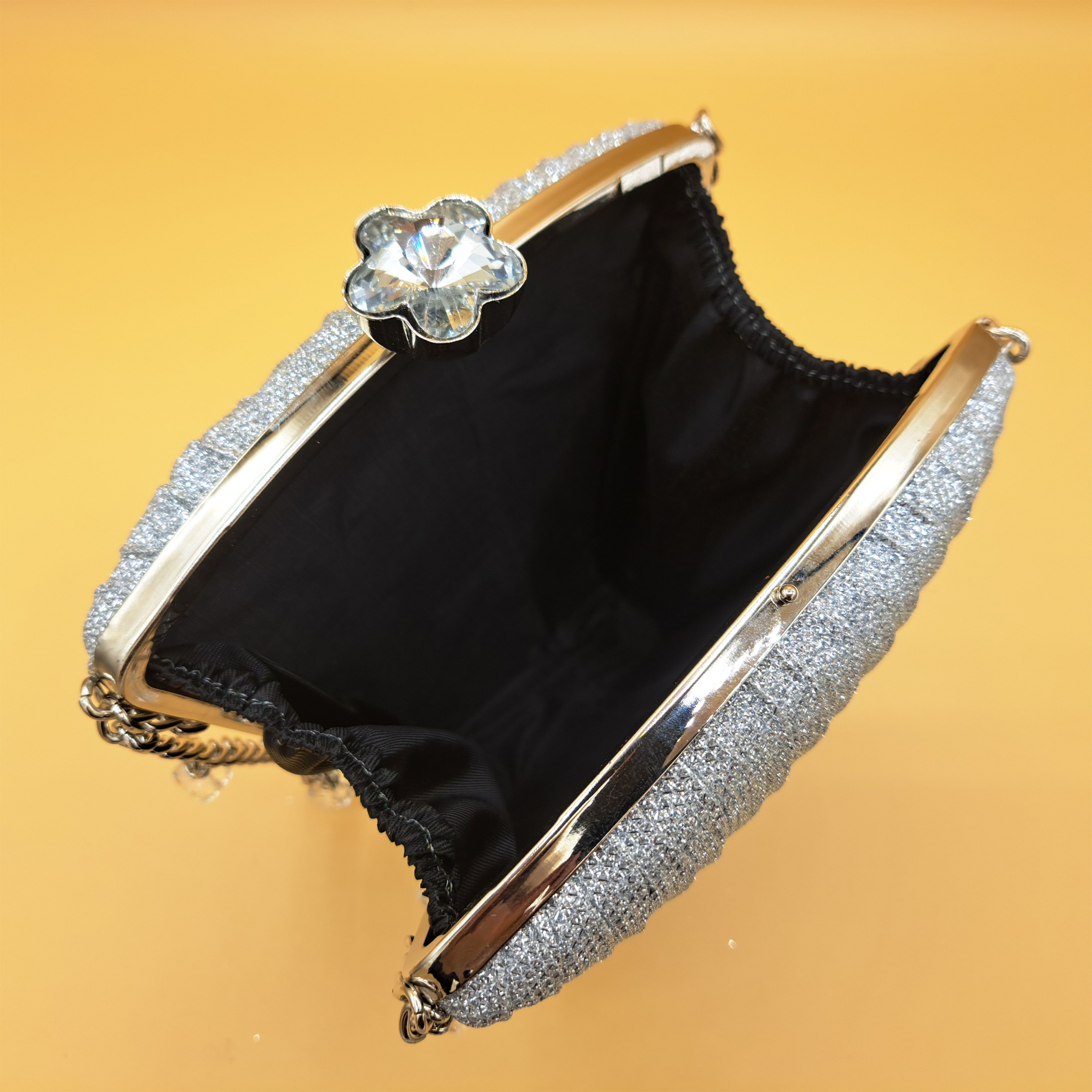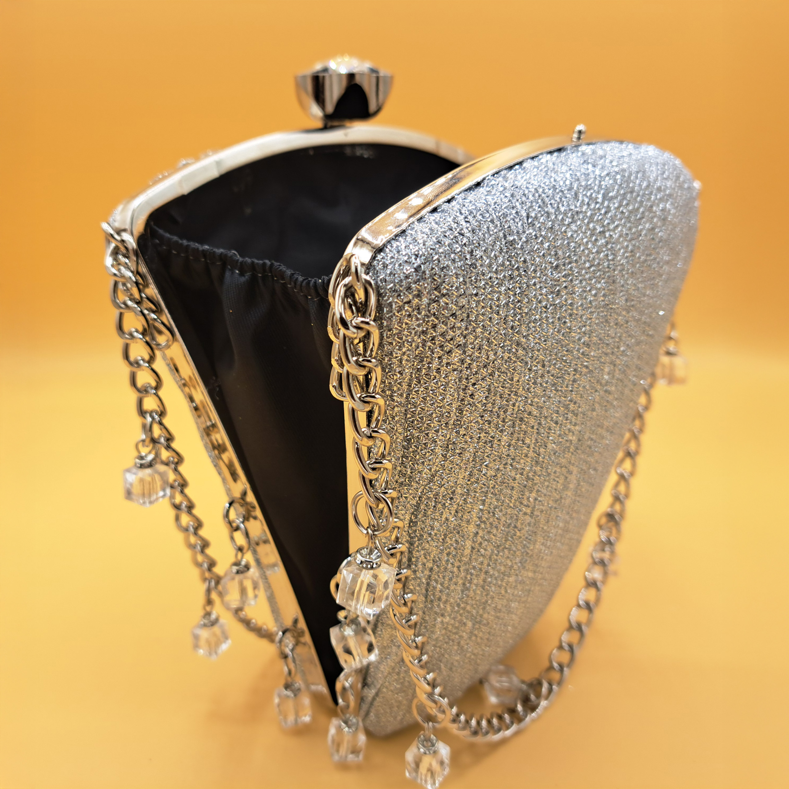 Make a dazzling entrance with this striking silver clutch, designed to infuse your evening attire with sophistication and sparkle.