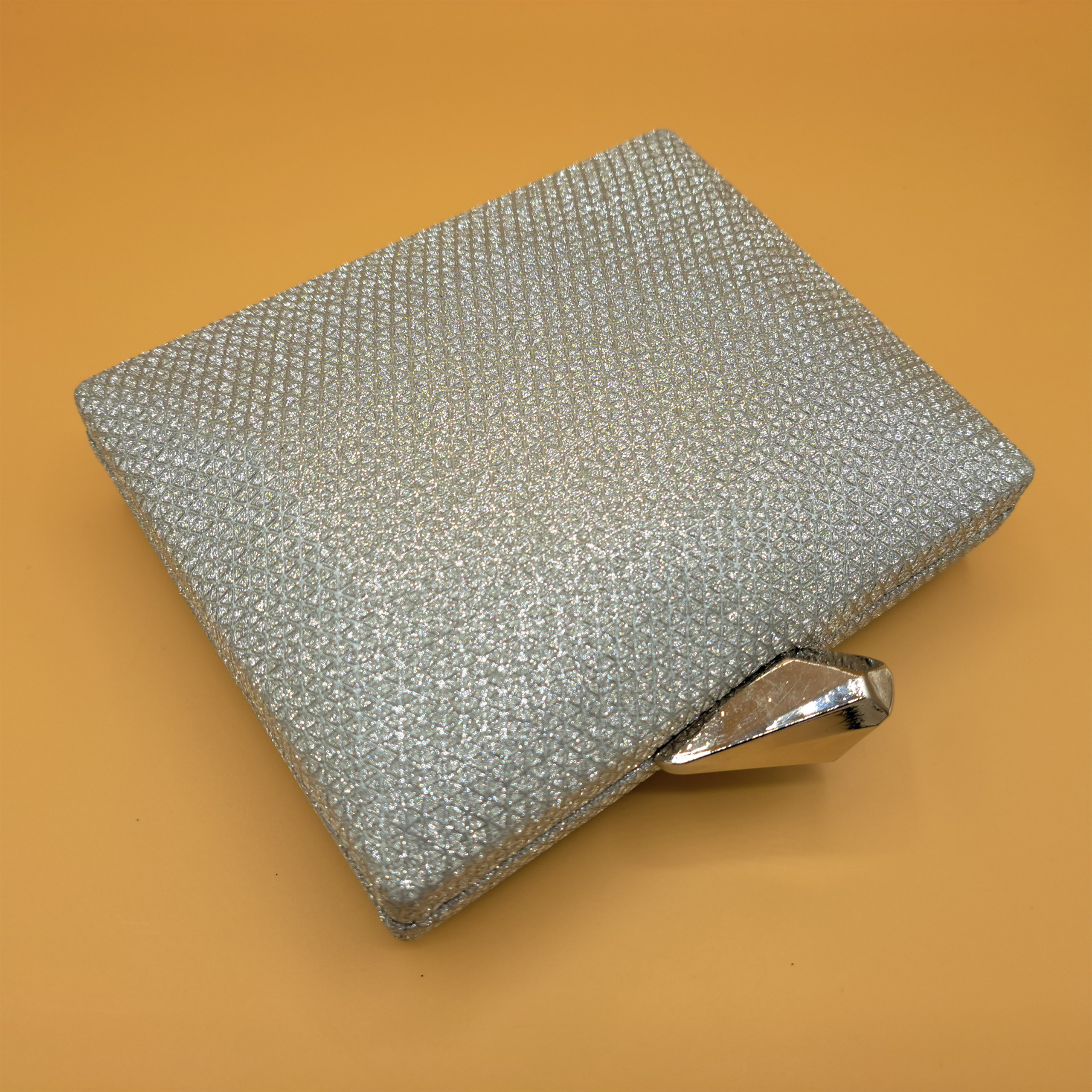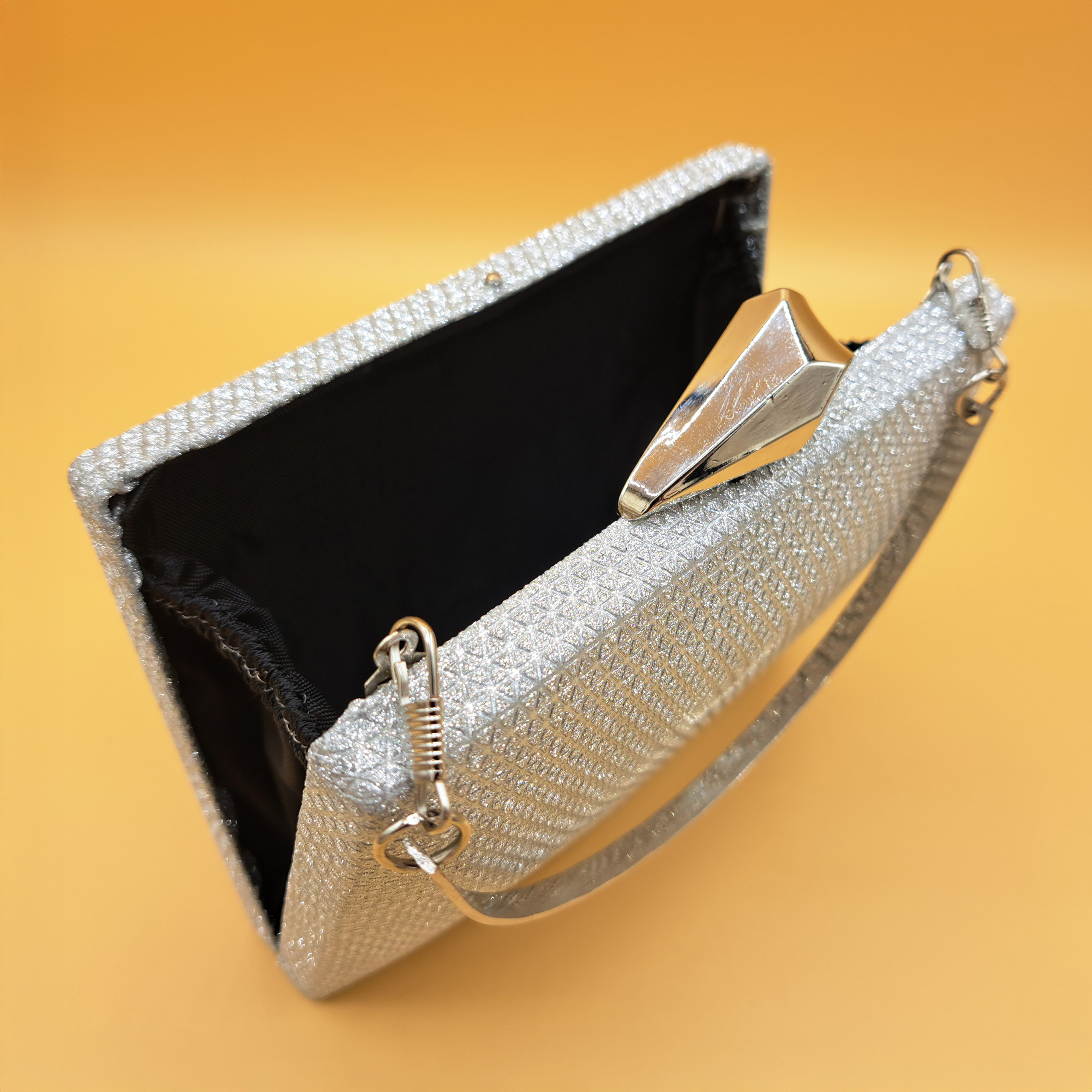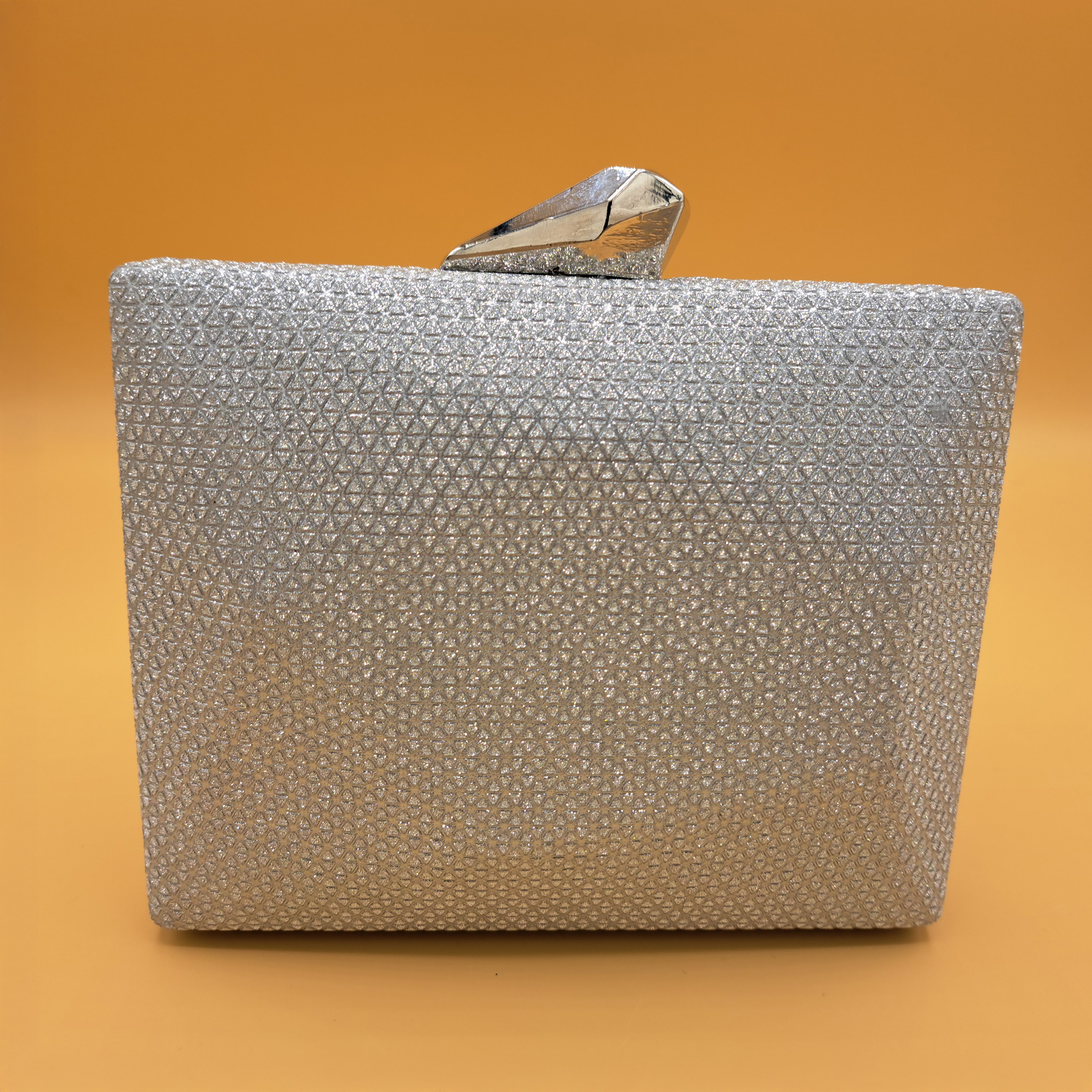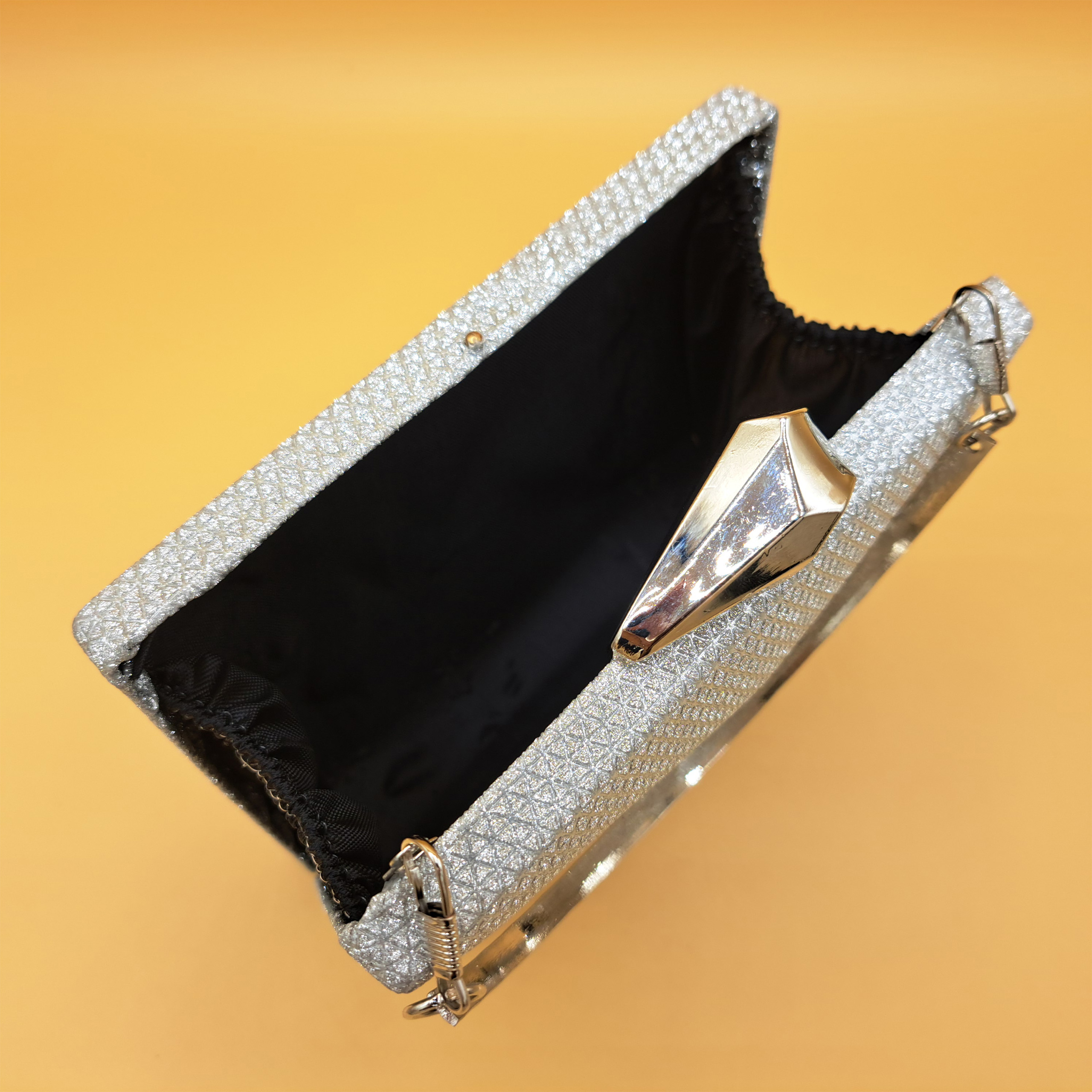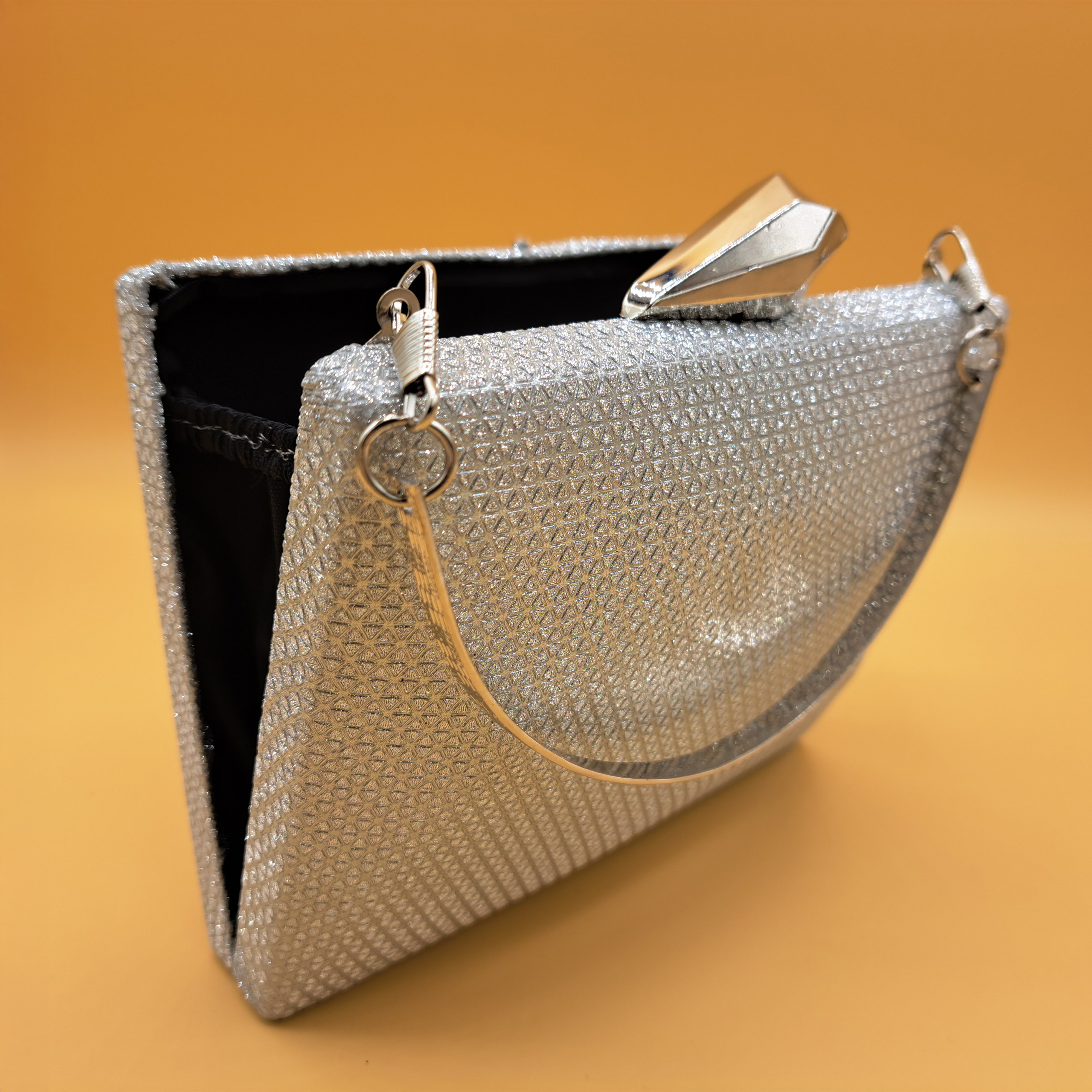 This clutch features a structured rectangular body. The exterior is crafted from a glittering silver fabric with a geometric, diamond-like quilted pattern.