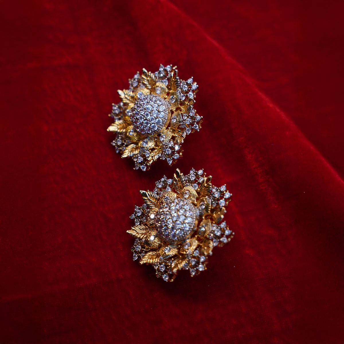 Exquisitely hand-carved gold-plated earrings with a silver-toned frame meticulously detailed with real American zircon stones and intricate, gold-toned leaf.