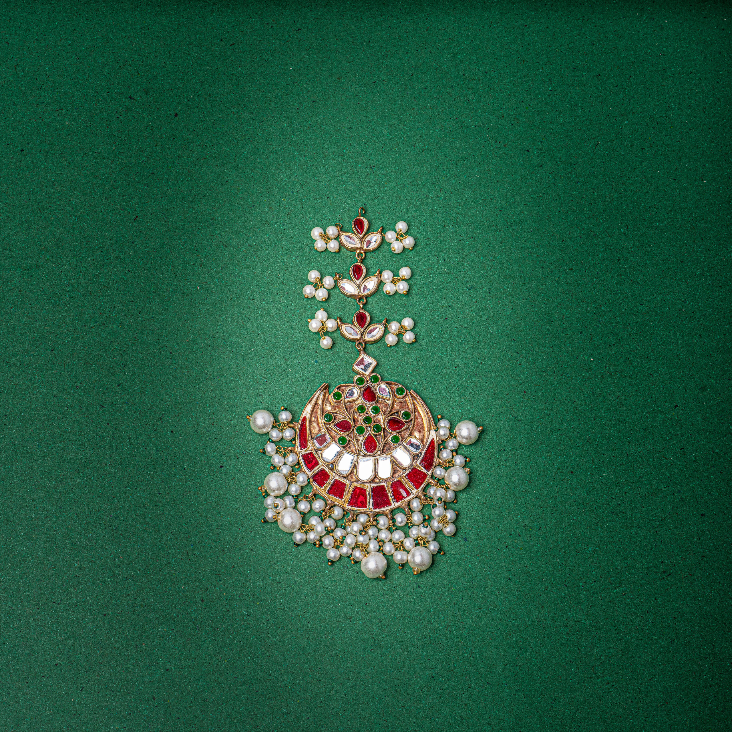 Description: Gold-Plated sheesha kundan bindia embellished with ruby stones, fineĀ  kundan stones and natural pearls.