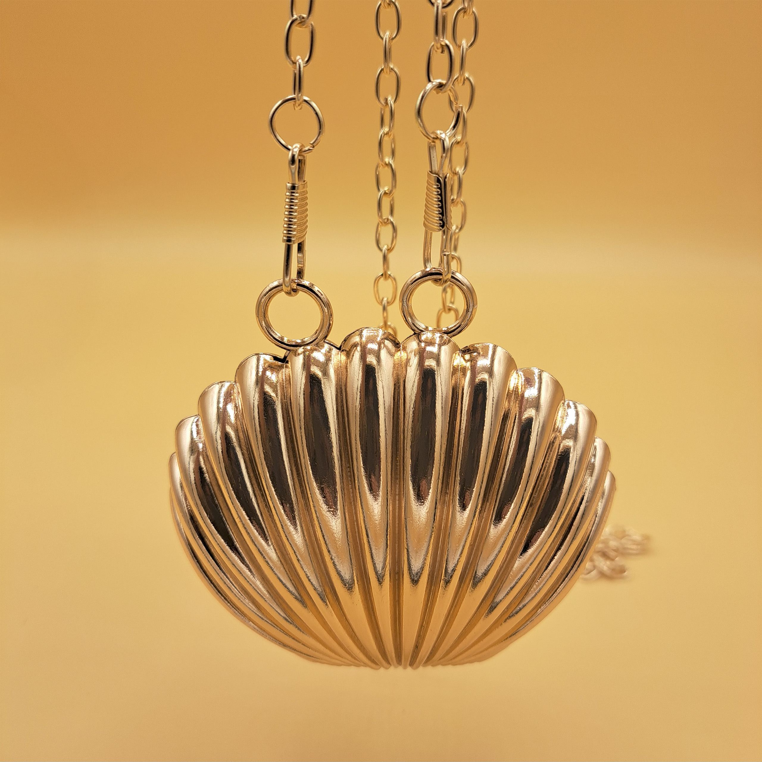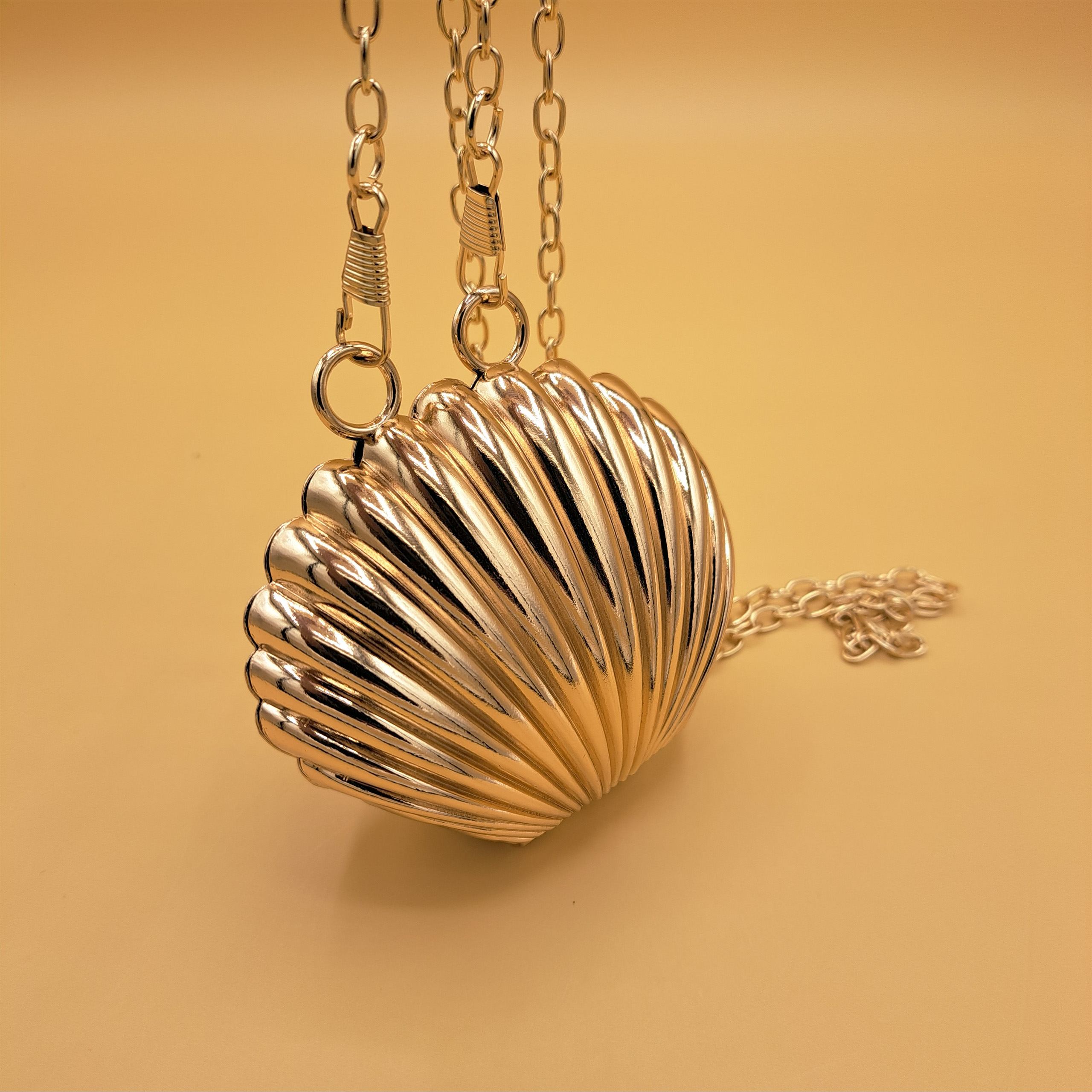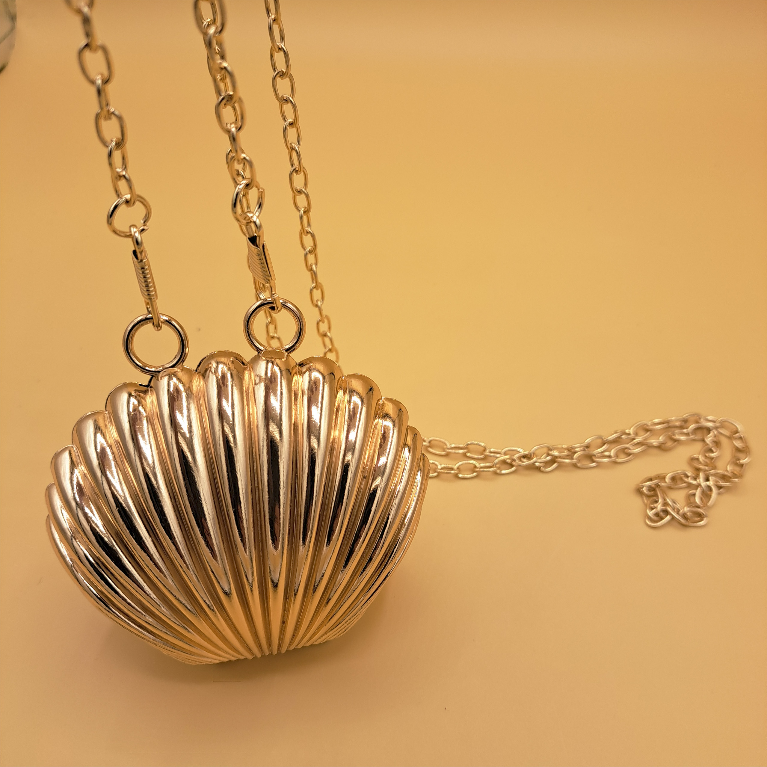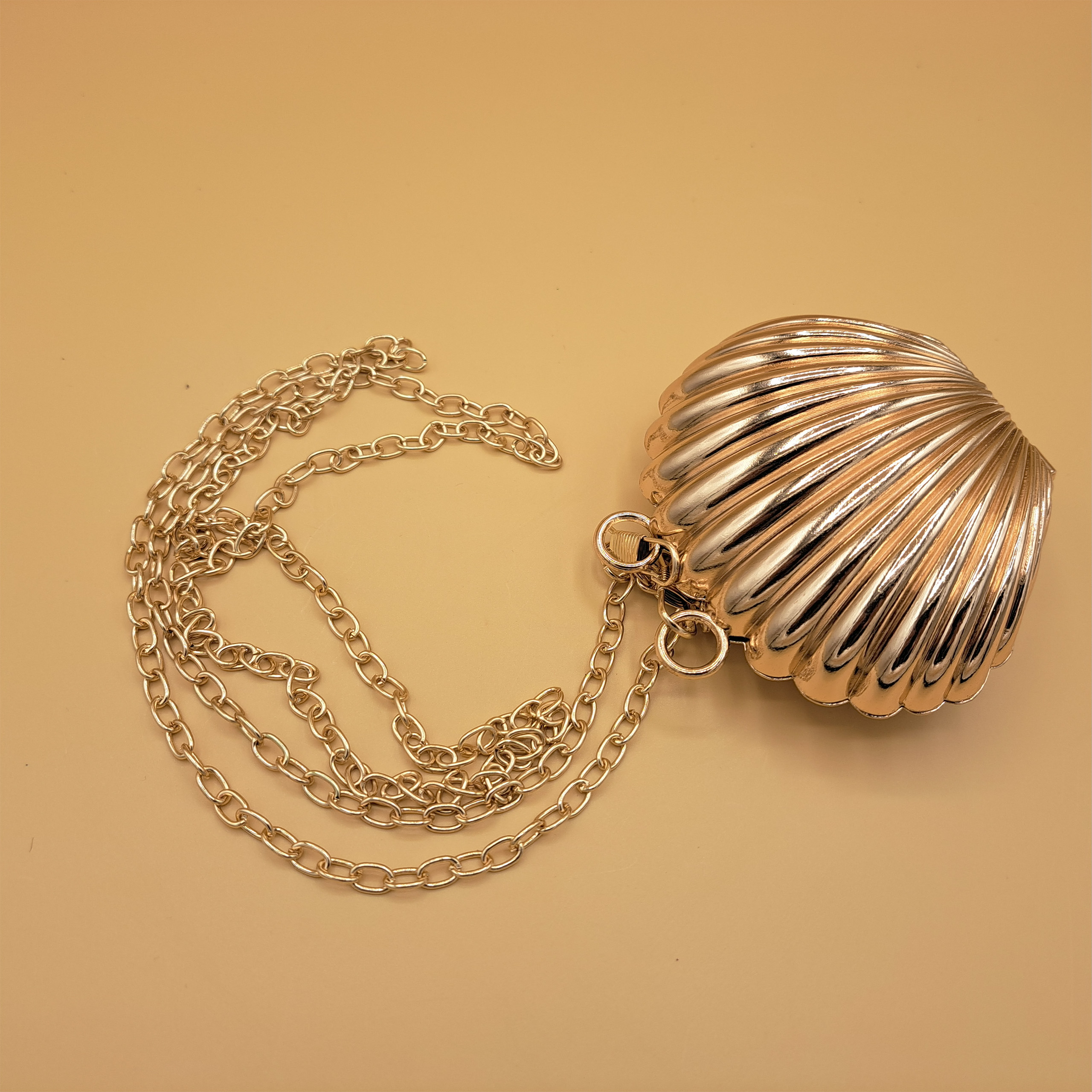 Dive into elegant style with this enchanting seashell-shaped clutch, a captivating accessory that brings a touch of oceanic charm and luxurious glamour to any ensemble.