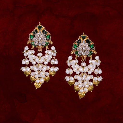 • Gold-plated handworked earrings embossed with fine zircon stones, centre emerald stones along with heavy embellishments of natural and champagn pearls.