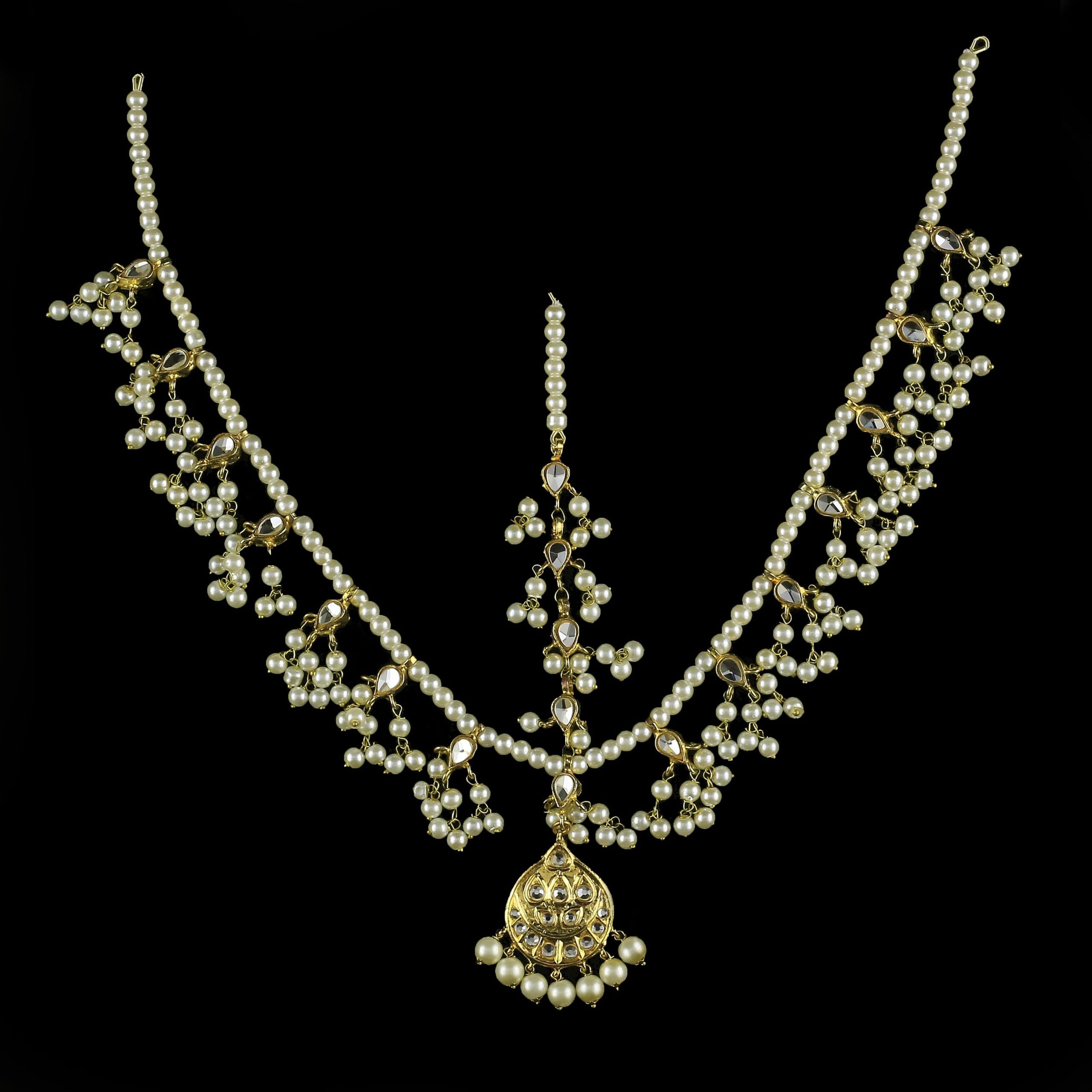 • Gold-plated Thappa Kundan headpiece/Mathapatti embellished with fine kundan stones and natural pearls.