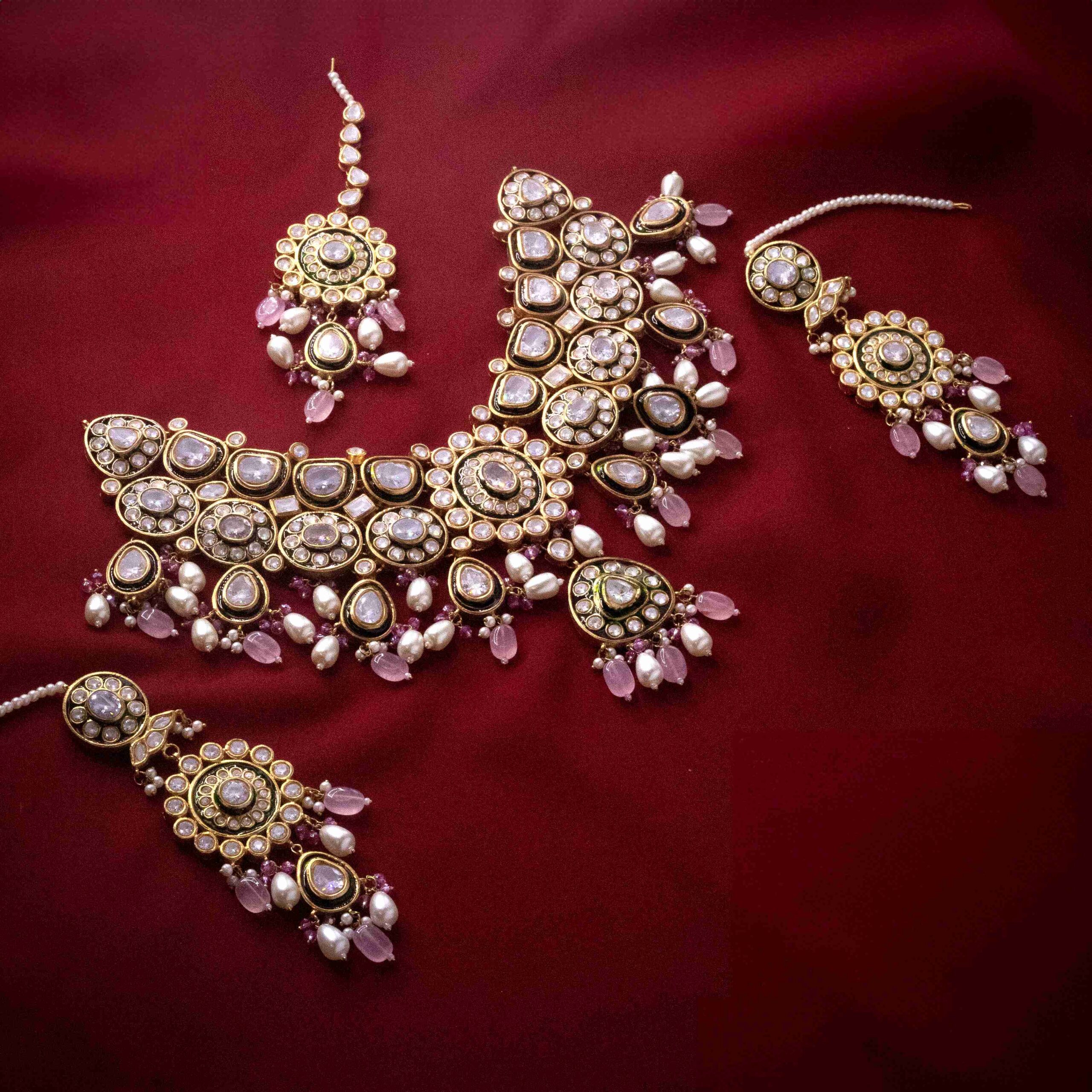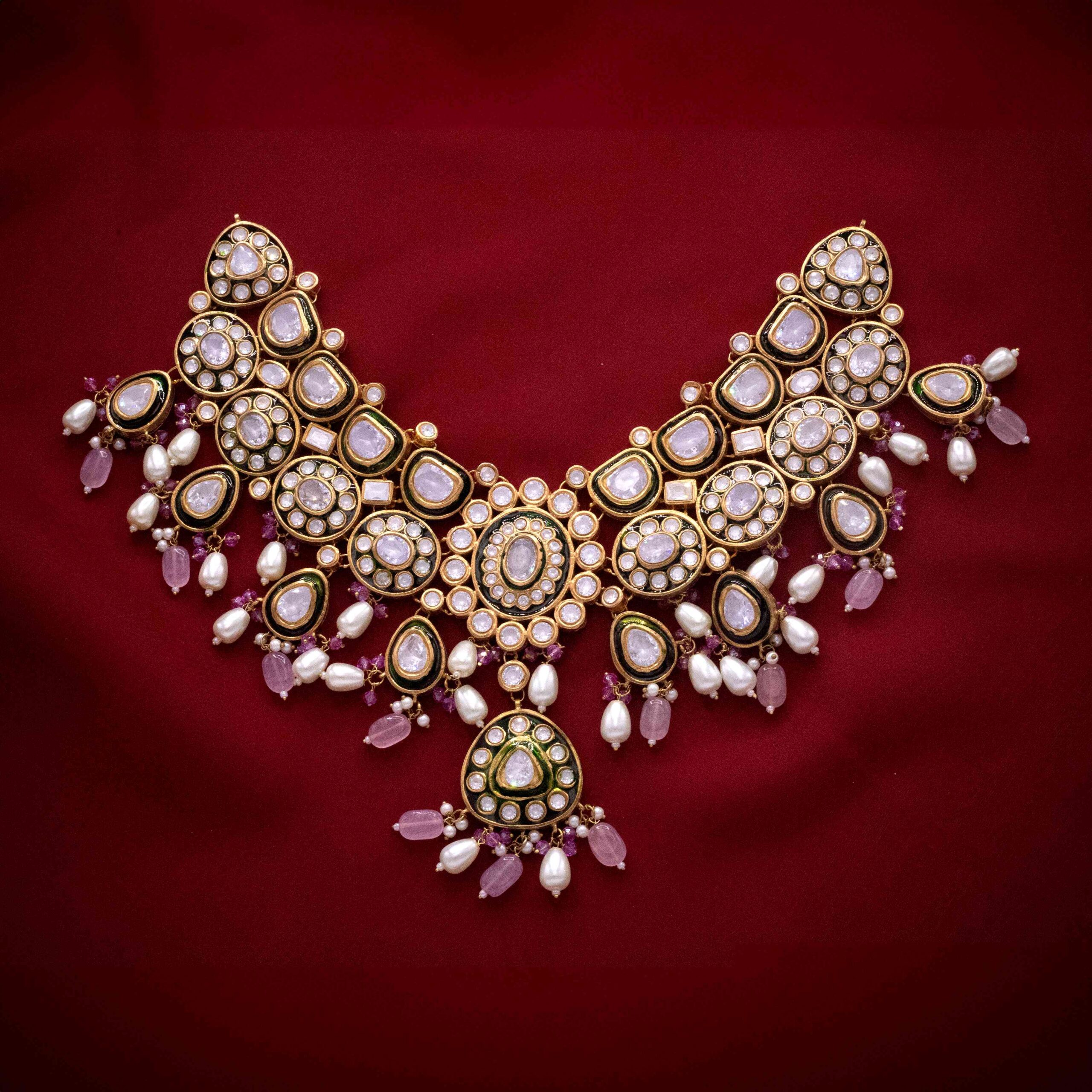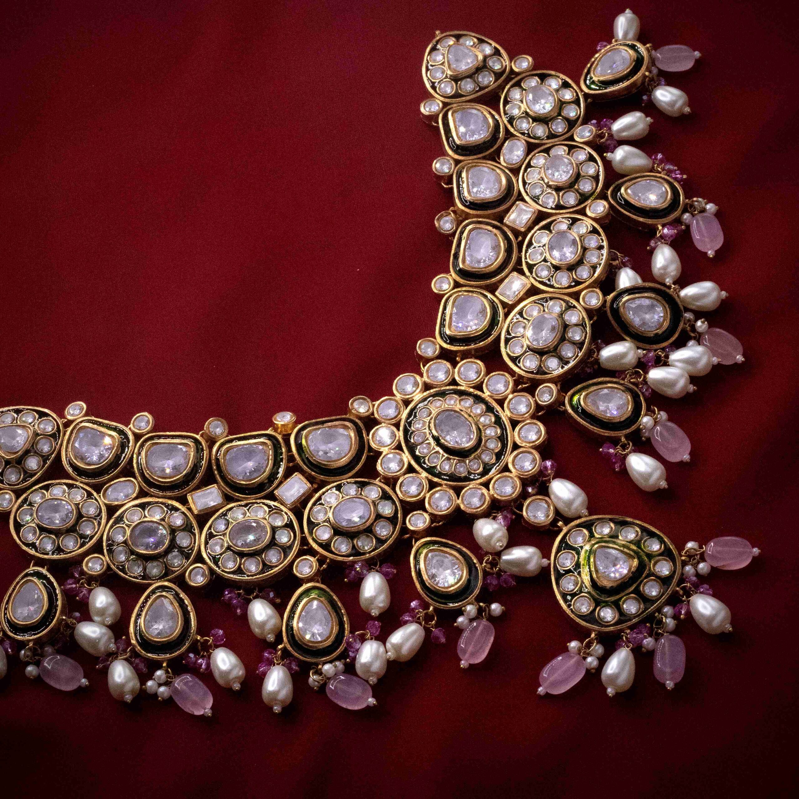 • Gold-plated handworked gutka kundan necklace embedded with real zircon stones with natural pearls embellishments along with custom pink and emerald pearls.