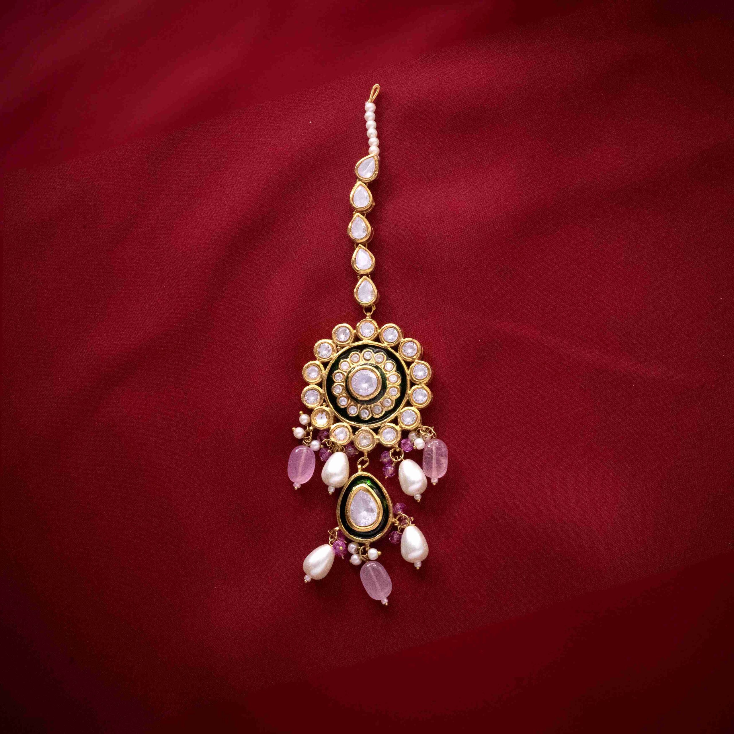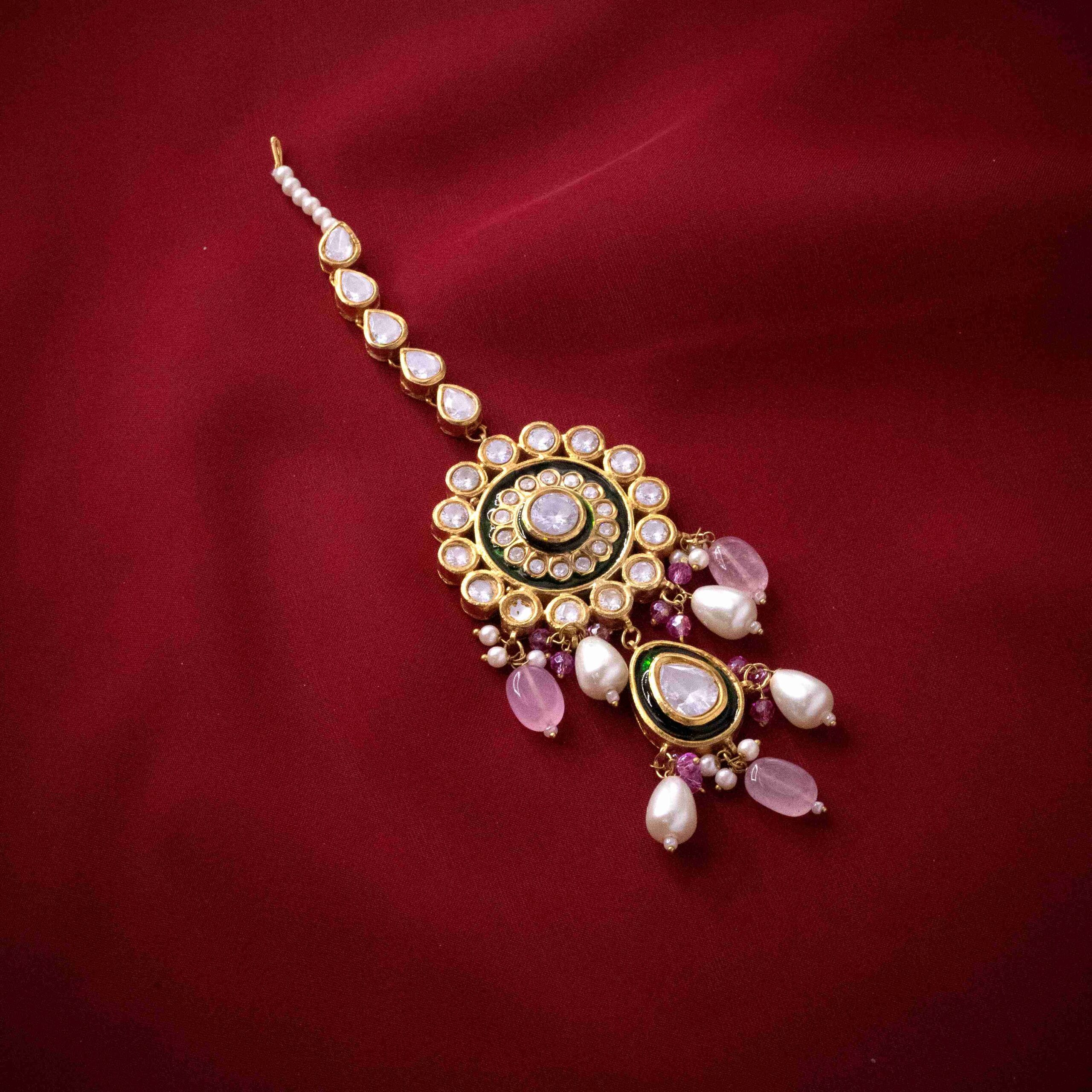 • Gold-plated handworked gutka kundan bindia embedded with real zircon stones with natural pearls embellishments along with custom pink and emerald pearls.