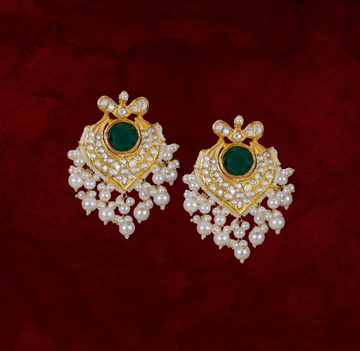 Gold-plated thappa kundan earrings embossed with fine kundan stones, centre emerald stone along with heavy natural pearls finishing.