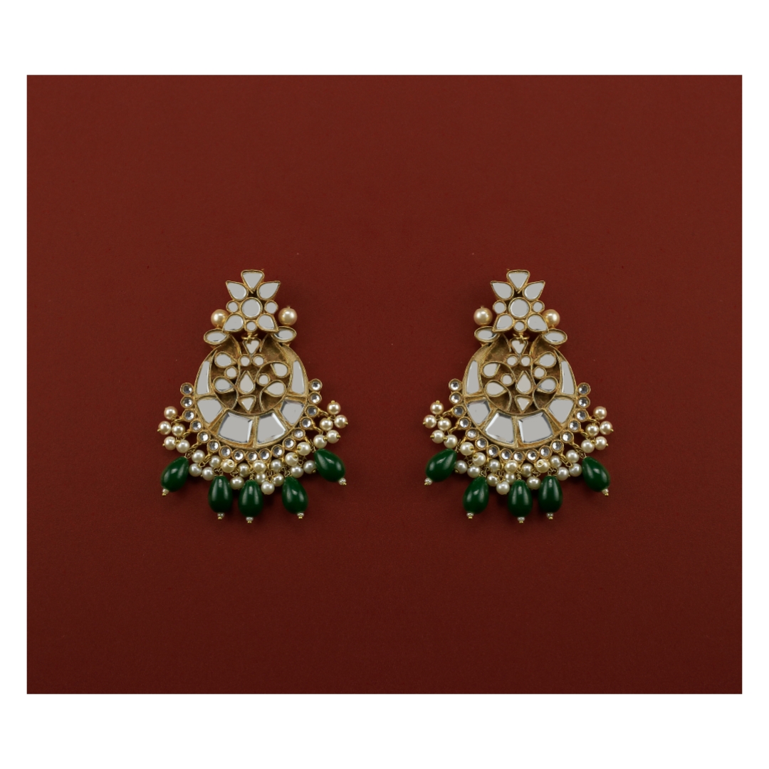 • Gold-plated Sheesha Kundan earrings embellished with fine kundan stones along with natural and emerald green pearls.
