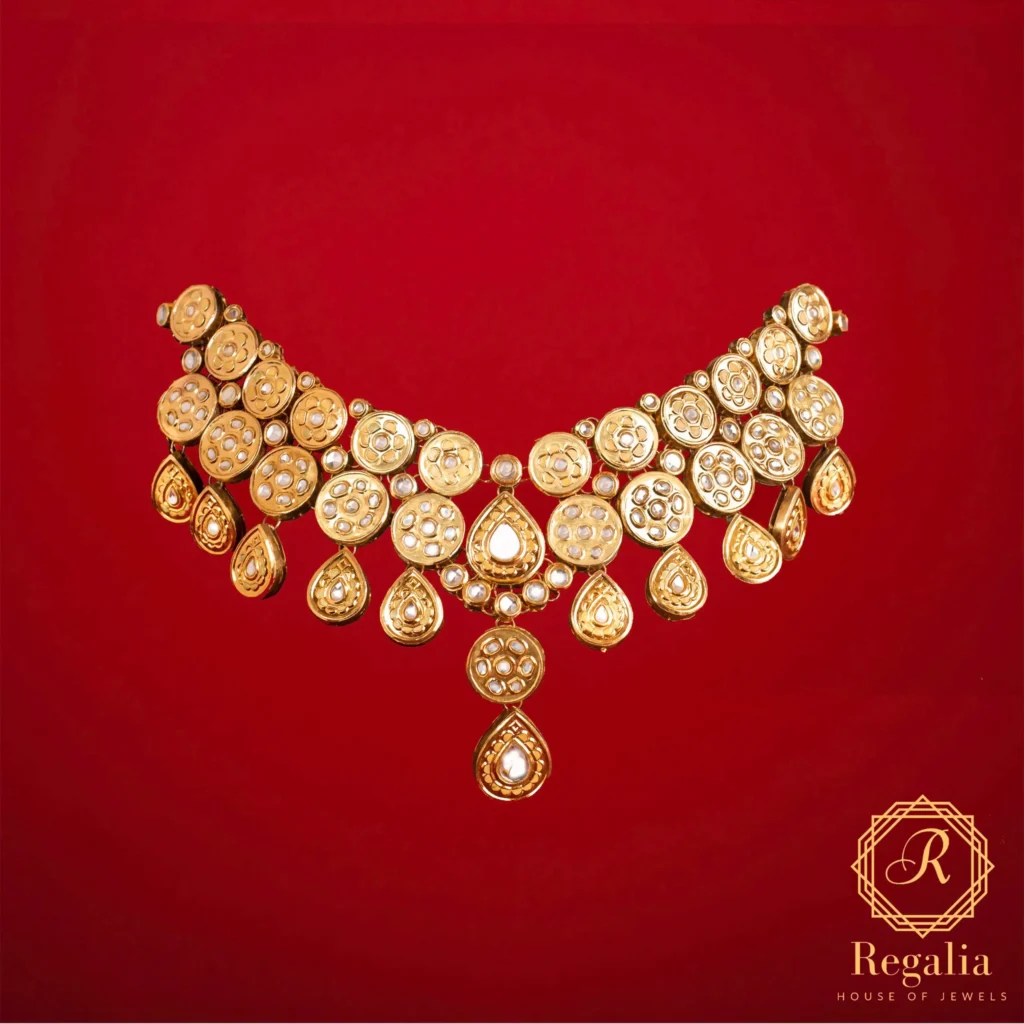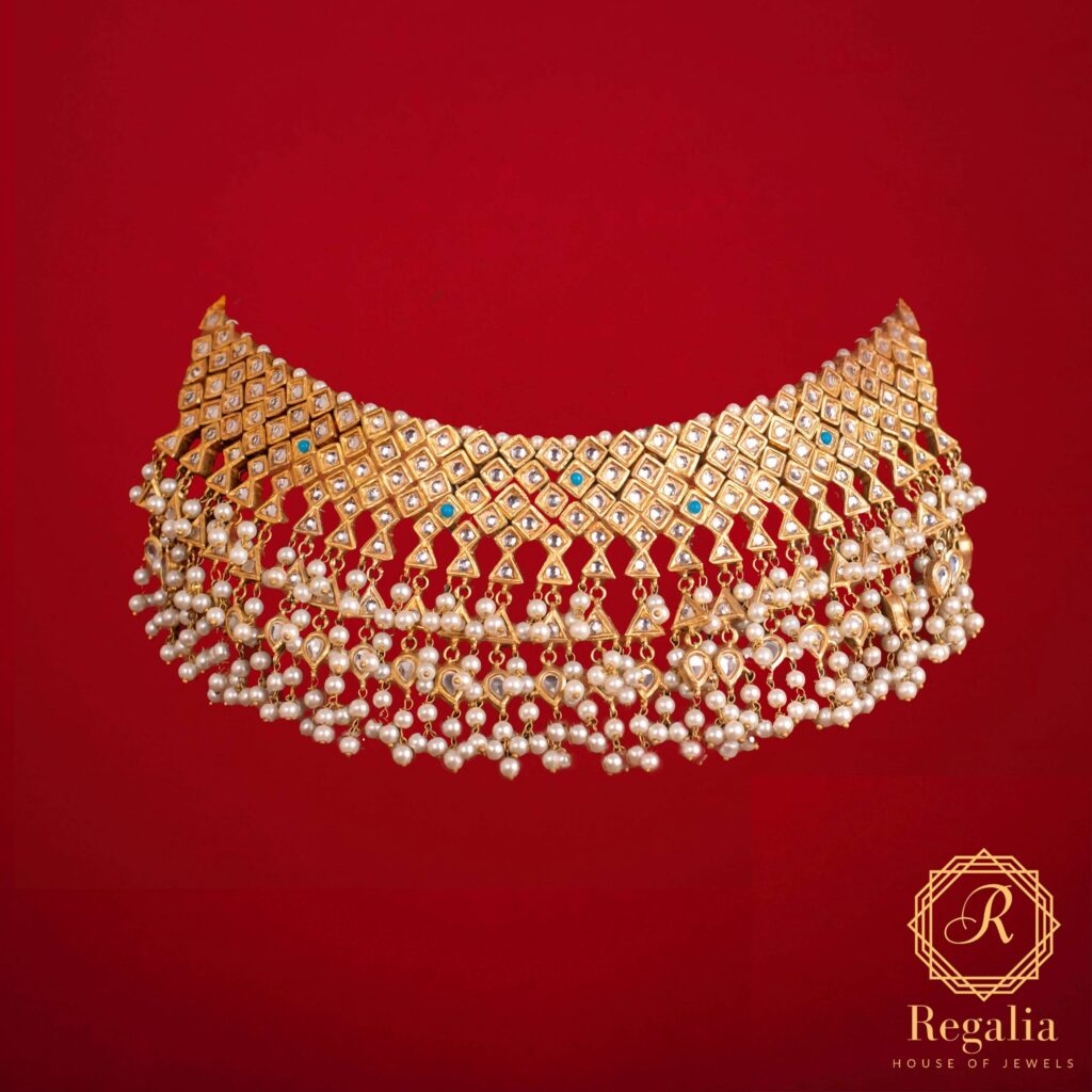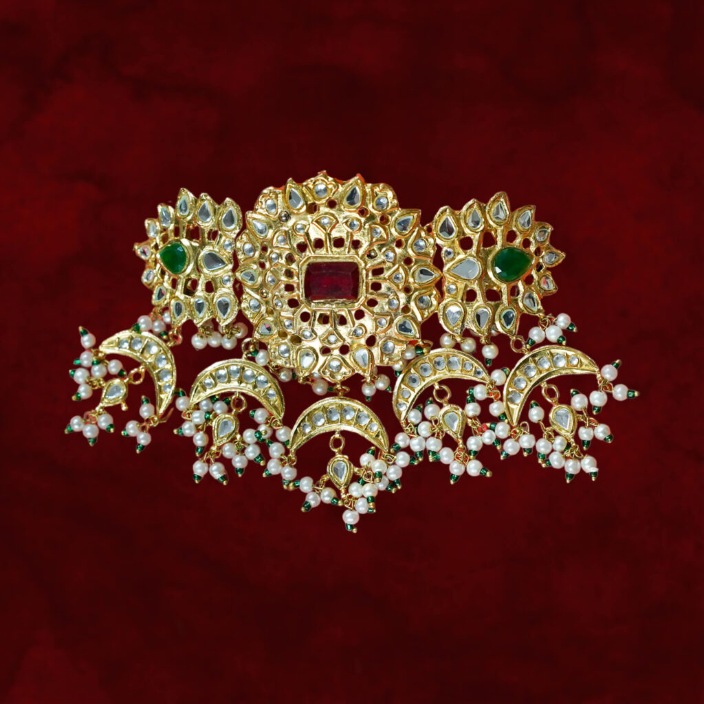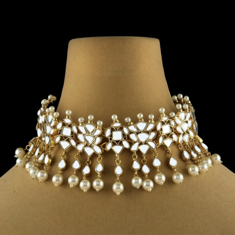 Exquisitely handcarved Goldplated choker finely Embedded with kundan polki stones, carved with meena and embellished with emerald and natural pearls.