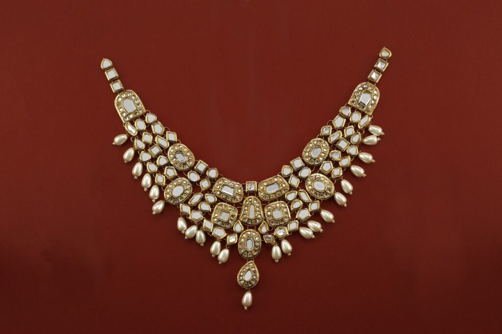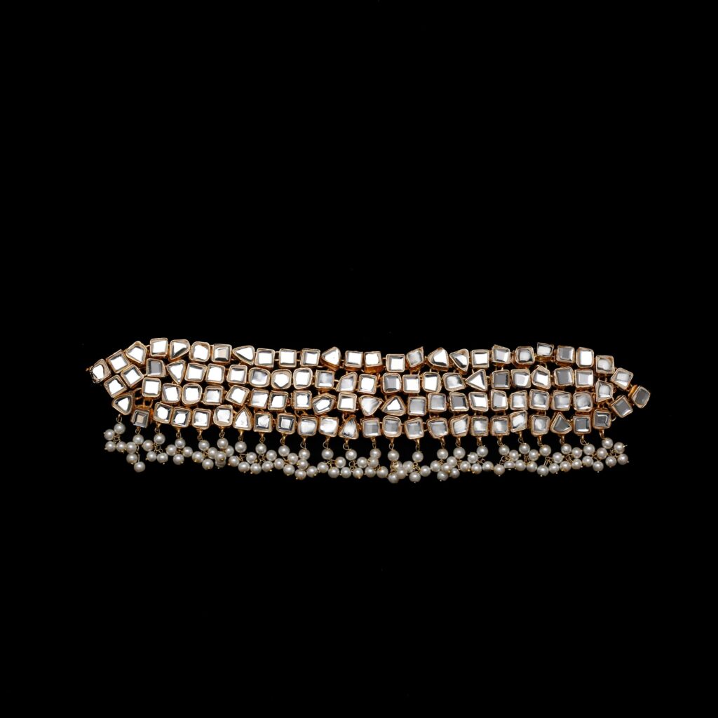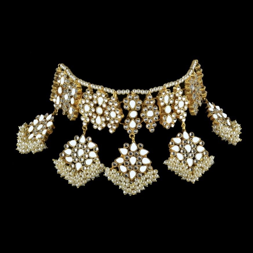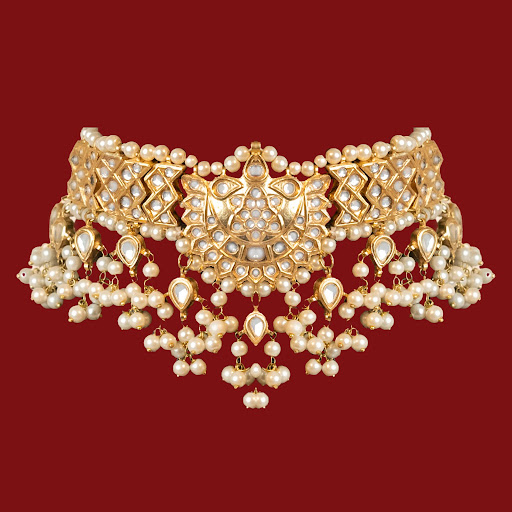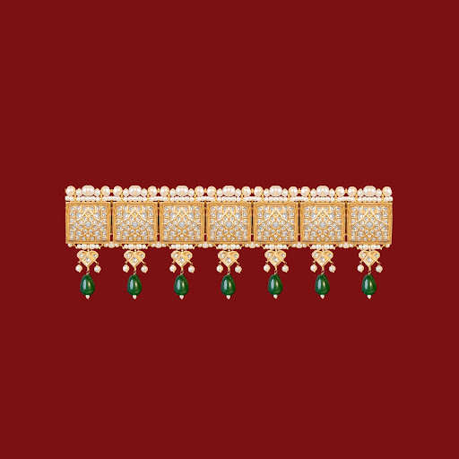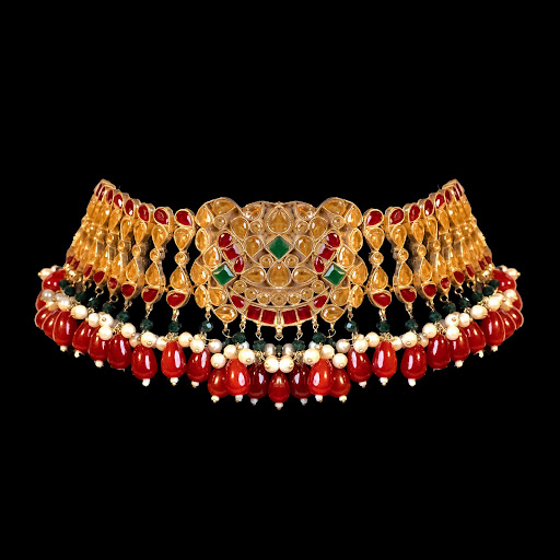 Exquisitely handcarved Goldplated choker finely Embedded with kundan polki stones, carved with meena and embellished with emerald and natural pearls.