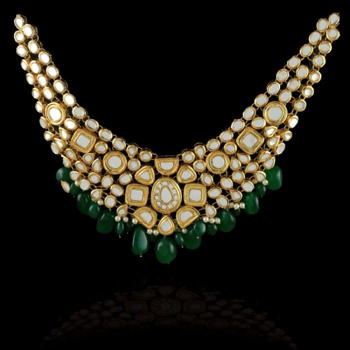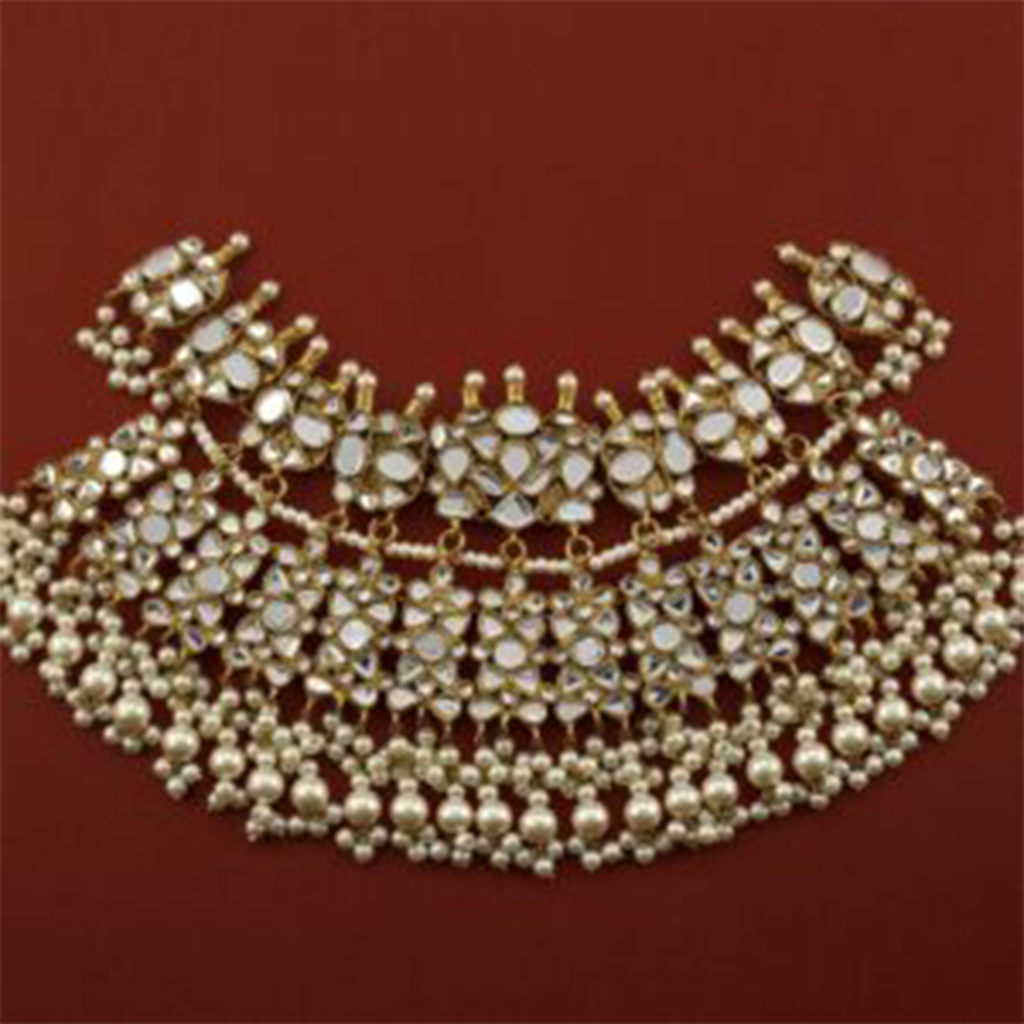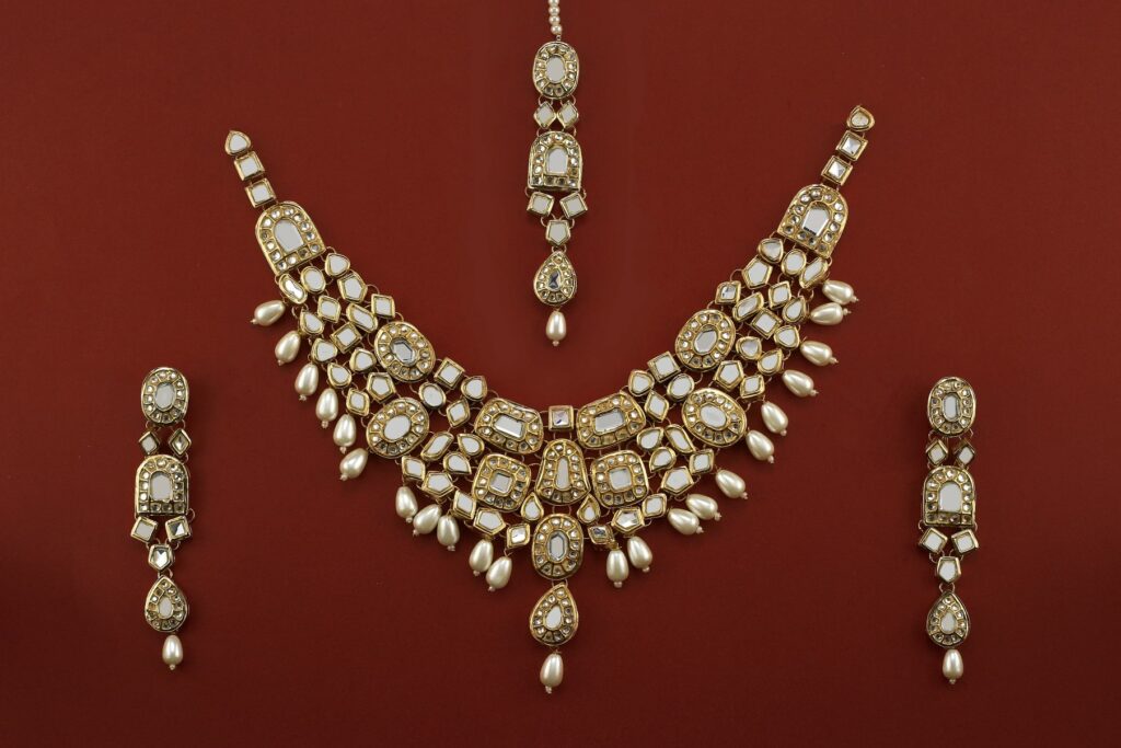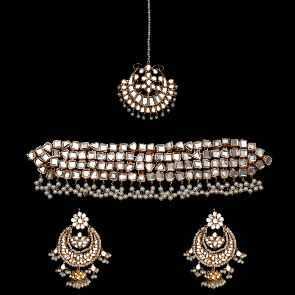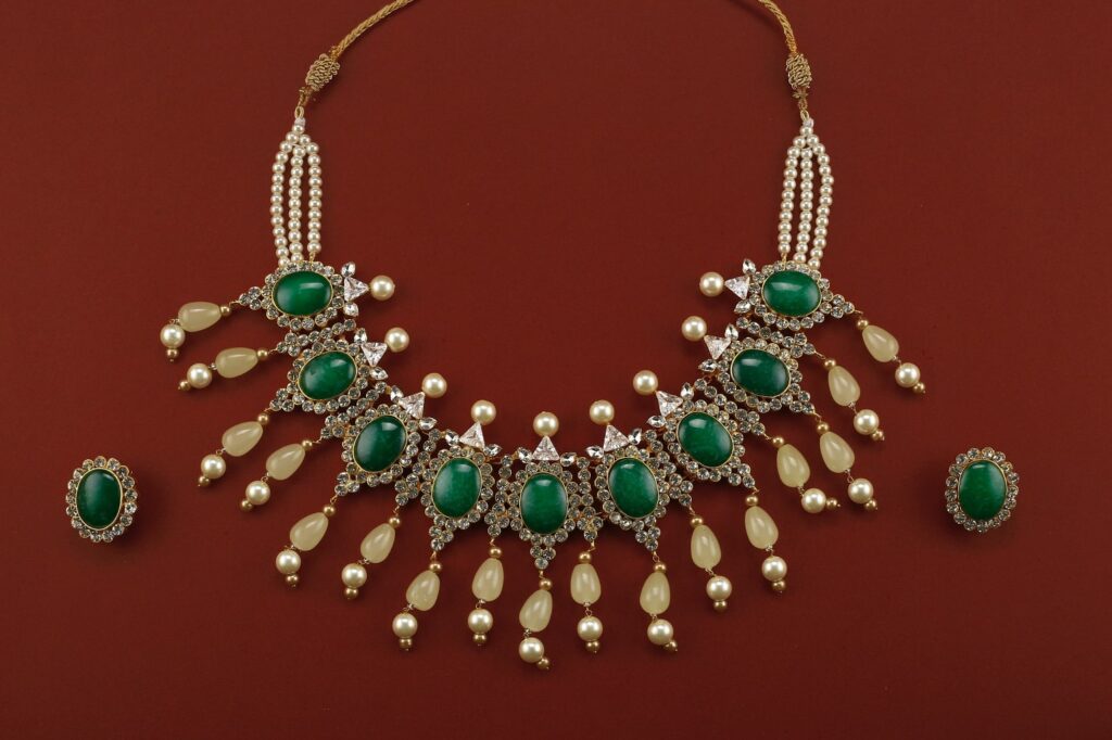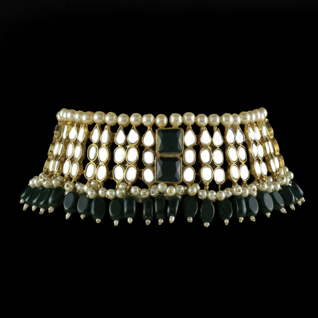 Idika is a luxurious gold-plated bridal jewellery set, meticulously hand-carved to reflect timeless elegance. This complete bridal set includes a statement choker, matching jhumkay, a traditional bindia, and an intricately designed jhumar. Each piece is finely embedded with premium kundan polki stones and enhanced with detailed meena work. The set is beautifully embellished with emerald accents and natural pearls, making it an ideal choice for bridal wear, wedding functions, and formal occasions.