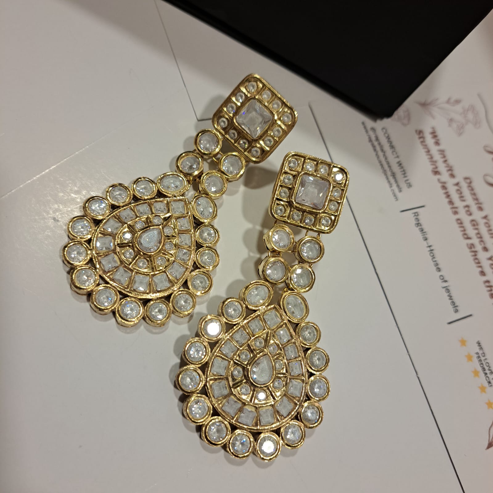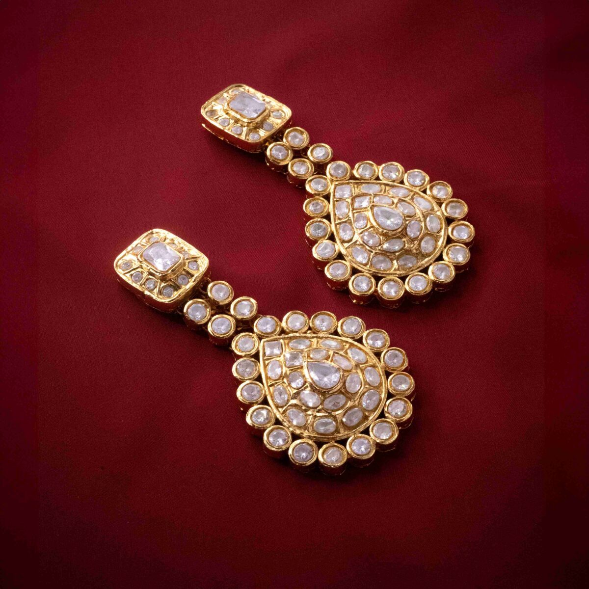 -Gold-plated handworked earrings finely embellished with kundan polki stones. -Goldplated handworked bindia finely embellished with kundan polki stones.