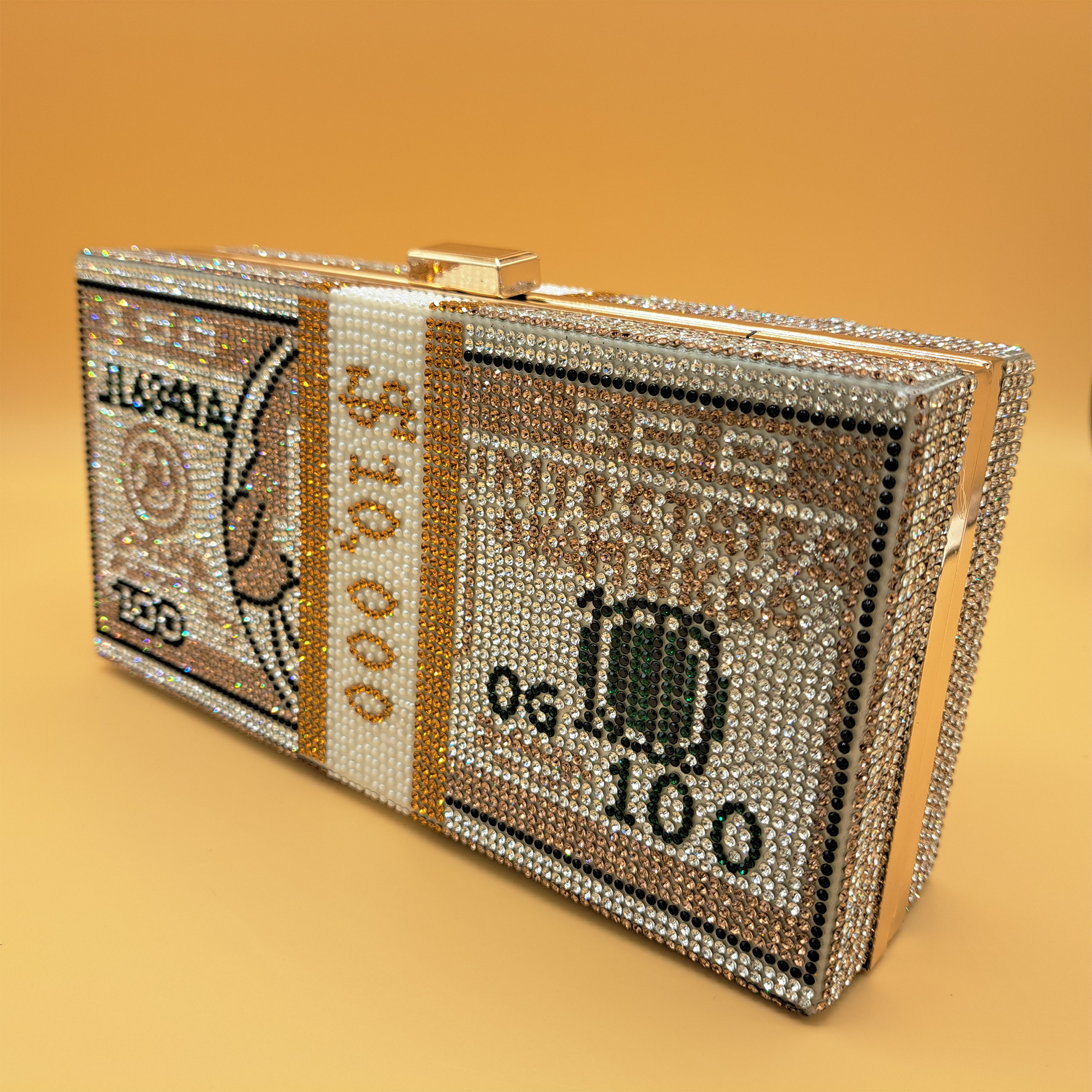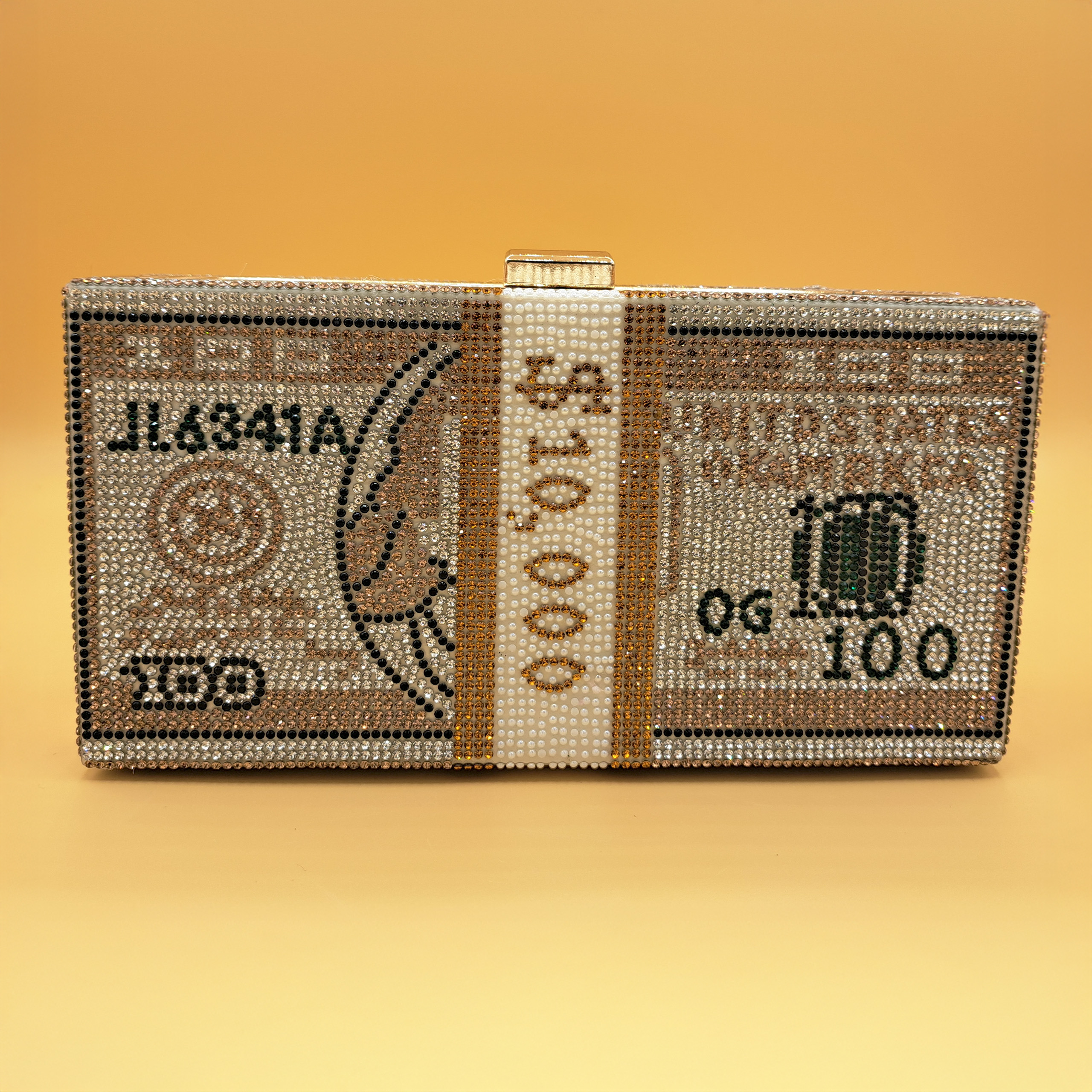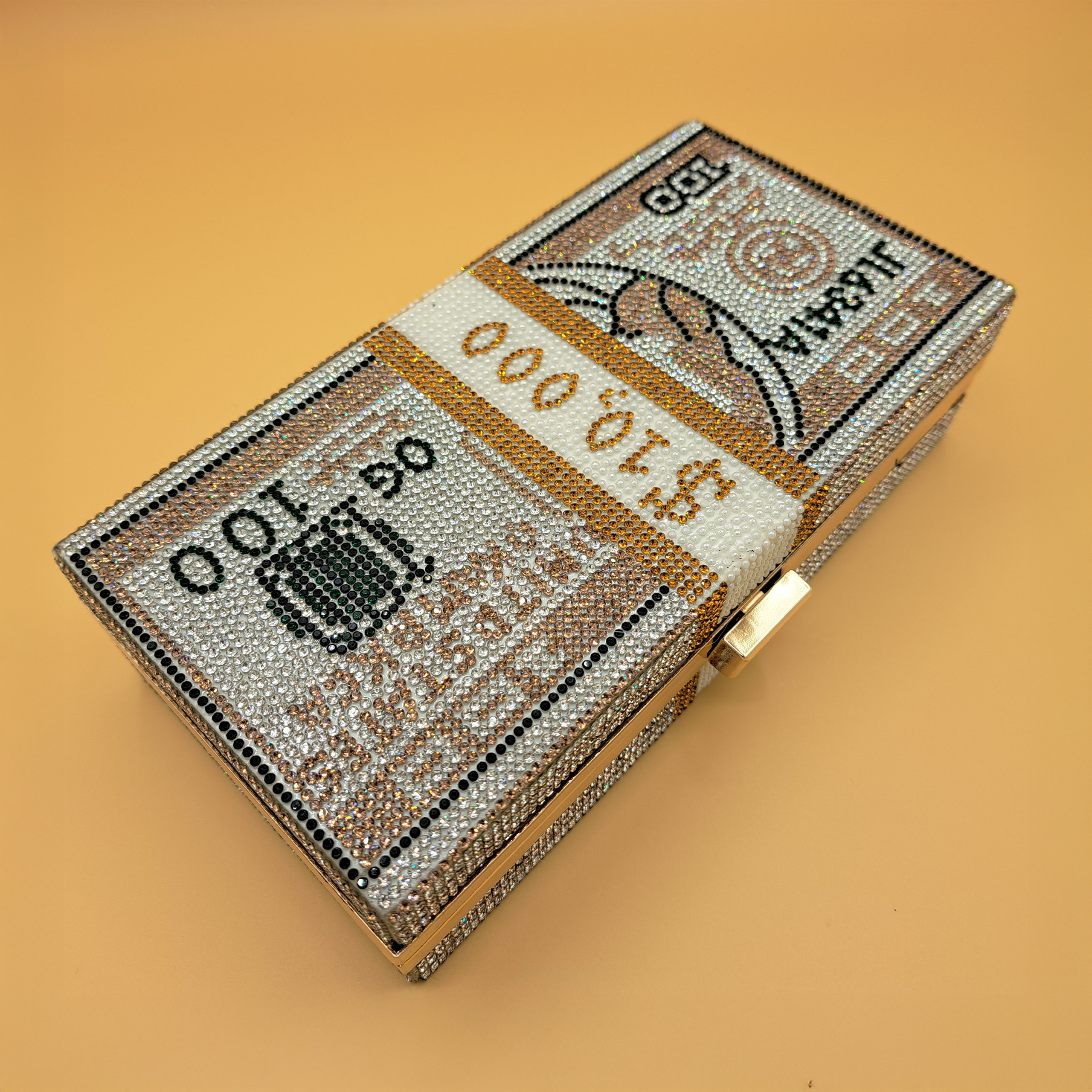 This clutch is crafted into a structured rectangular hard-shell body, shaped and designed to resemble a stack of US dollar bills. The entire exterior is lavishly embellished with an intricate mosaic of shimmering crystals: