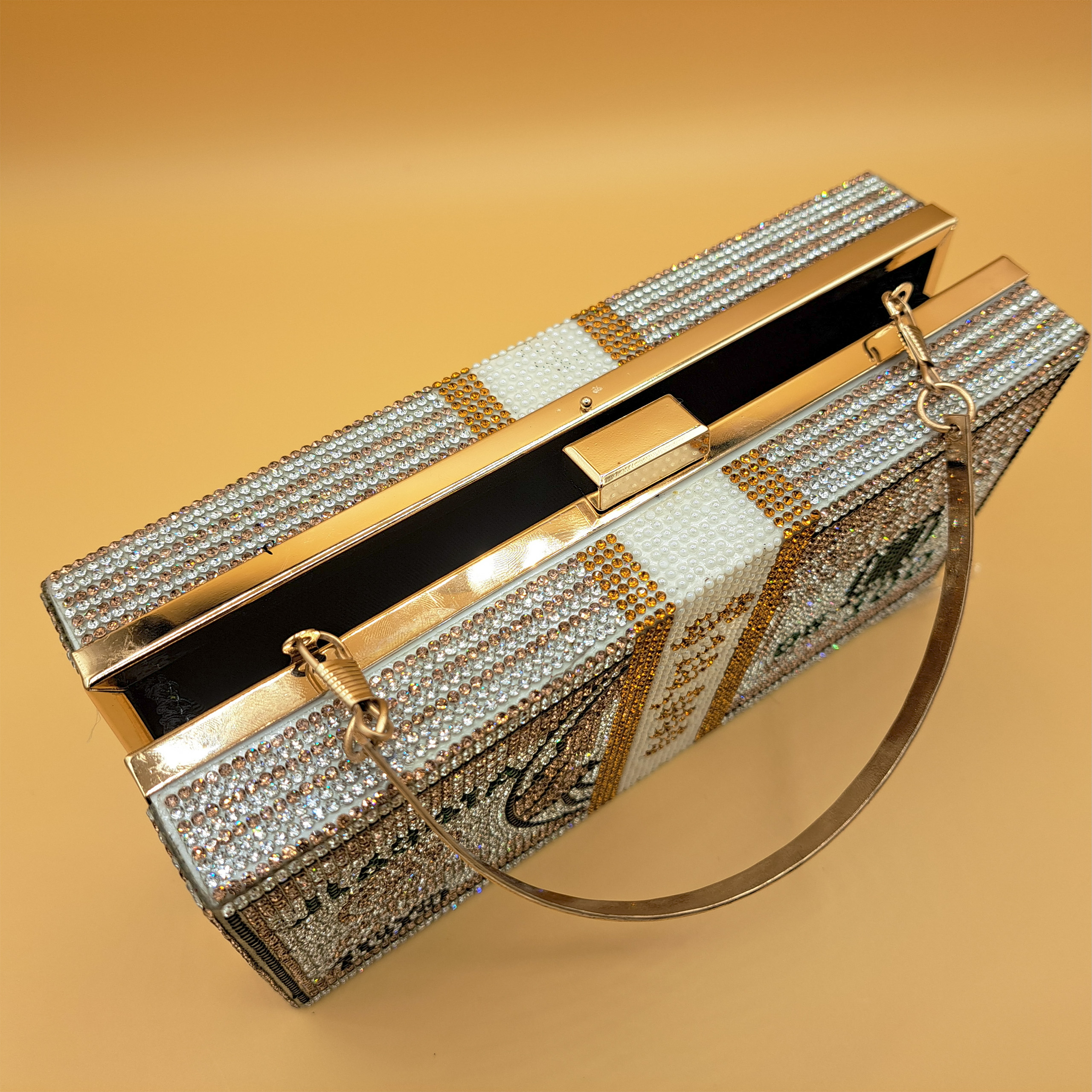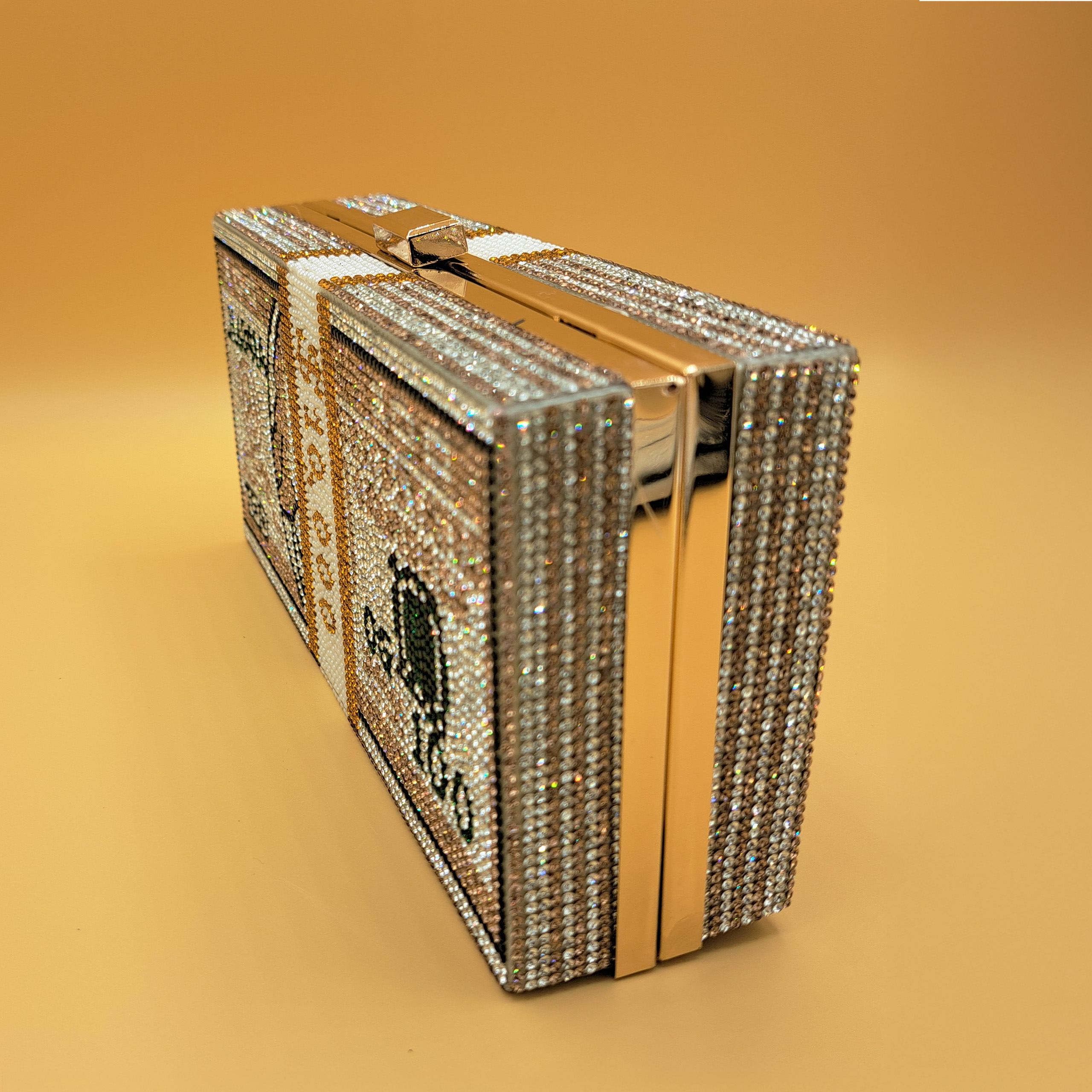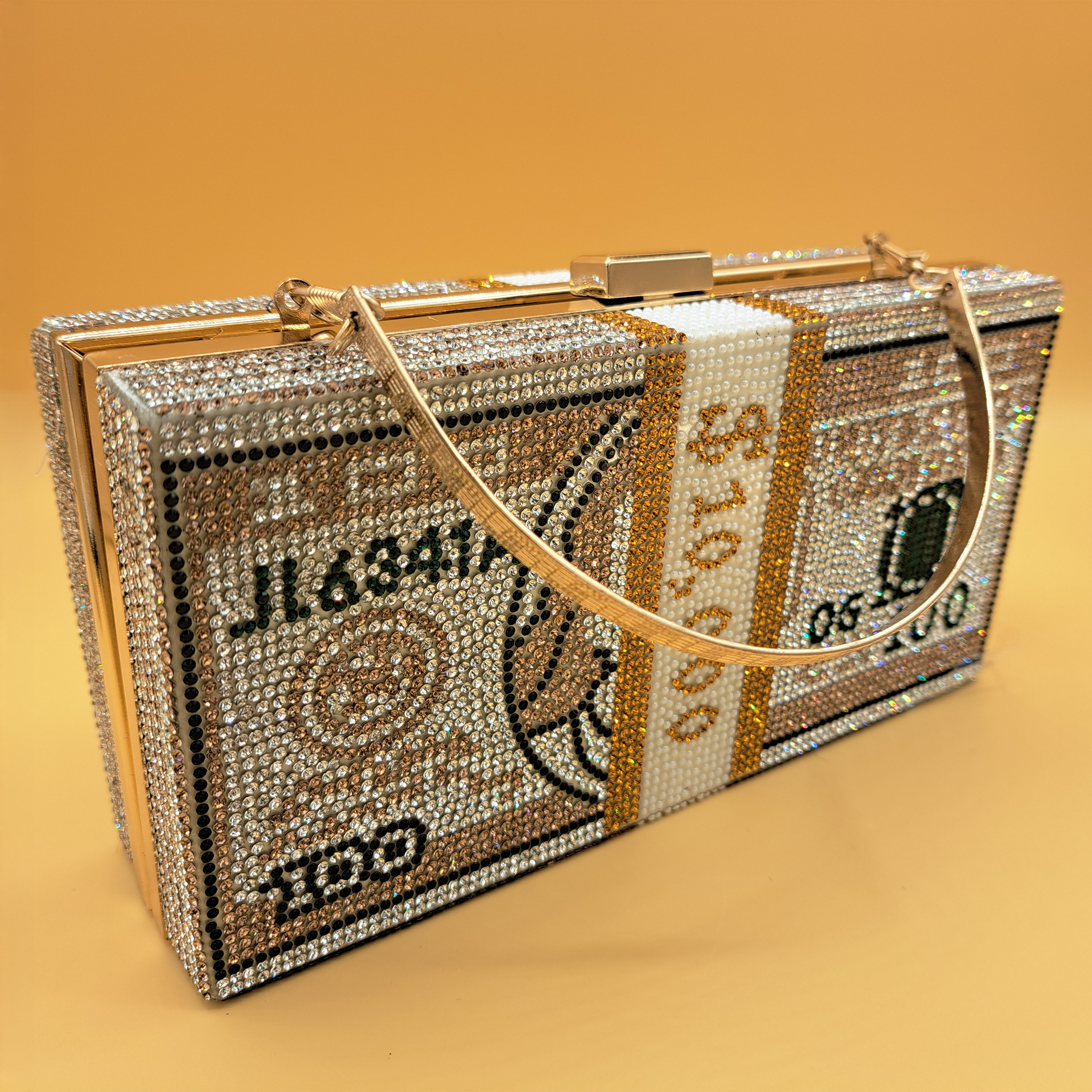This clutch is crafted into a structured rectangular hard-shell body, shaped and designed to resemble a stack of US dollar bills. The entire exterior is lavishly embellished with an intricate mosaic of shimmering crystals: