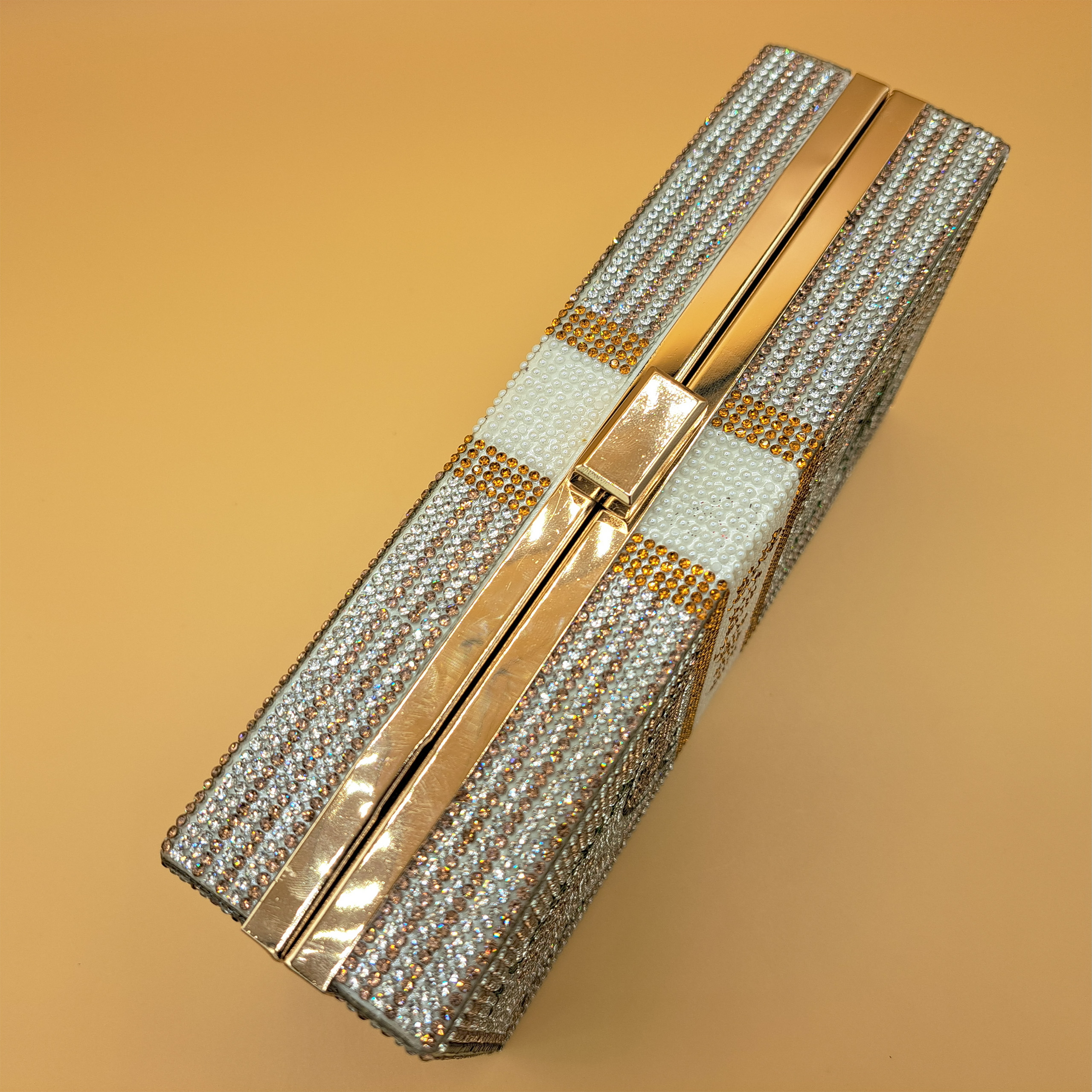 Materials: Hard-shell body, crystal embellishments, and gold-toned metal frame.