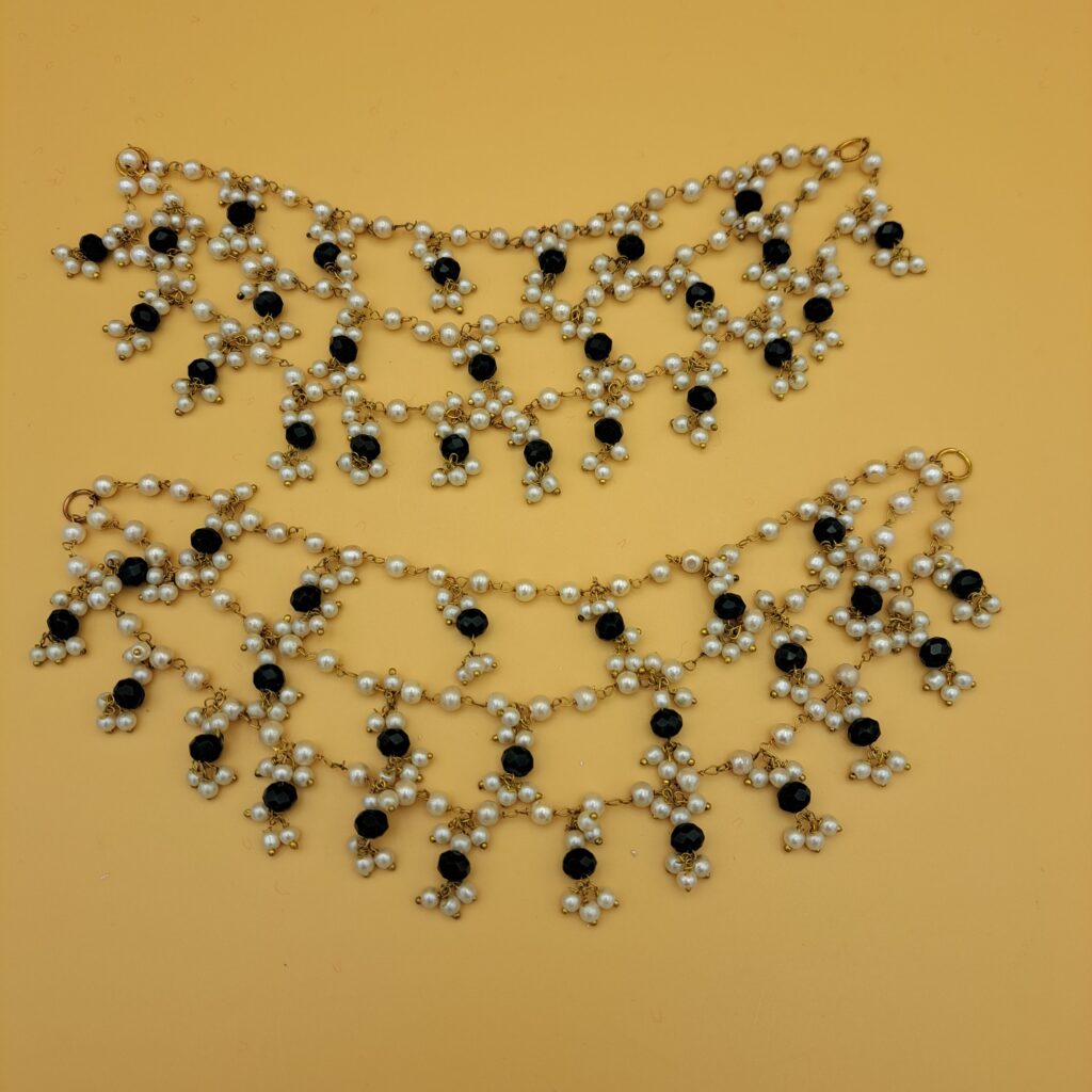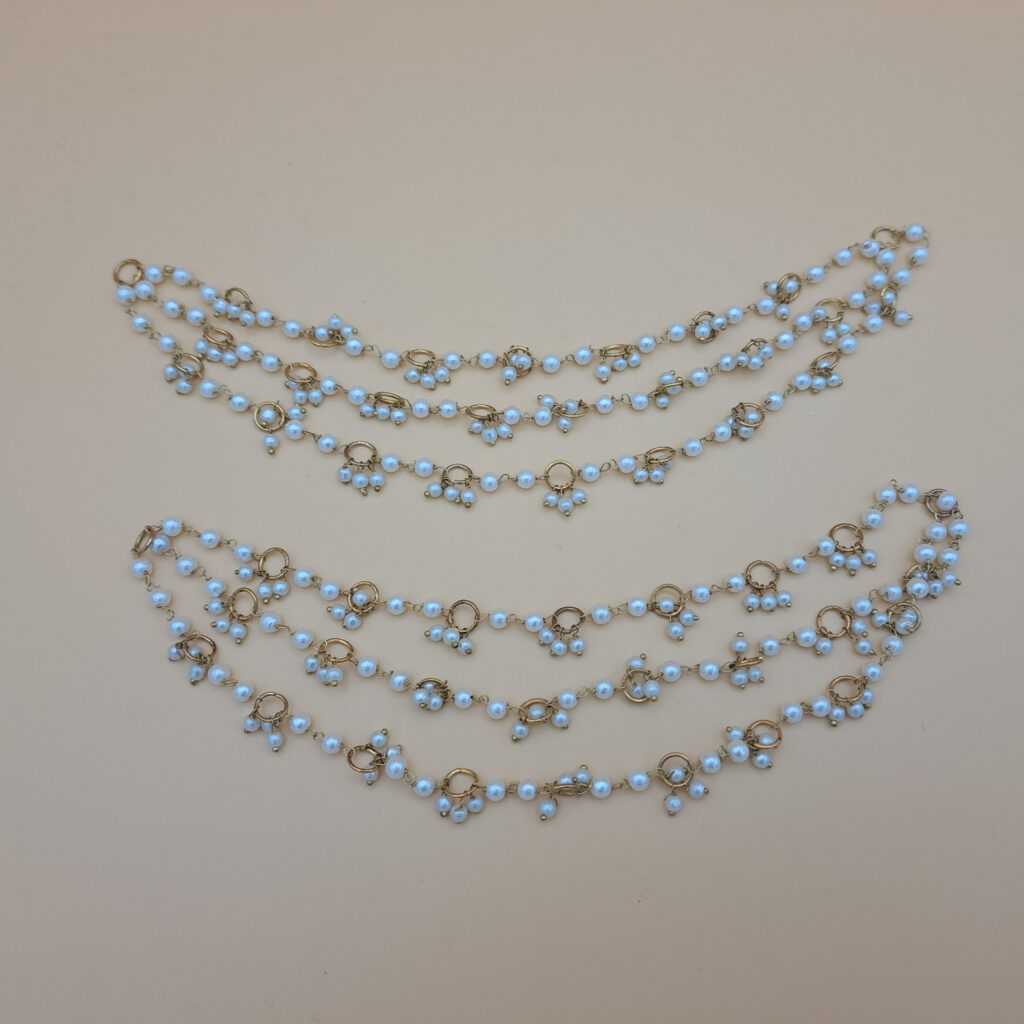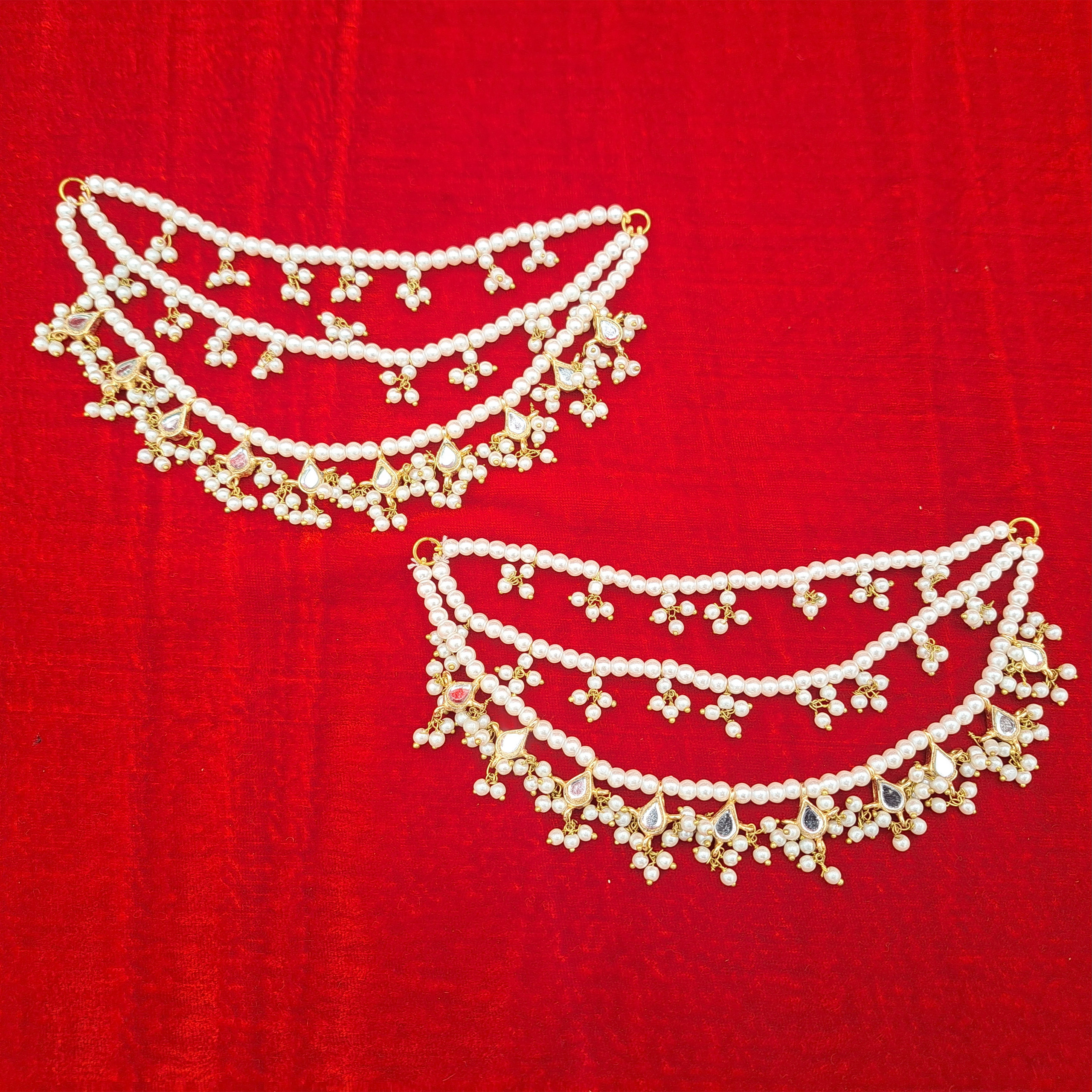 These exquisite detachable earchains/saharas perfectly blend traditional design with classic glamour. Three graceful strands of ivory faux pearls are highlighted by a fringe of shimmering goldplates Kundan tear-drops and delicate pearl hangings. The perfect support for your heaviest Jhumkas, offering a regal and highly photogenic frame for any bridal or festive look