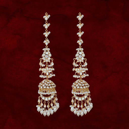 Gold-plated sheesha kundan long earrings embossed with fine kundan stones, delicate kundan saharas and heavy pearls embellishments.