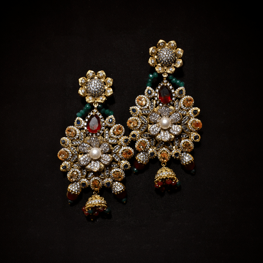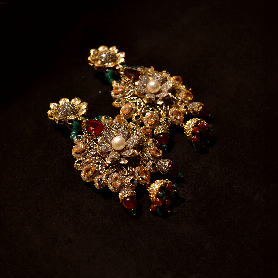 • Gold-plated handworked earrings embedded with real american zircon stones, champagne zircon stones, center ruby stones along with emerald and ruby pearls embellishments.