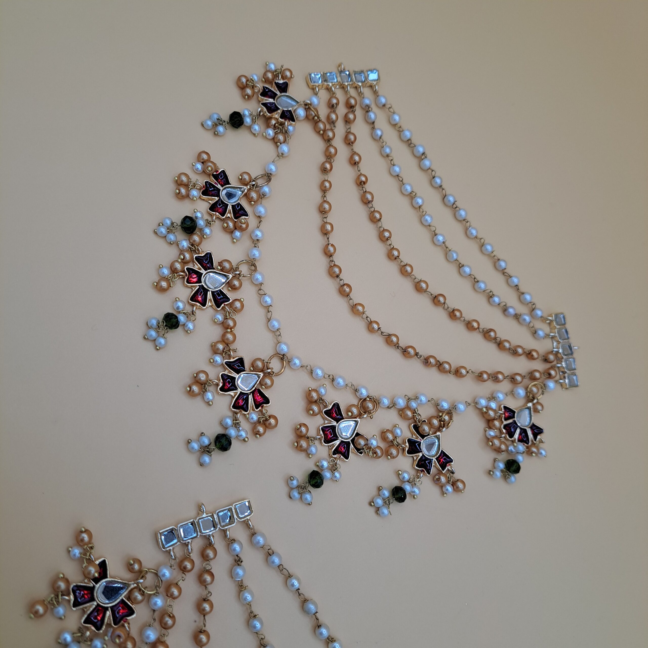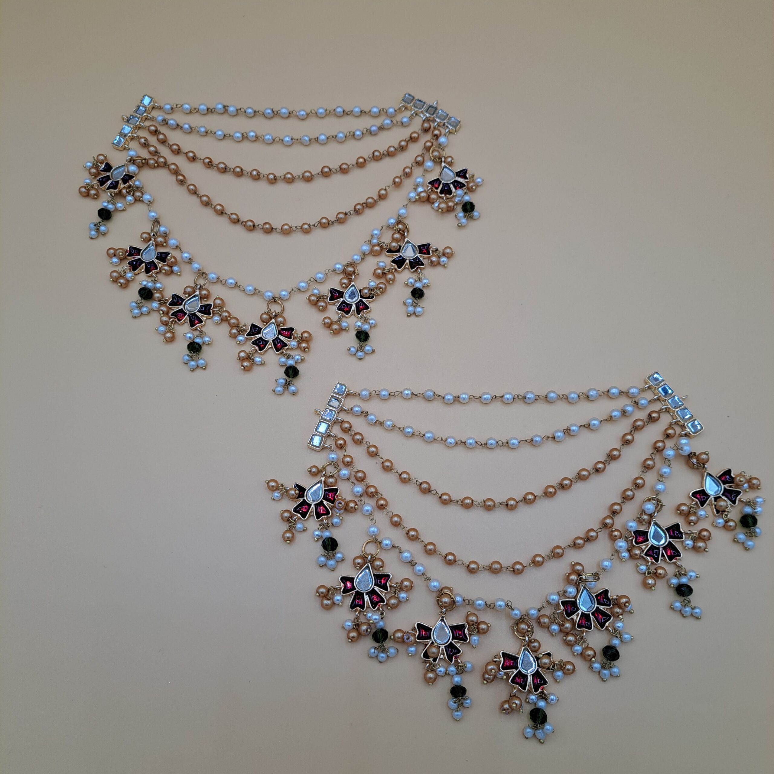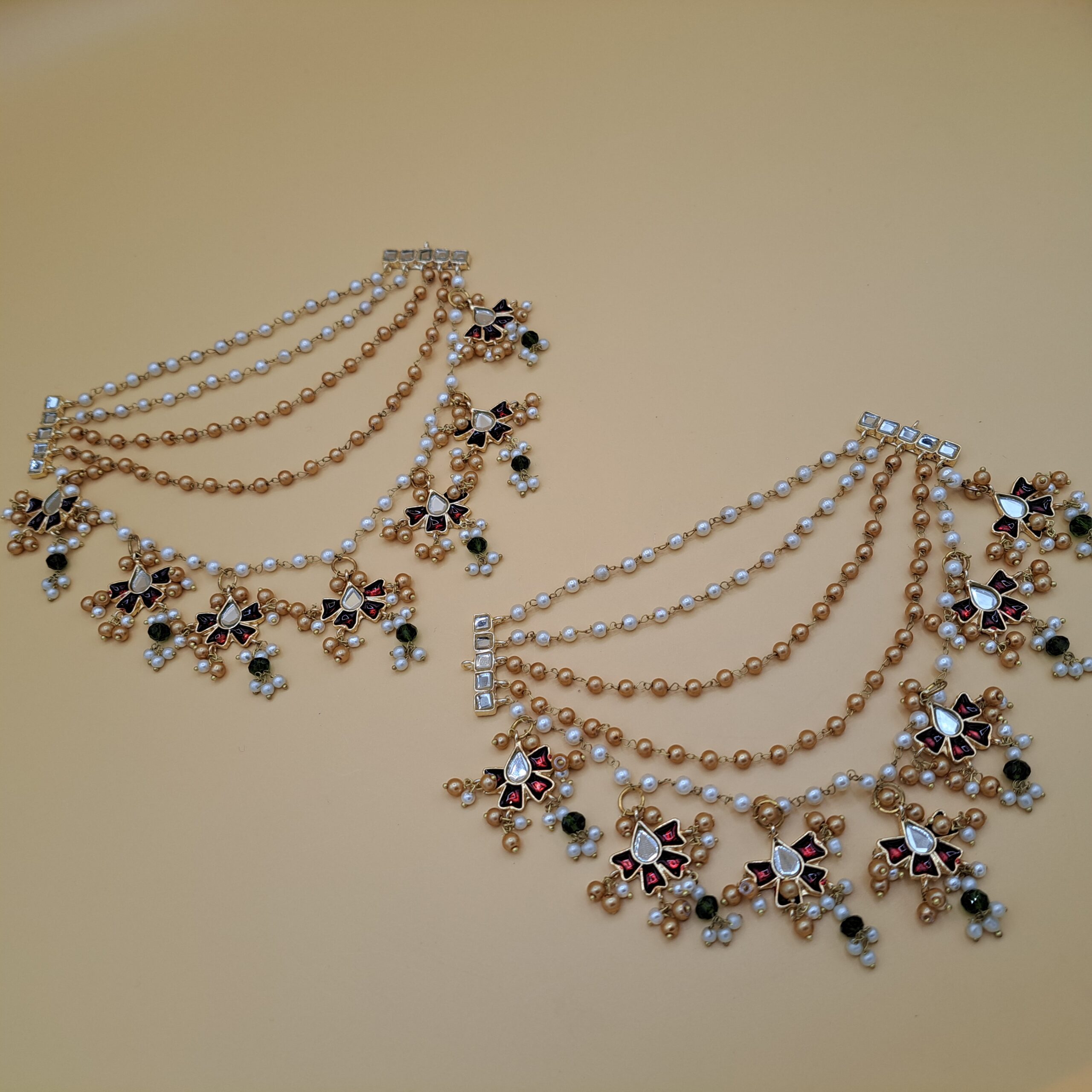 Command attention with these opulent detachable multi-layered saharas. Four strands of mixed white and golden pearls elegantly drape from a detailed goldplated Kundan floral drop, which features deep red and green accents for a ‘Navratna’ effect. This regal pair provides beautiful support for heavy traditional earrings, offering a breathtaking blend of classic Kundan artistry and sweeping pearl chains