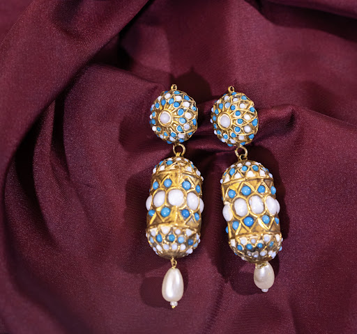 Gold-plated handworked earrings embossed with fine turquoise stones and natural pearls.