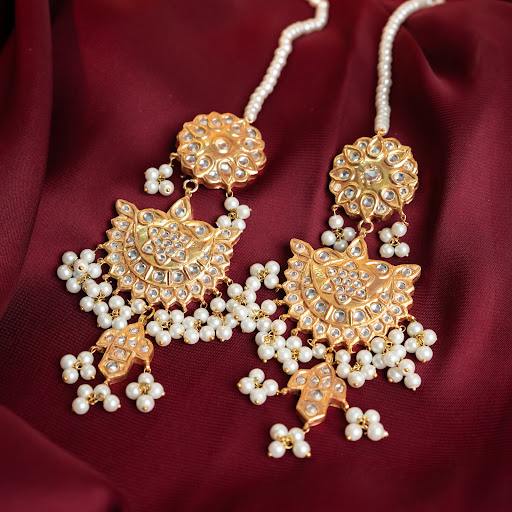 Gold-plated thappa kundan earrings embellished with fine kundan stones along with natural pearls embellishments.