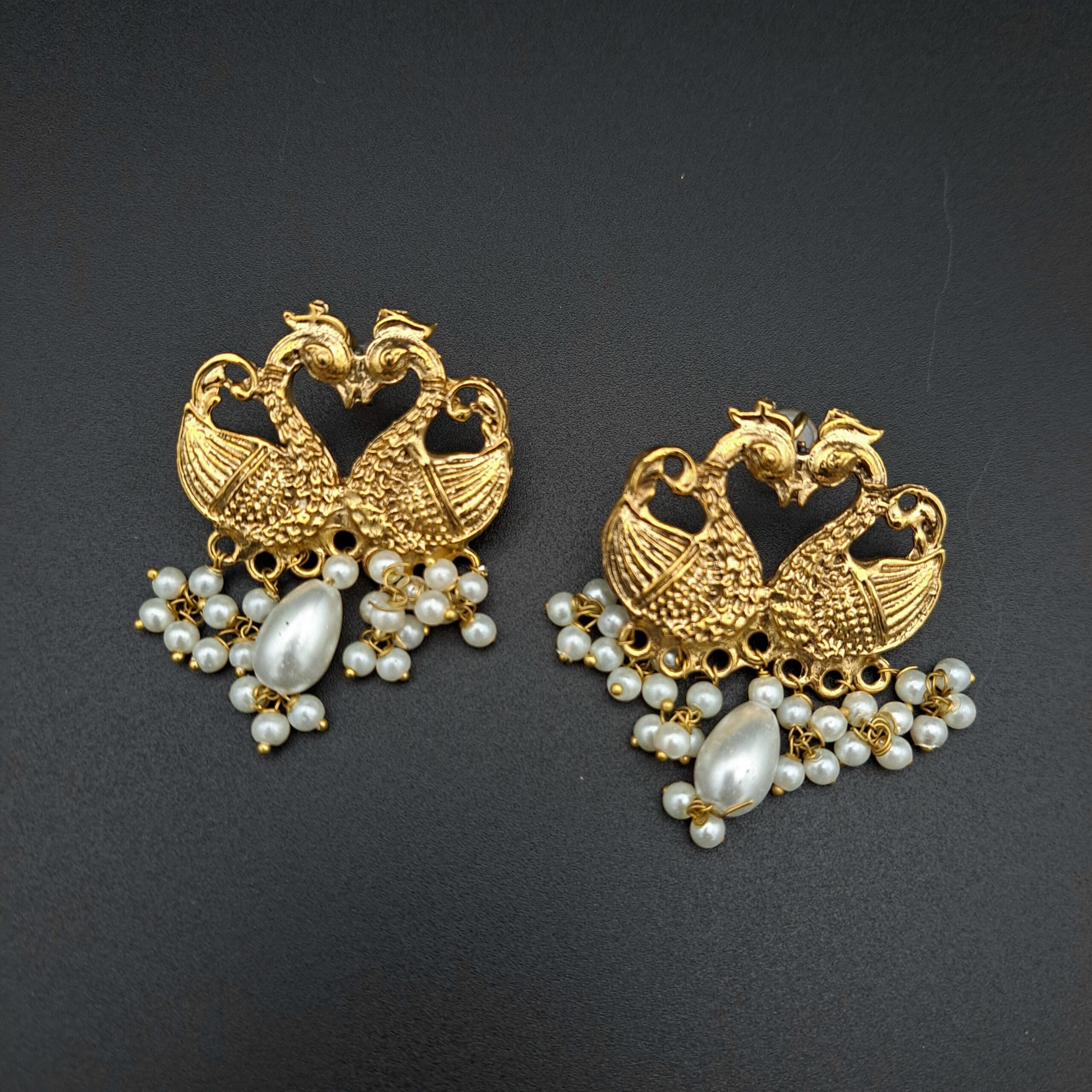 A timeless traditional design featuring two intricately textured gold-plated peacocks. Accented with a cascade of small, classic pearl beads.