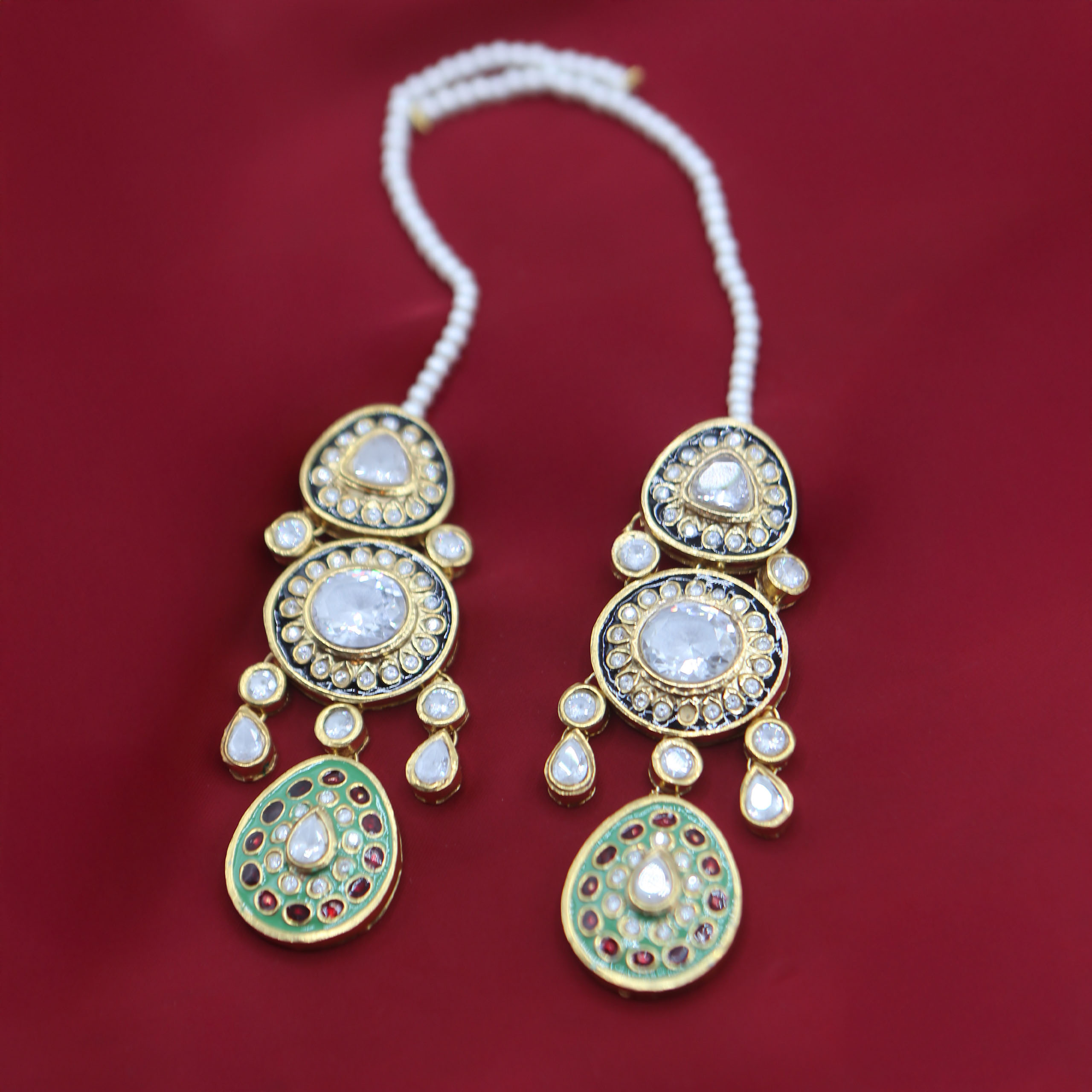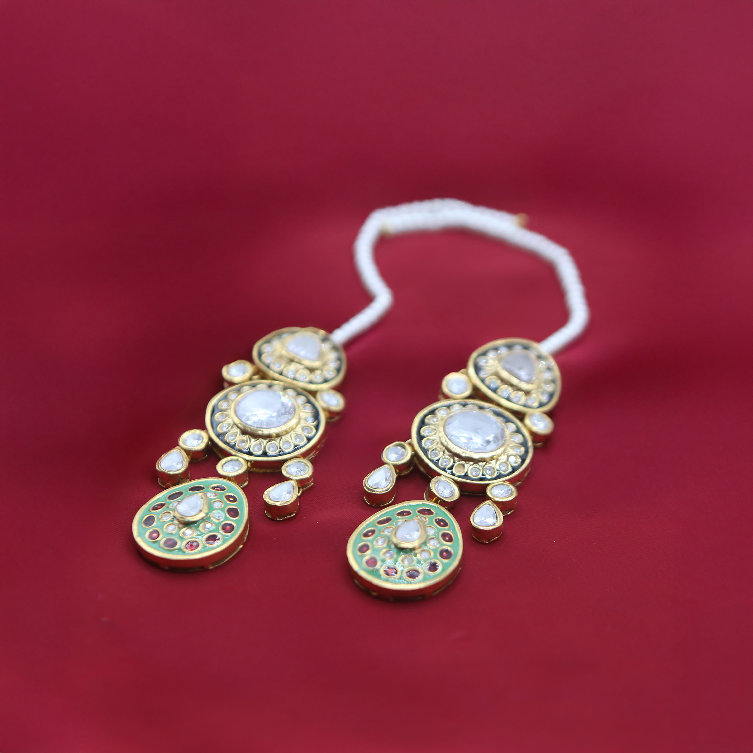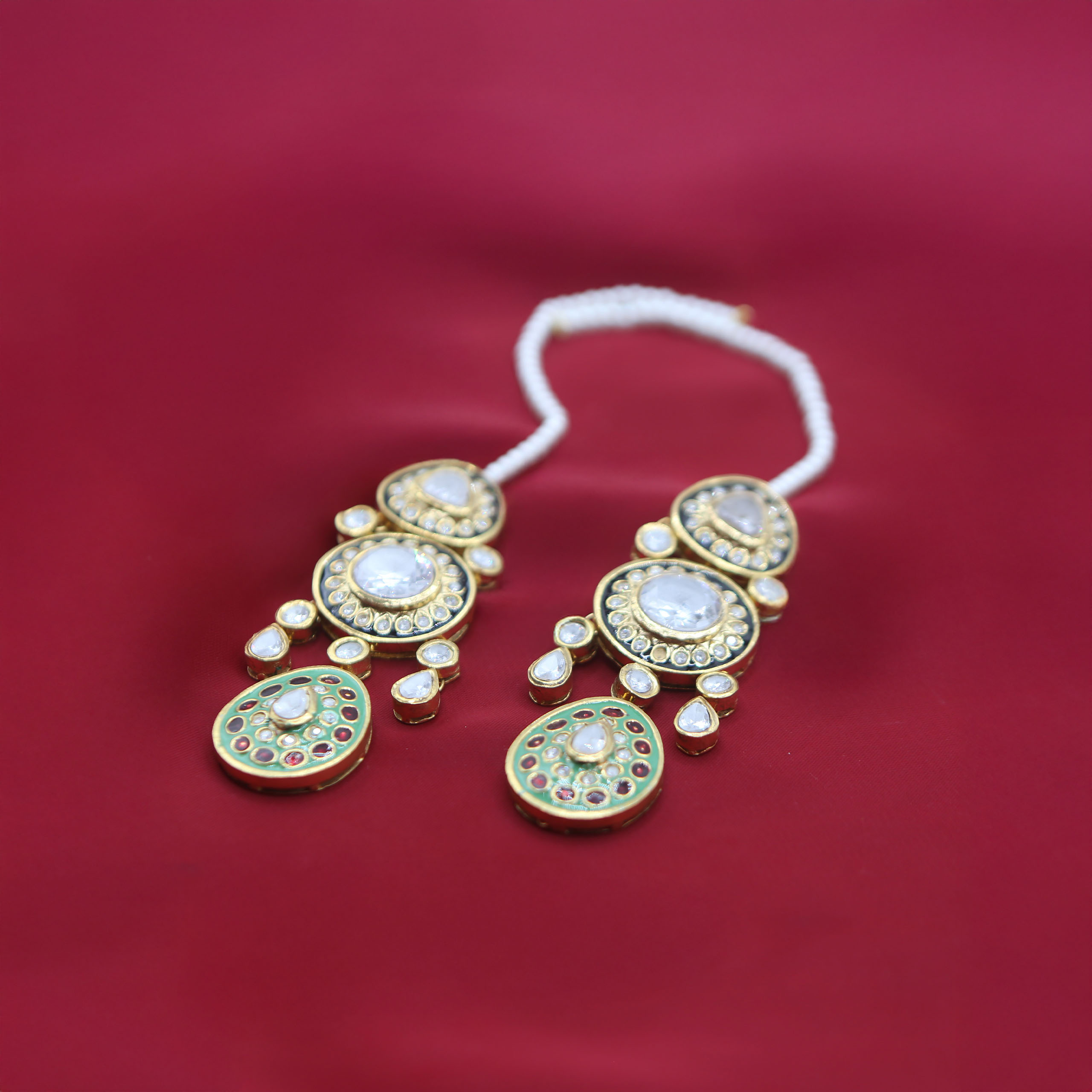 • Goldplated handworked gutka kundan earrings finely embellished with kundan polki stones and carved with meena work.