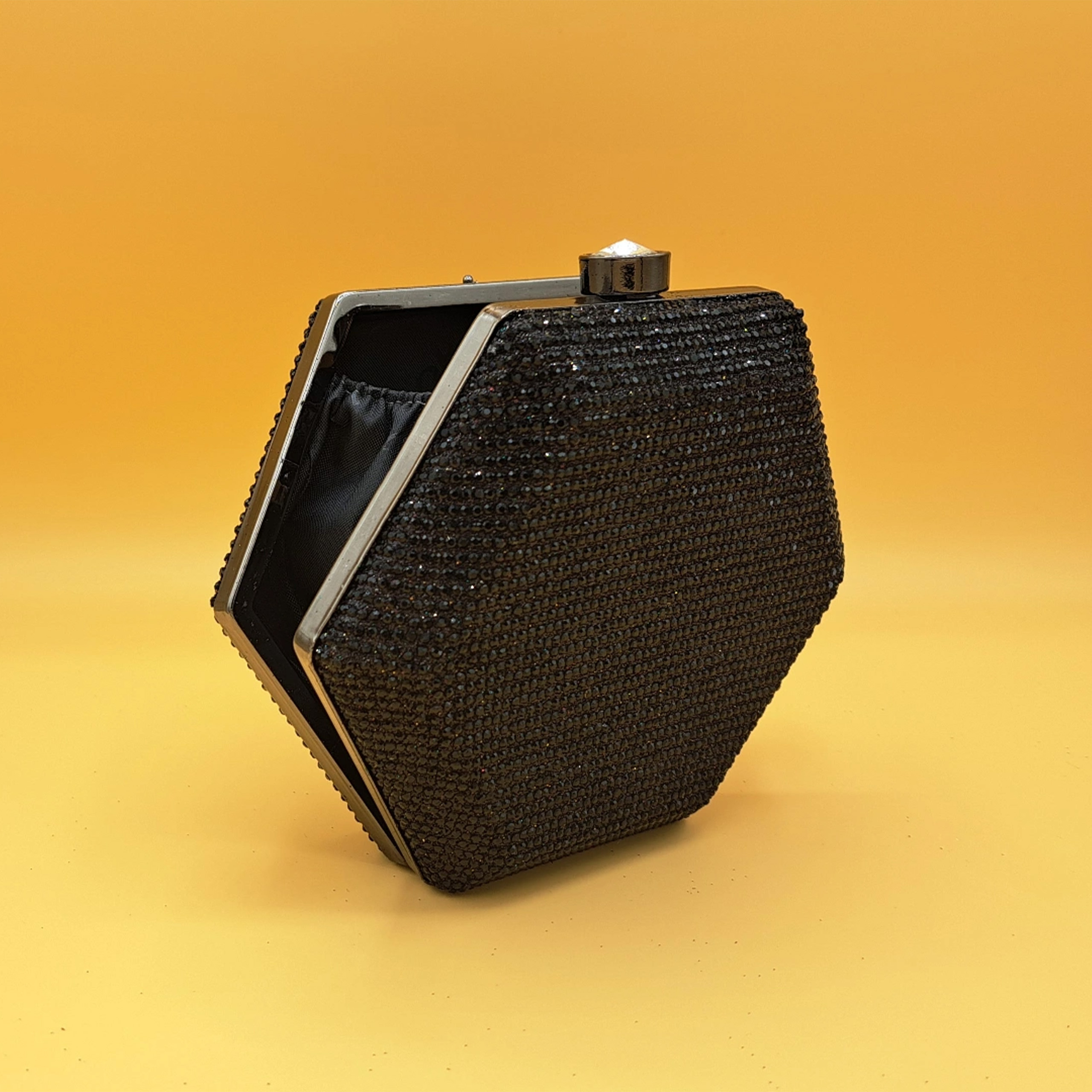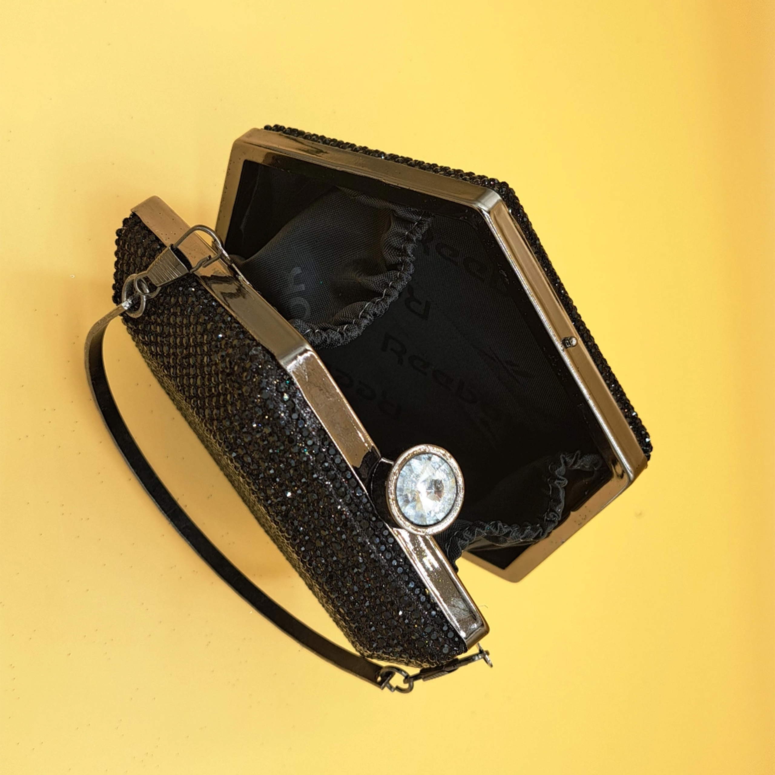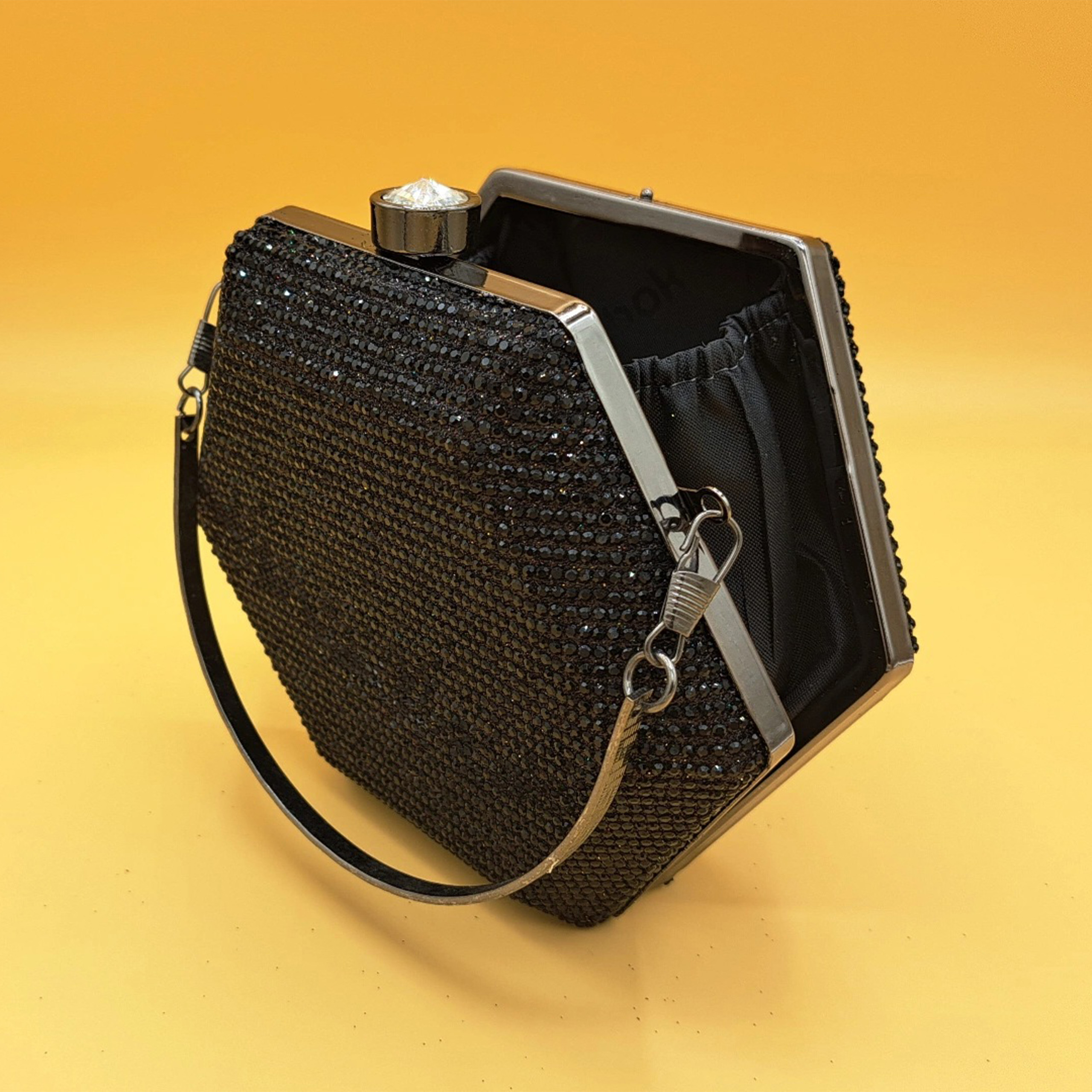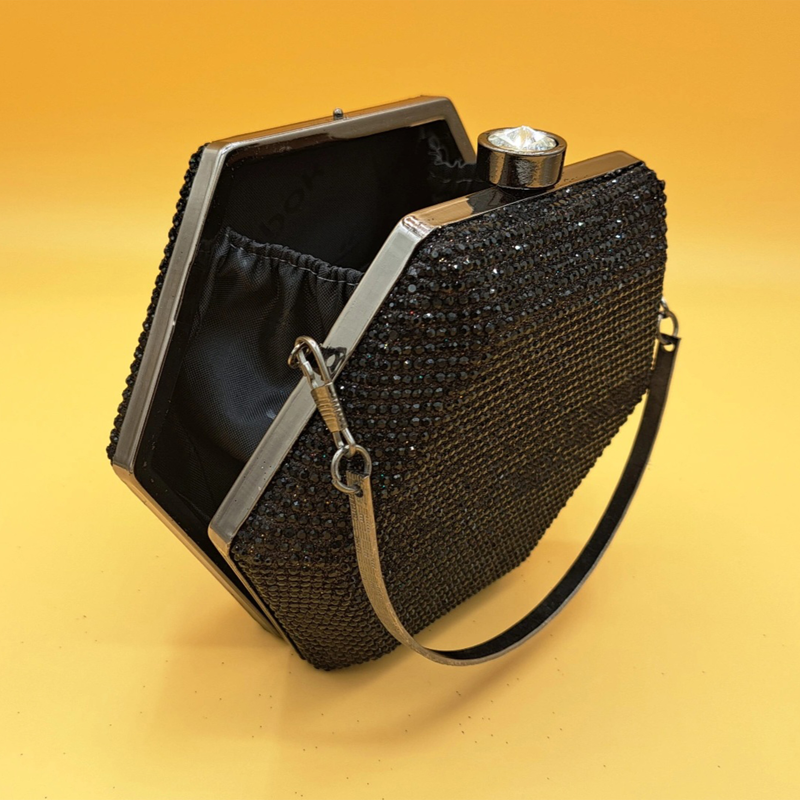 Materials: Hard-shell body, black crystal embellishments, and silver-toned metal frame.