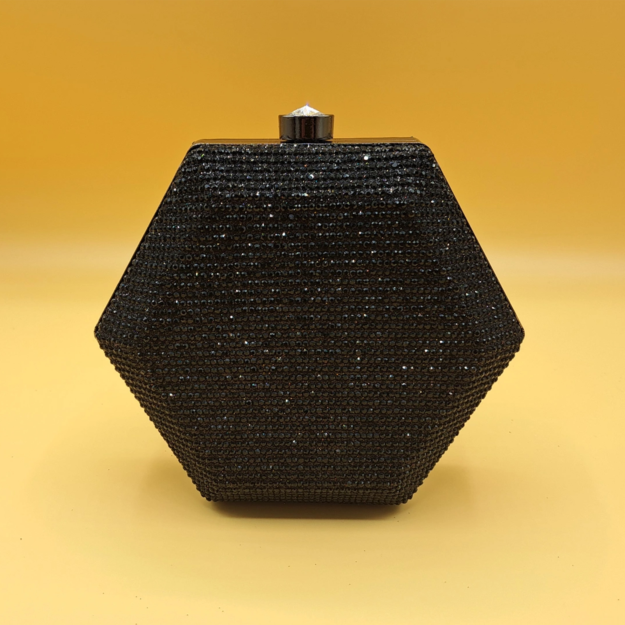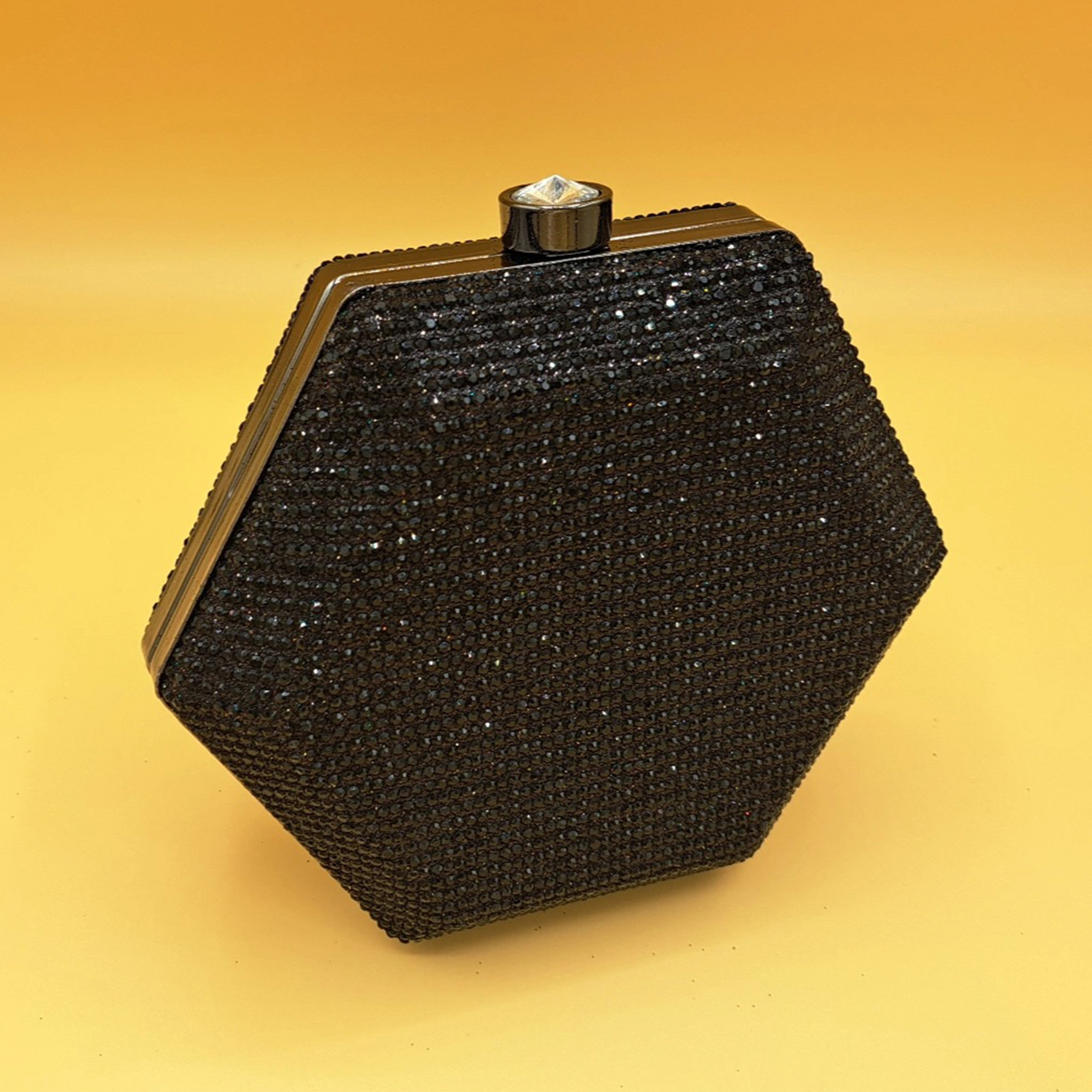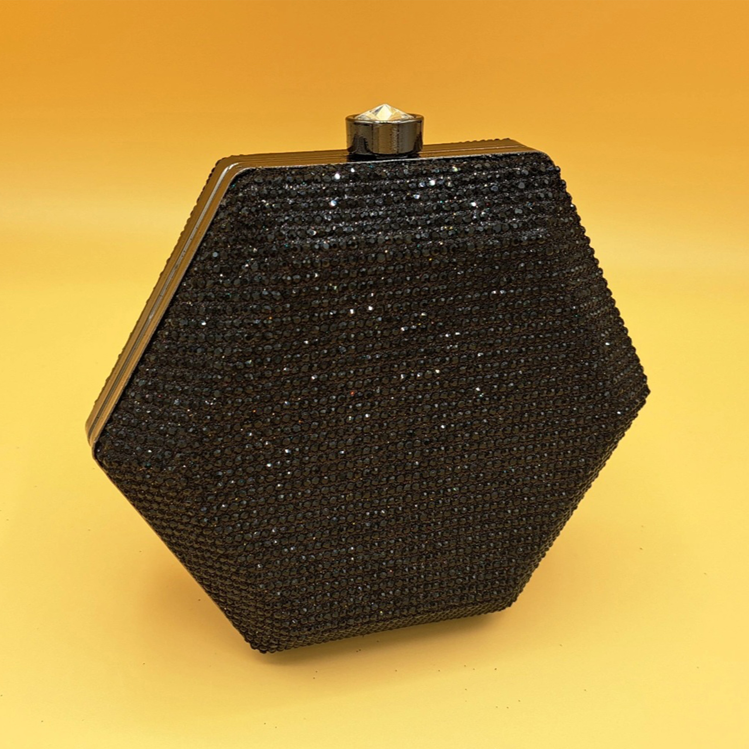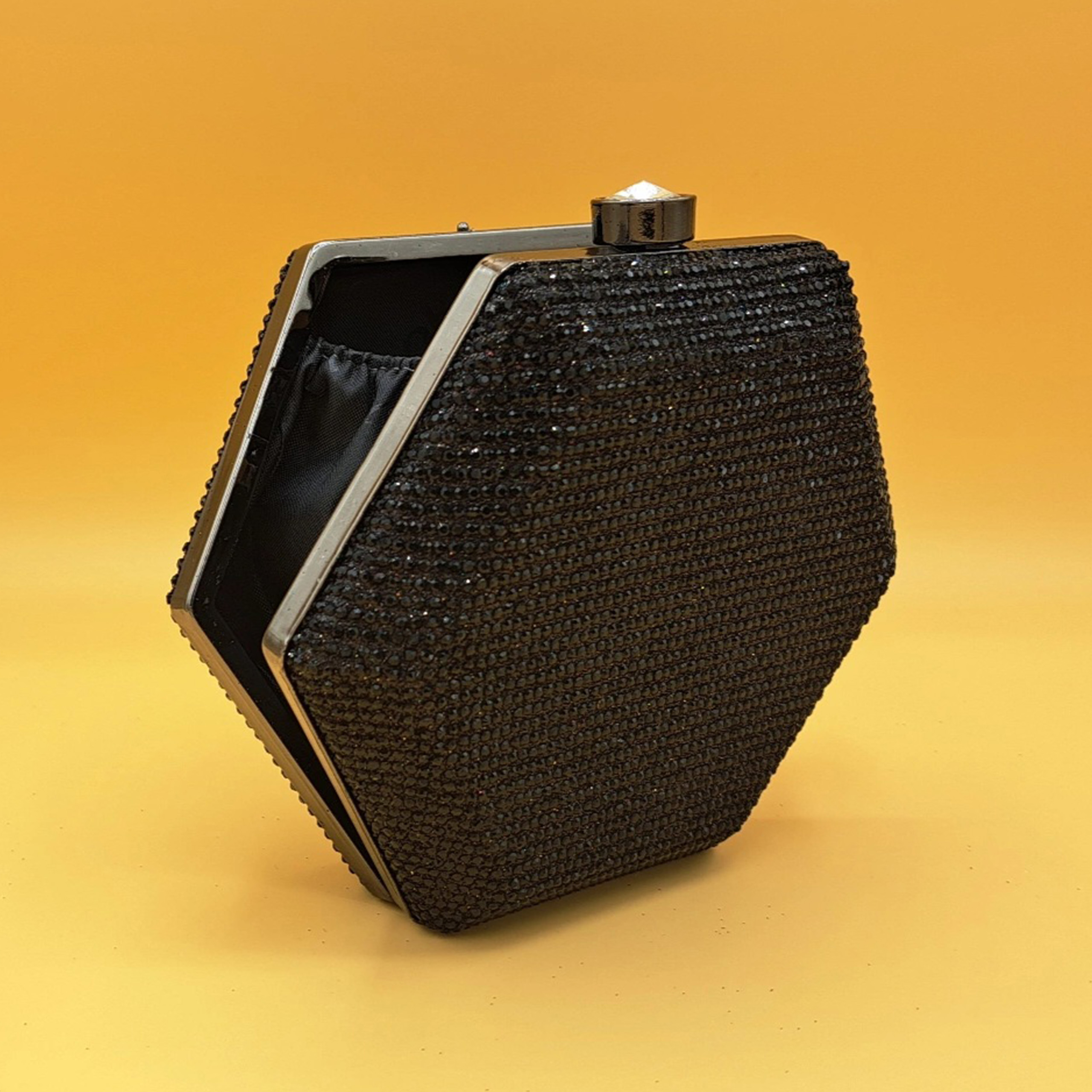 Materials: Hard-shell body, black crystal embellishments, and silver-toned metal frame.