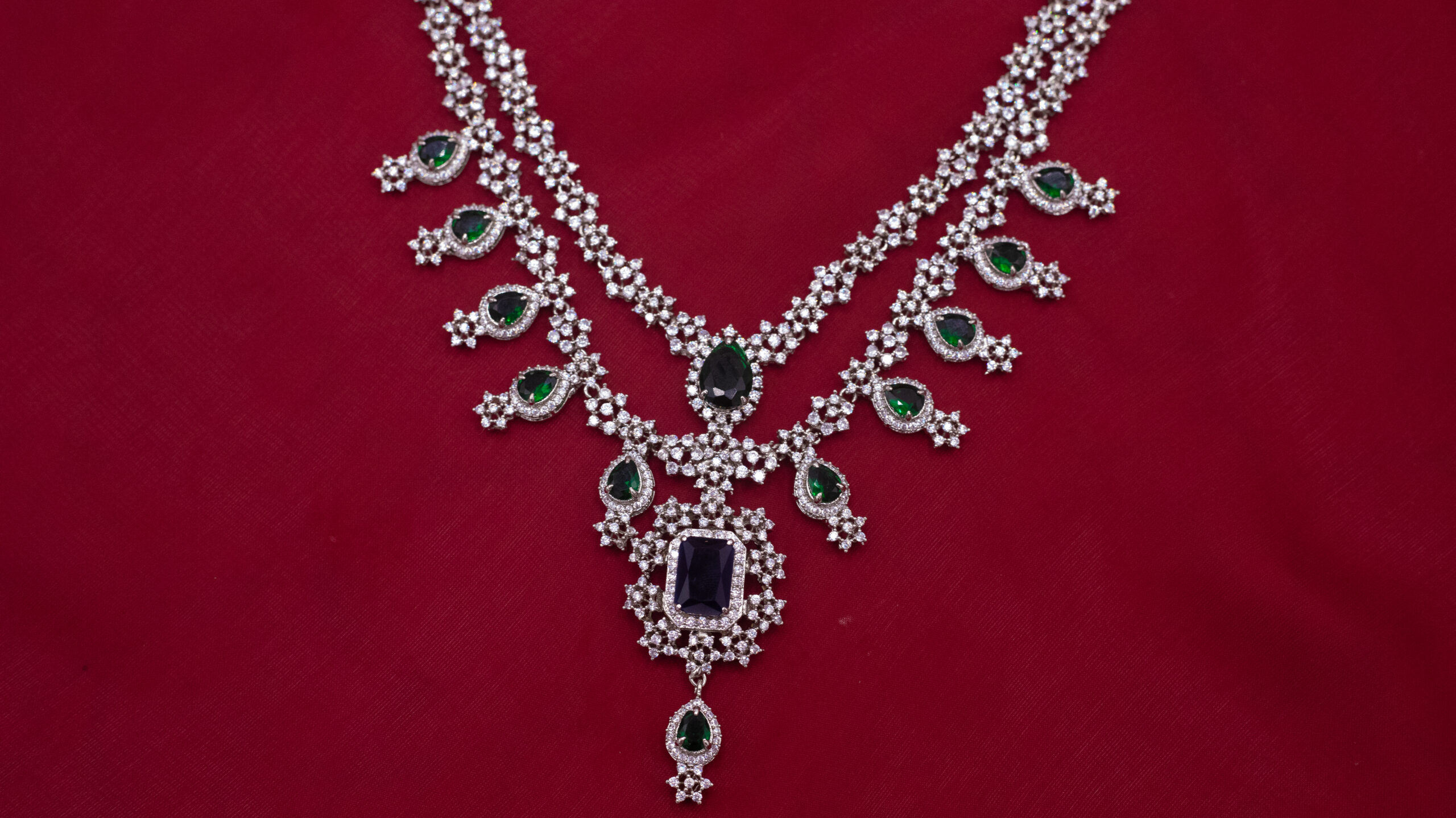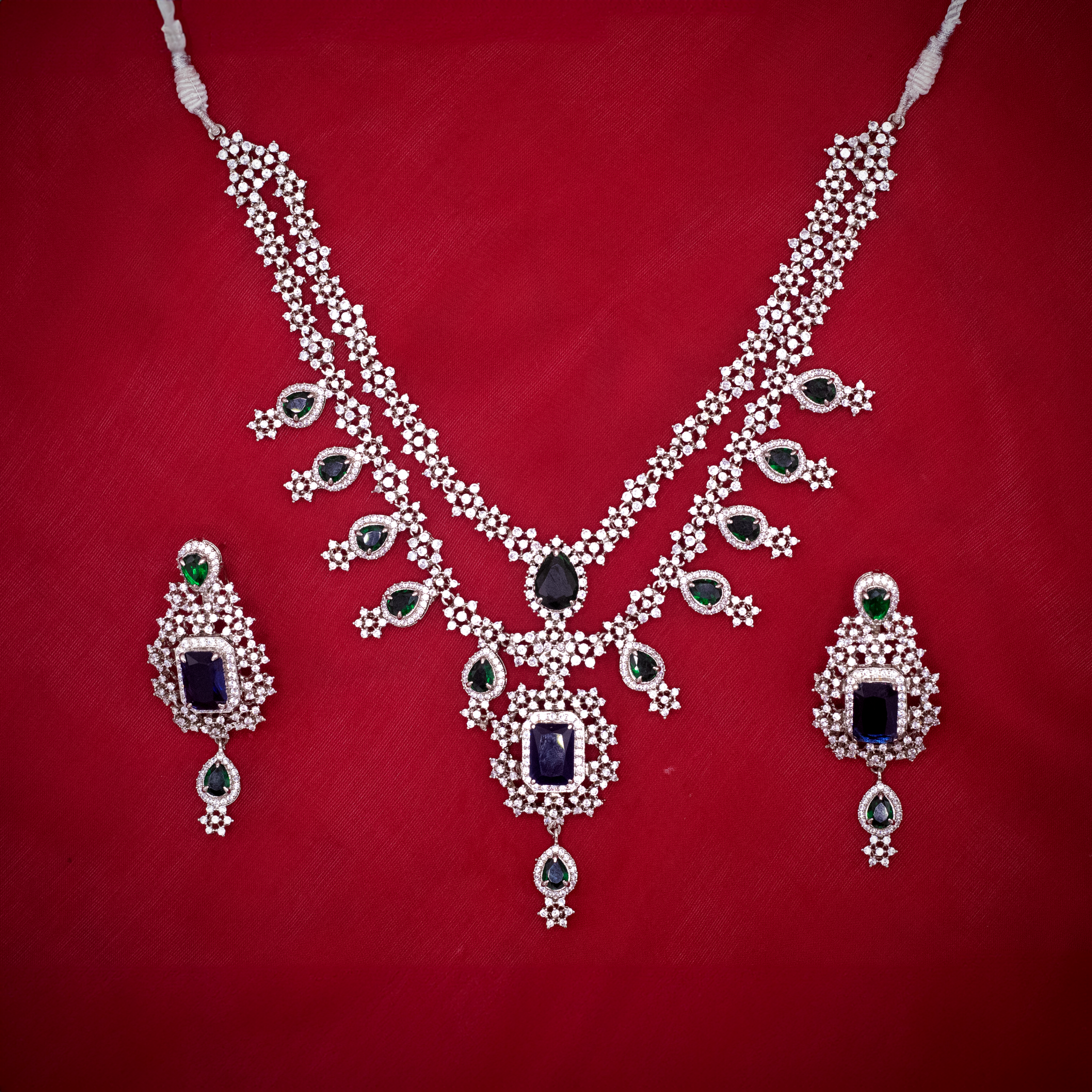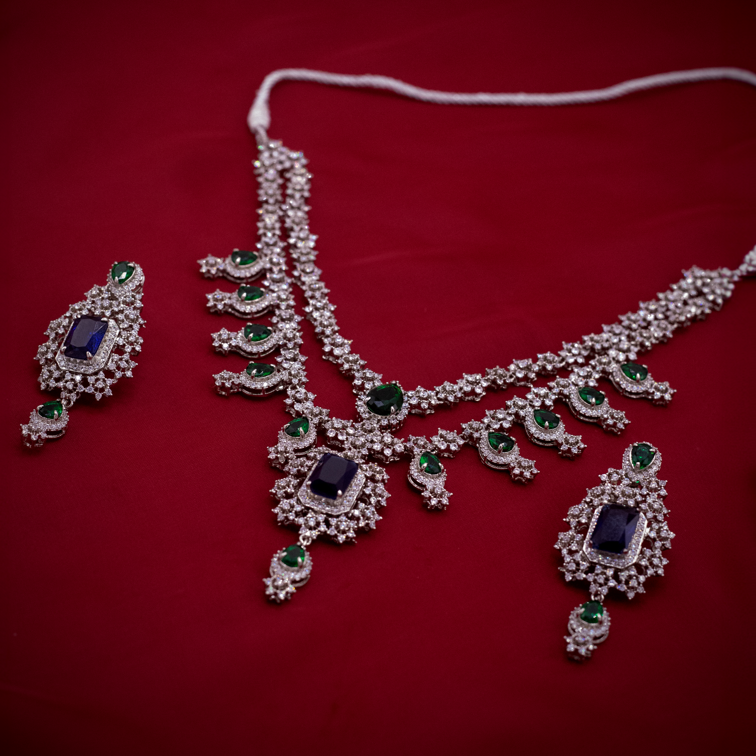 • Silver-plated handworked necklace finely embellished with real american zircon stones, center sapphire and emerald stones.