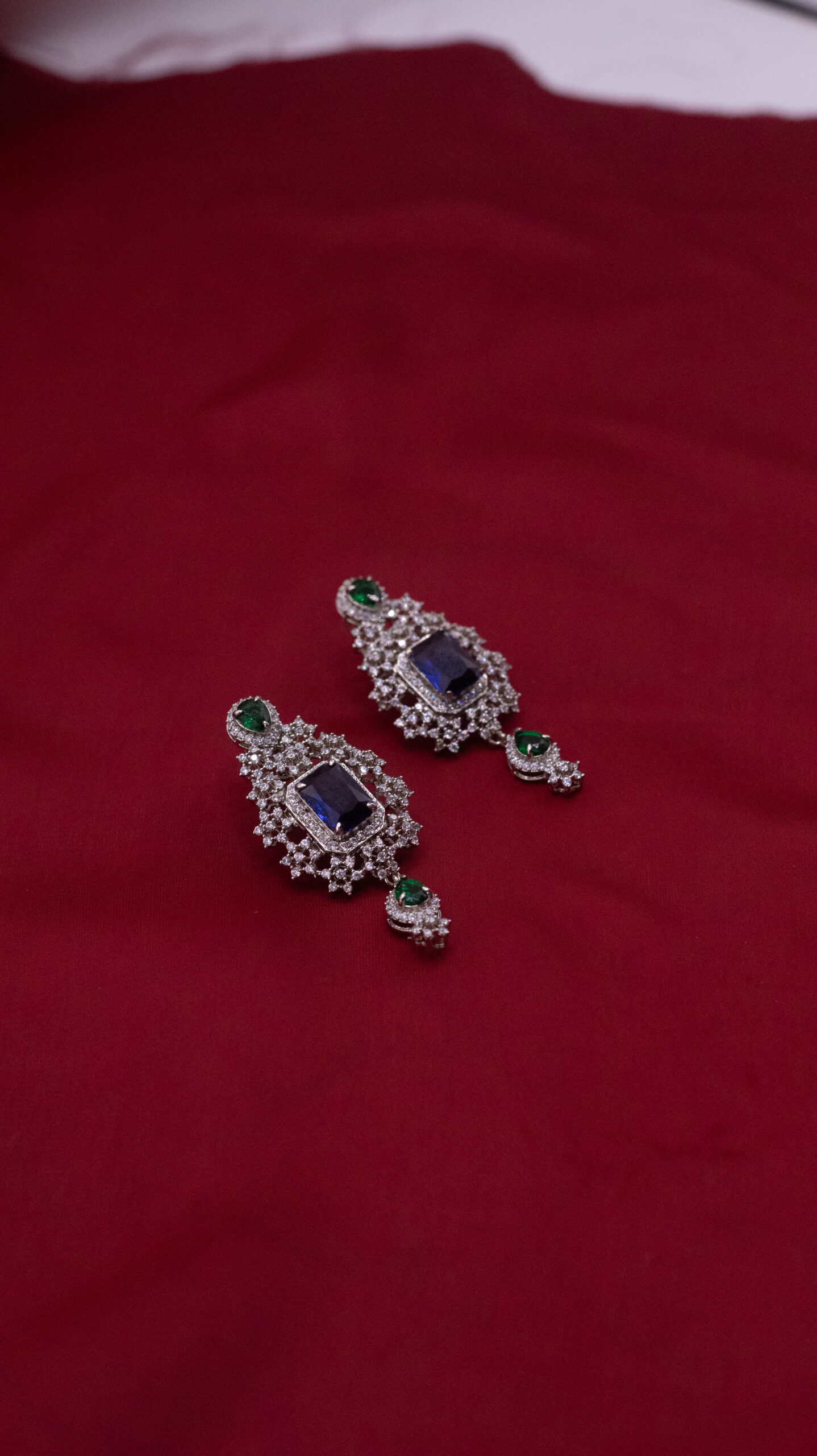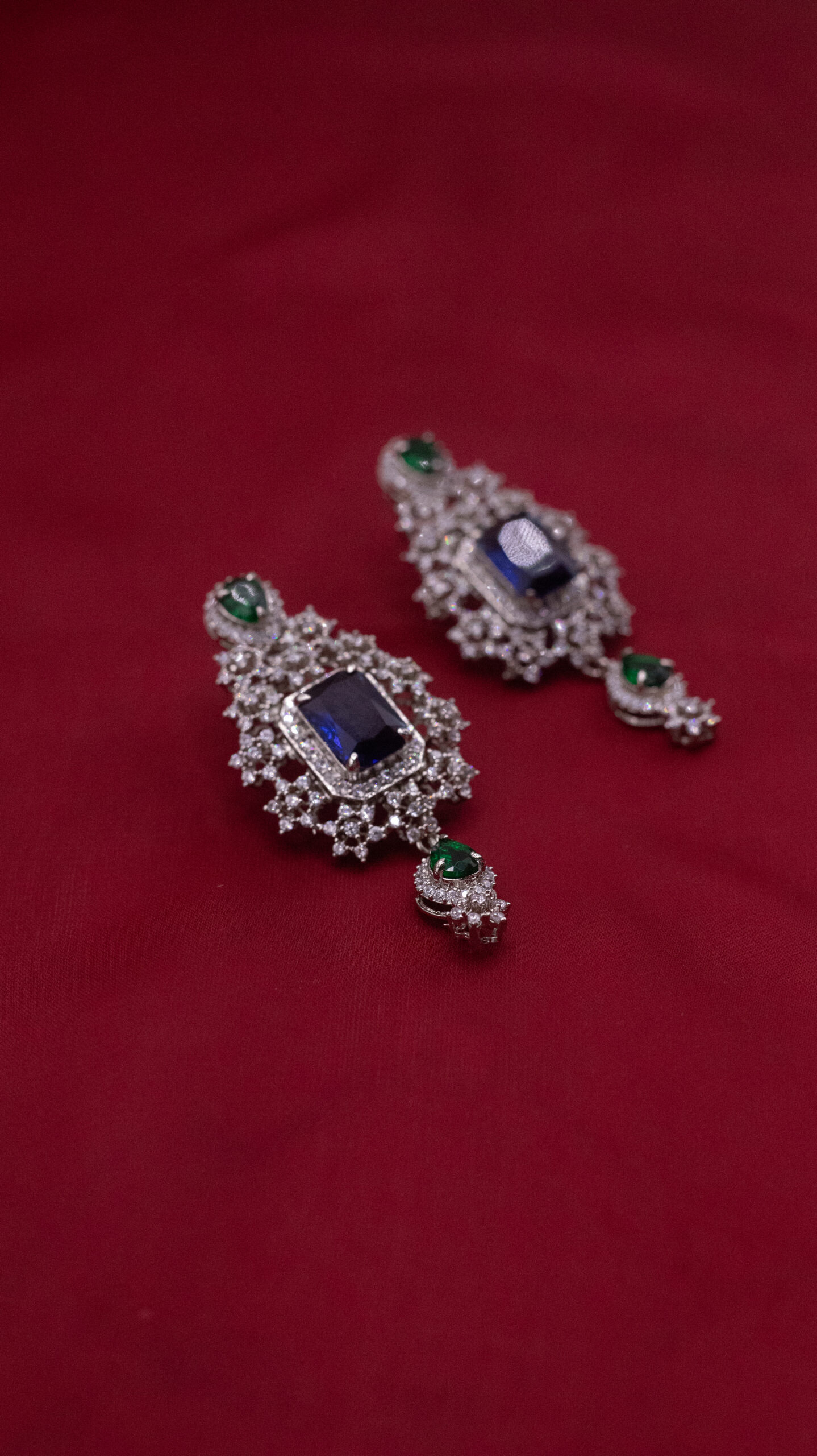 • Silver-plated handworked earrings finely embellished with real american zircon stones, center sapphire and emerald stones.