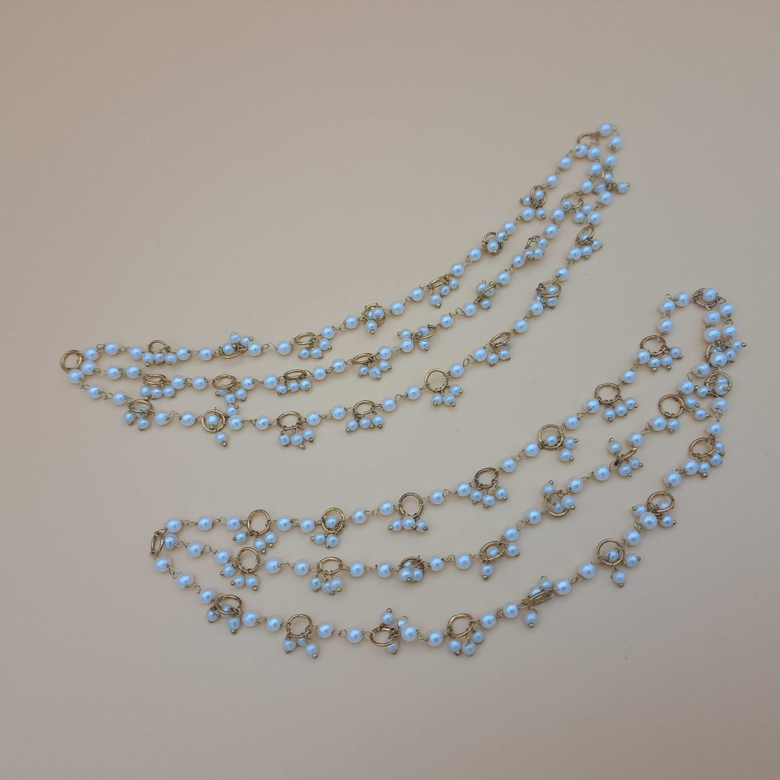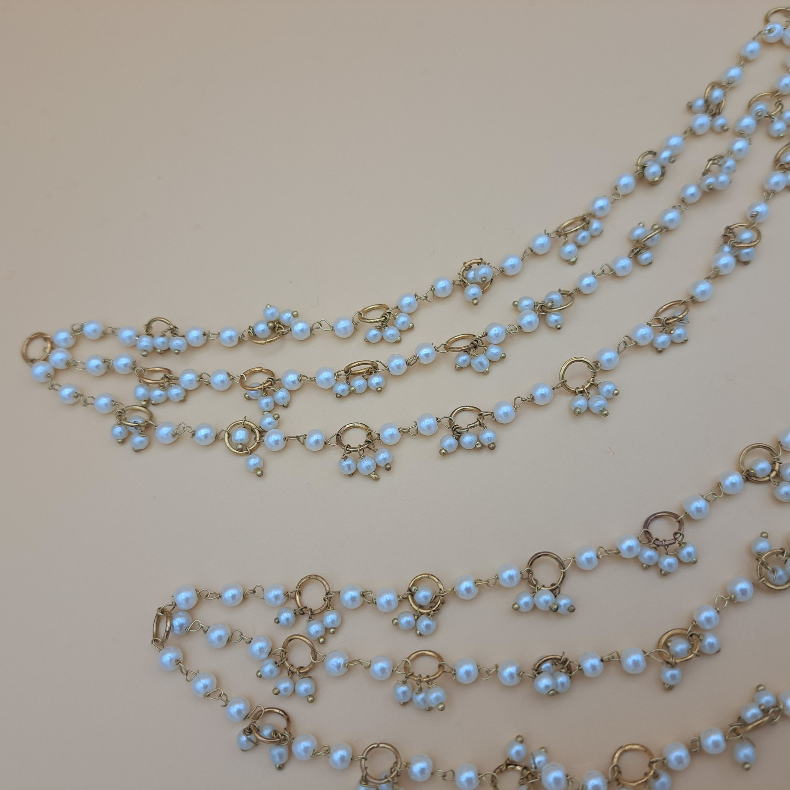 These delicate detachable earchains/saharas feature multiple strands of luminous faux pearls linked by small, gold-toned rings in a graceful cluster design. Ideal for supporting earrings and adding a touch of understated bridal elegance to any jhumka or studs