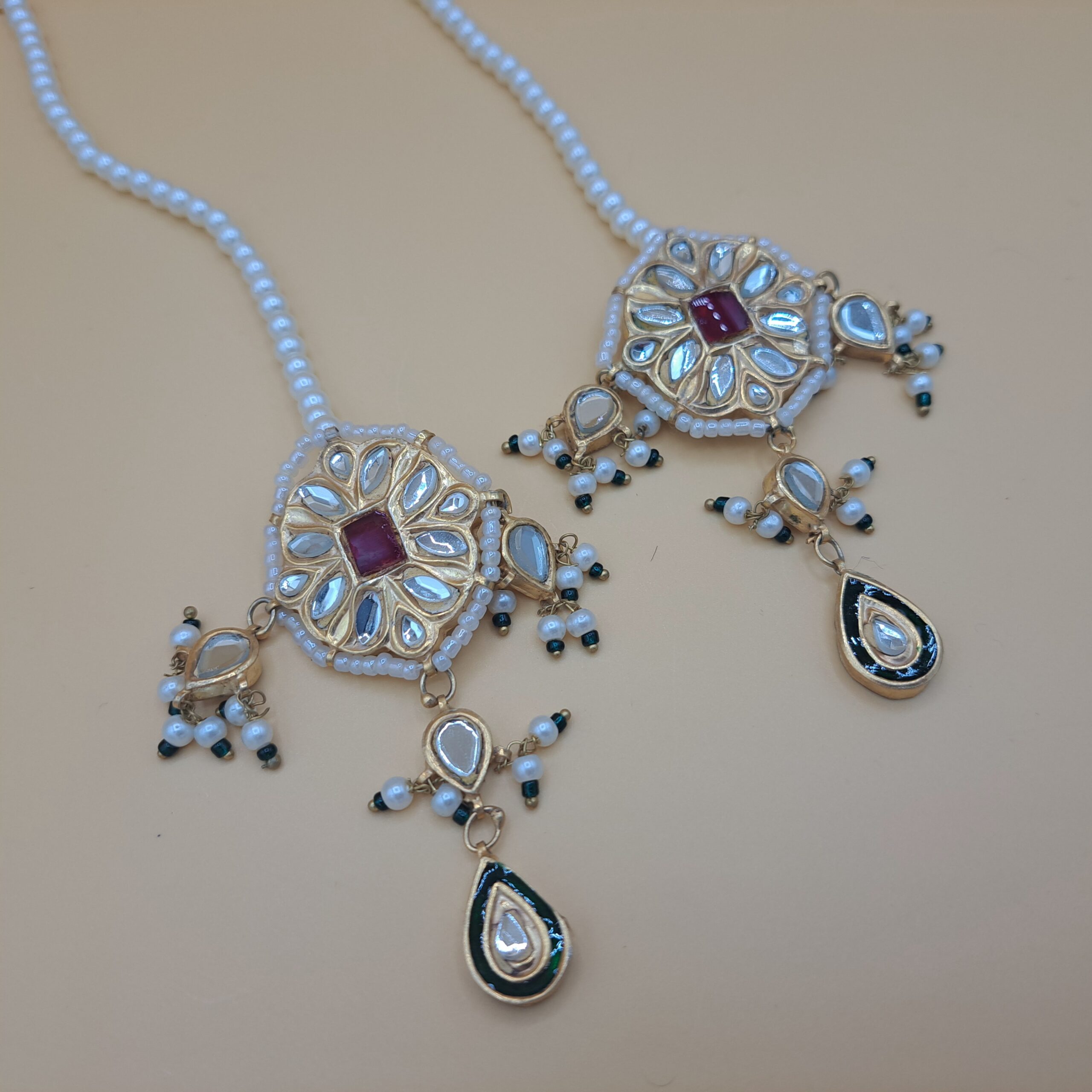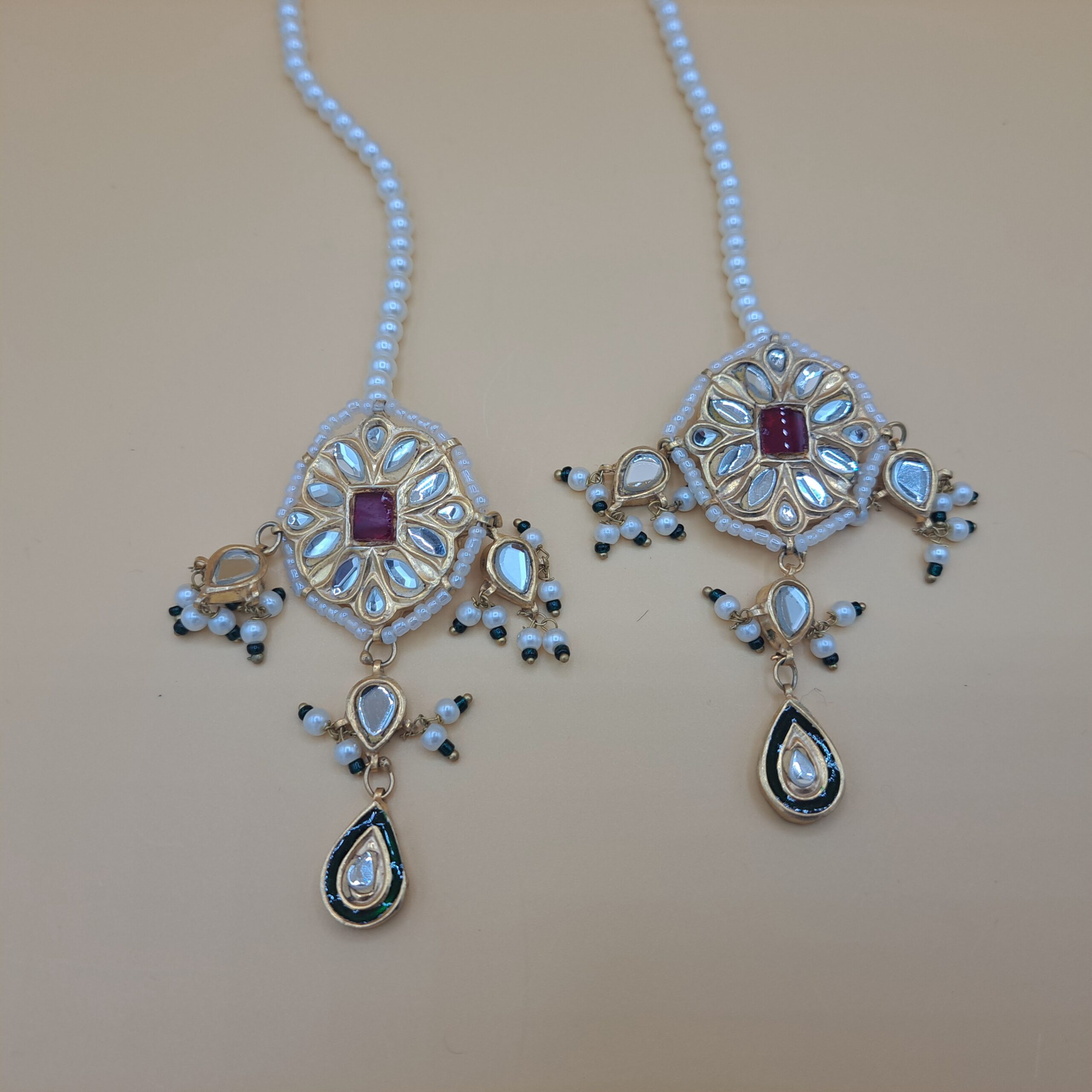 Gold-plated handworked kundan earrings embedded with centre ruby stones and embellished with pearls.