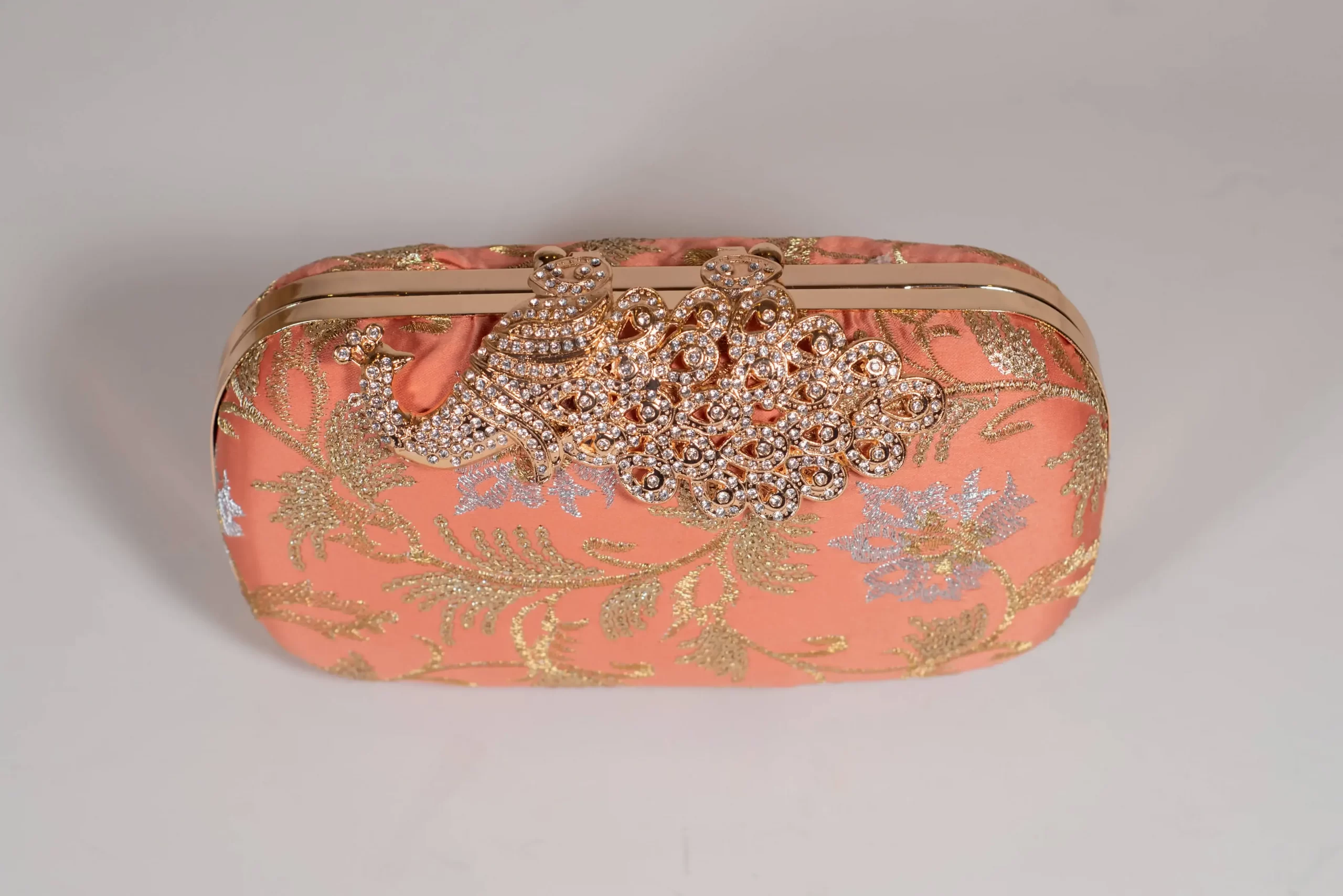 Alluring embroidered tea pink embellished clutch with an interlocking clasp, gold-based chain, and satin interior along with an embellished decorated peacock-shaped knob.