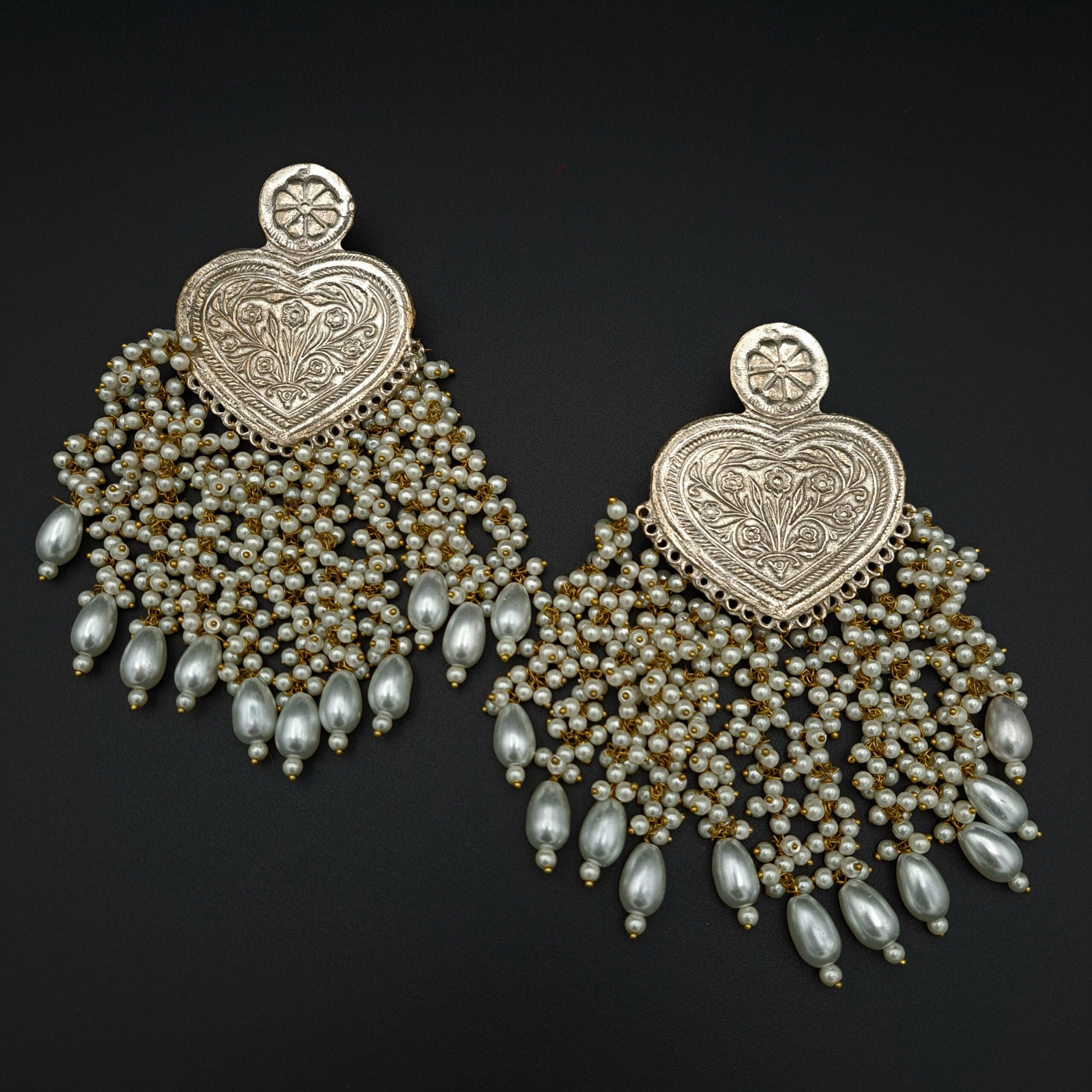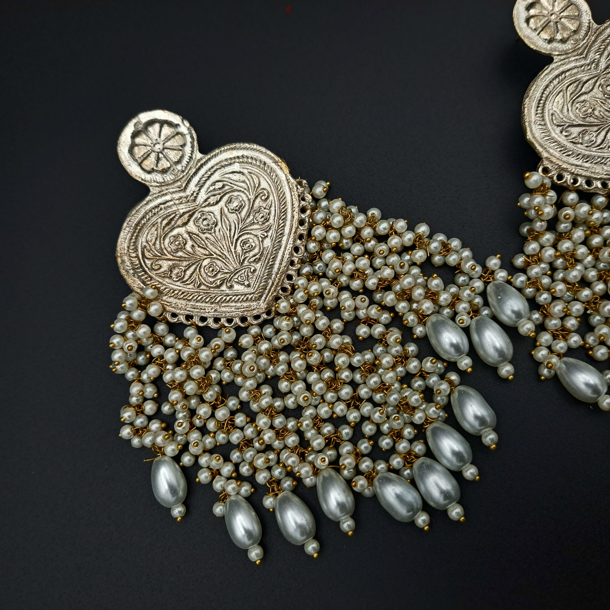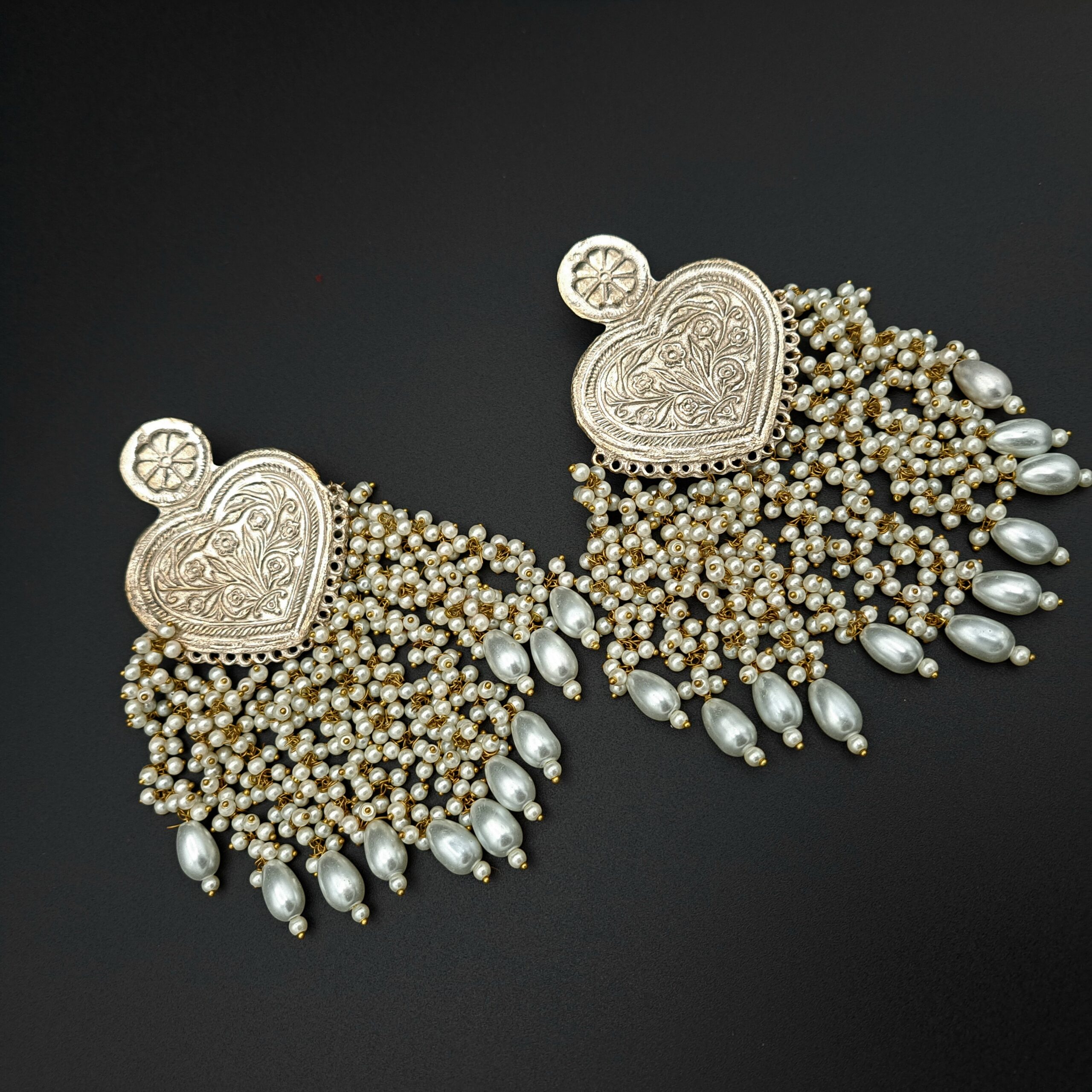 Bold and beautiful antique silver earrings. The decorative heart shield anchors a breathtaking waterfall of luminous pearls (moti), giving you an instant, festive, and traditional look.