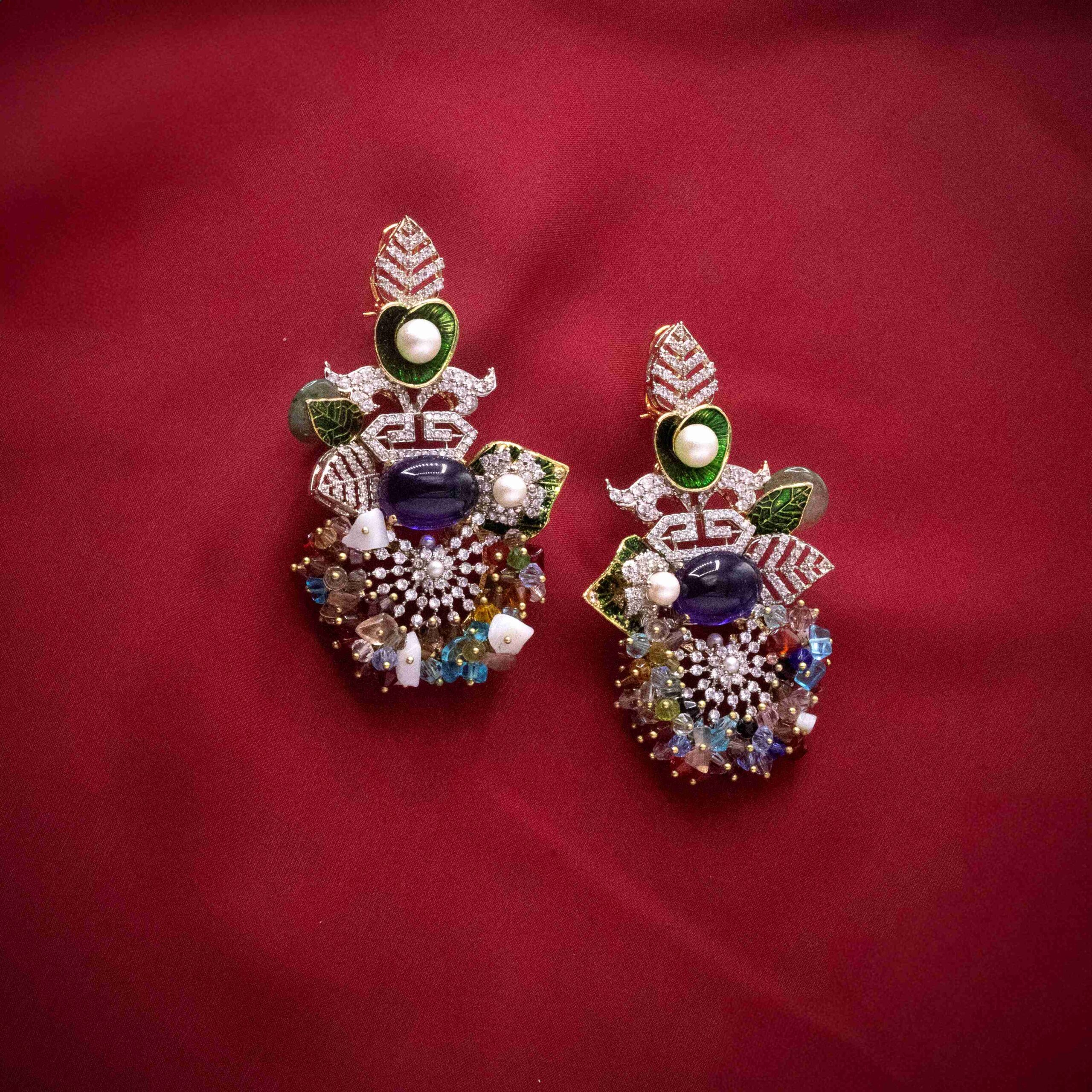 • Silver-plated handworked earrings embellished with real american zircons, sapphire blue stones and custom shaded cut pearls.