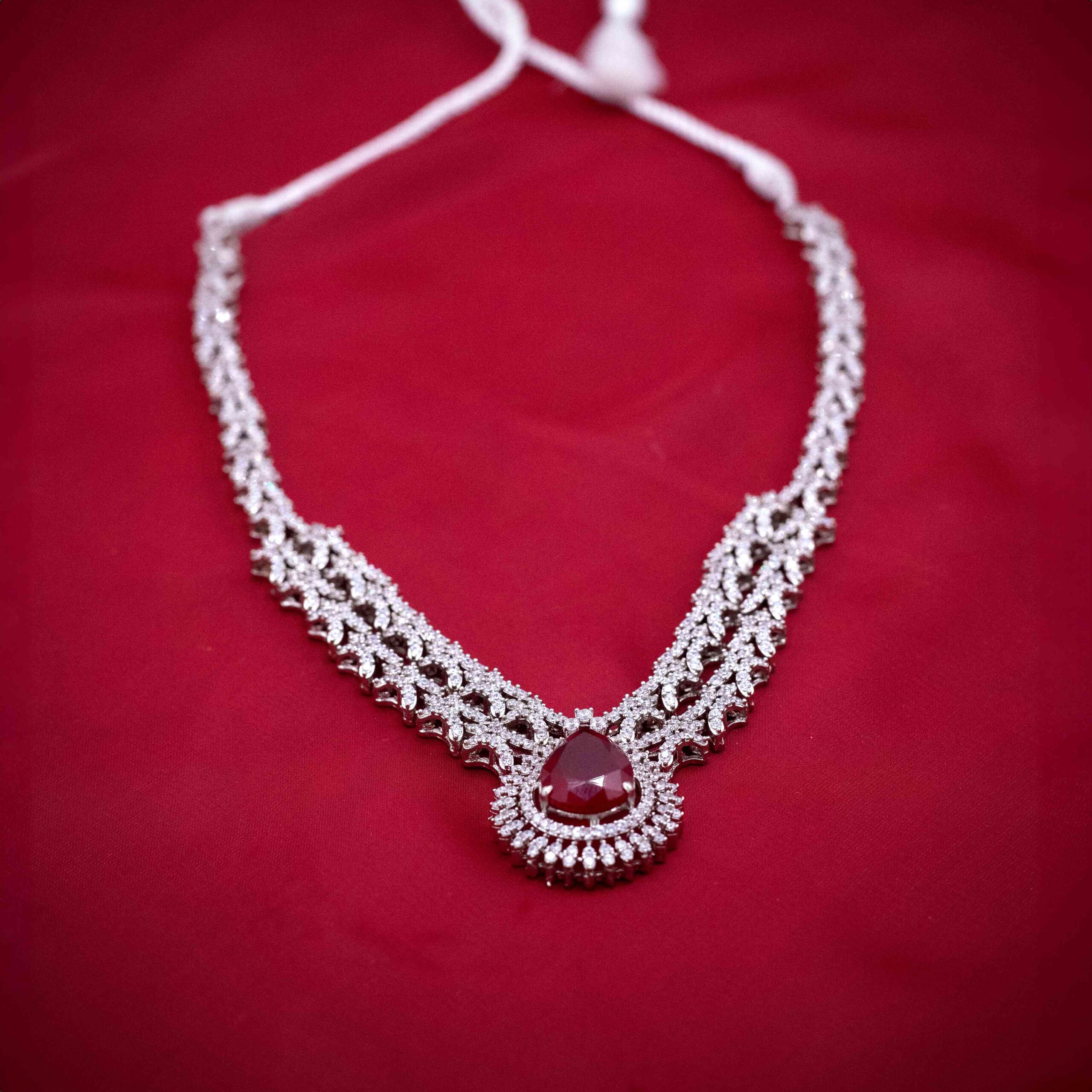 Silver-plated handworked necklace finely embellished with real american zircon stones with center ruby stones.