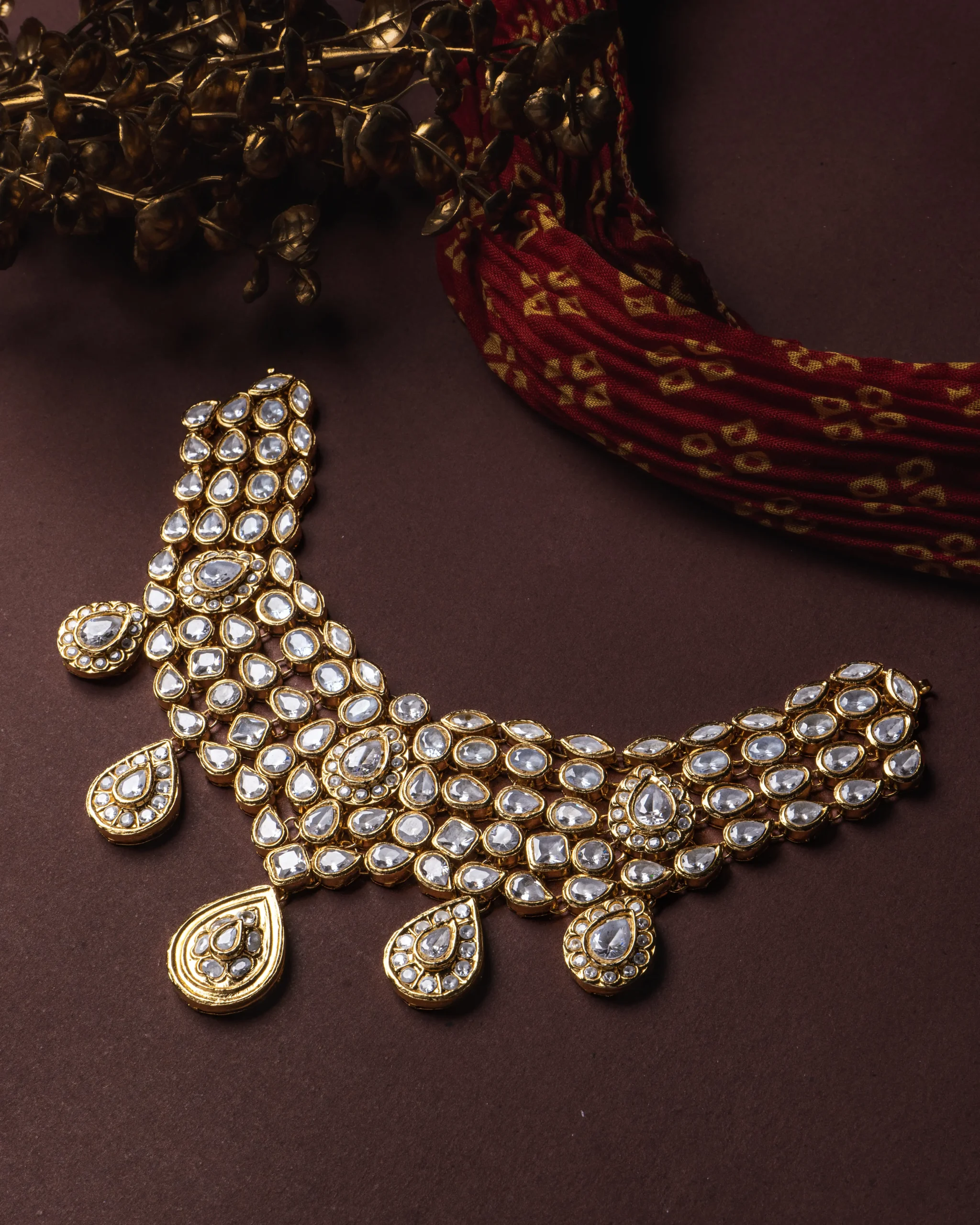 For customizations for the Neckpiece in terms of stone color and pearl color, please add details in additional notes before confirming the order.