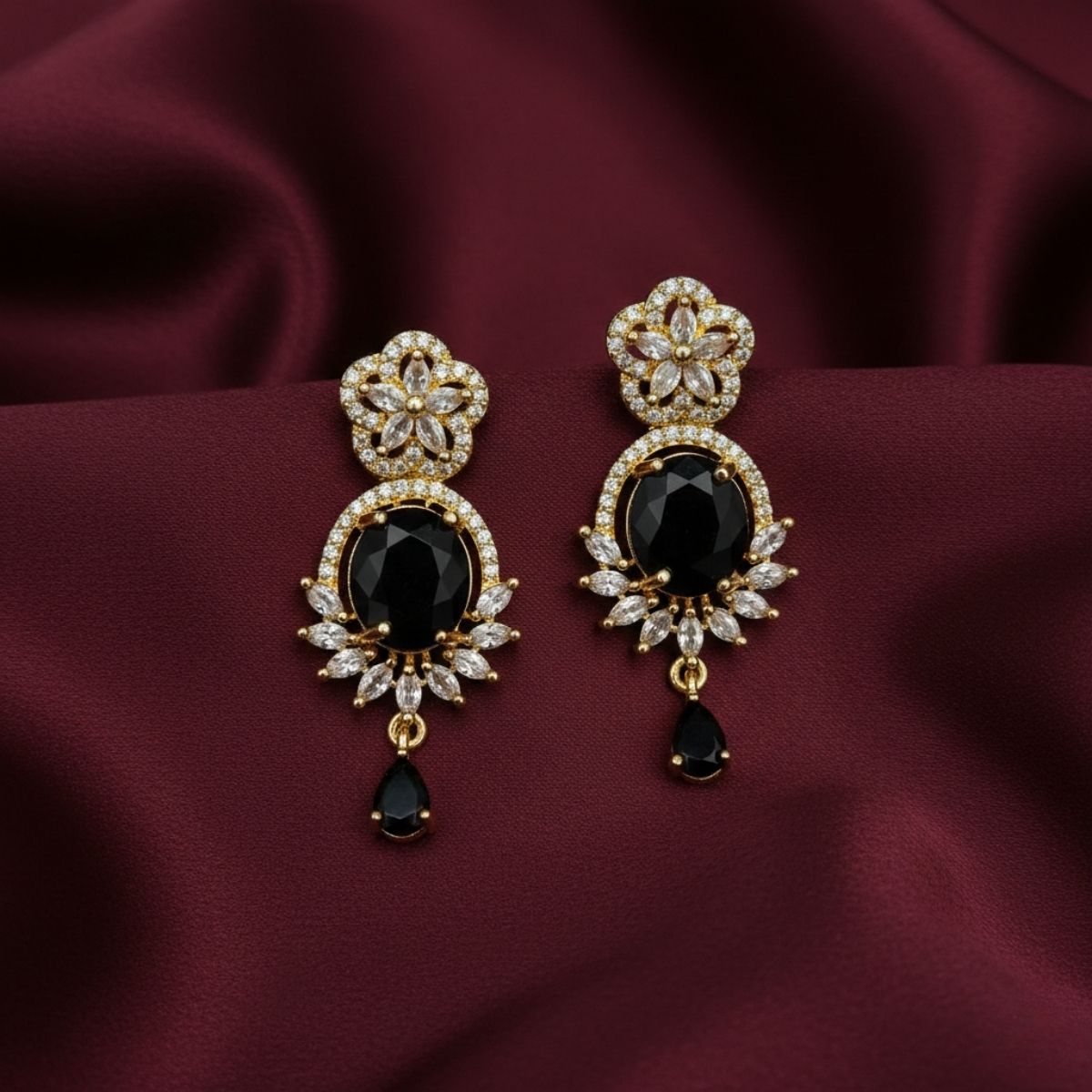 A delicate, gold-plated floral stud embellished with shimmering crystals and a centre black stone, which leads into a bold, regal centerpiece. Perfect for weddings.