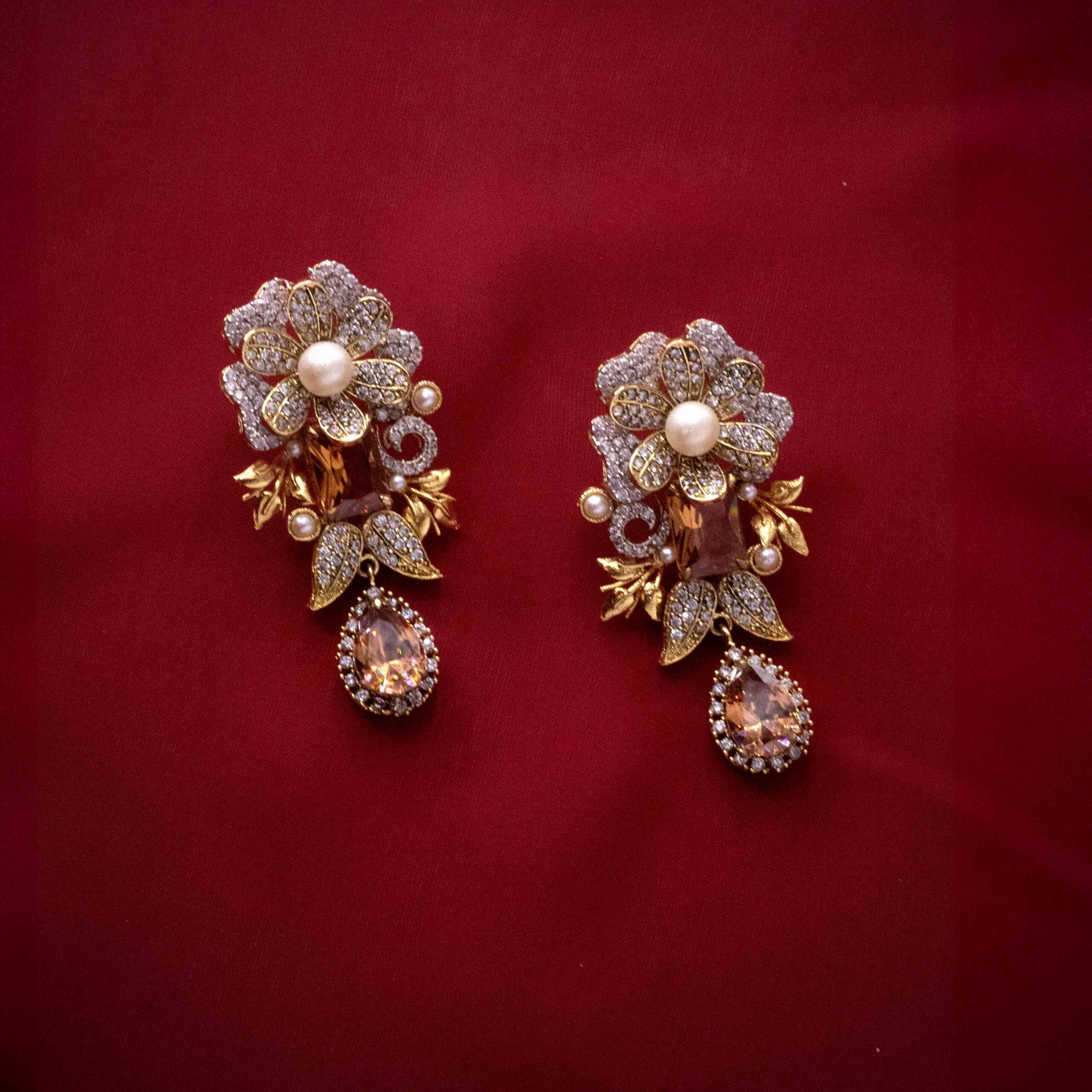 Gold-plated handworked earrings embellished with real american zircon stones and champagne stones.
